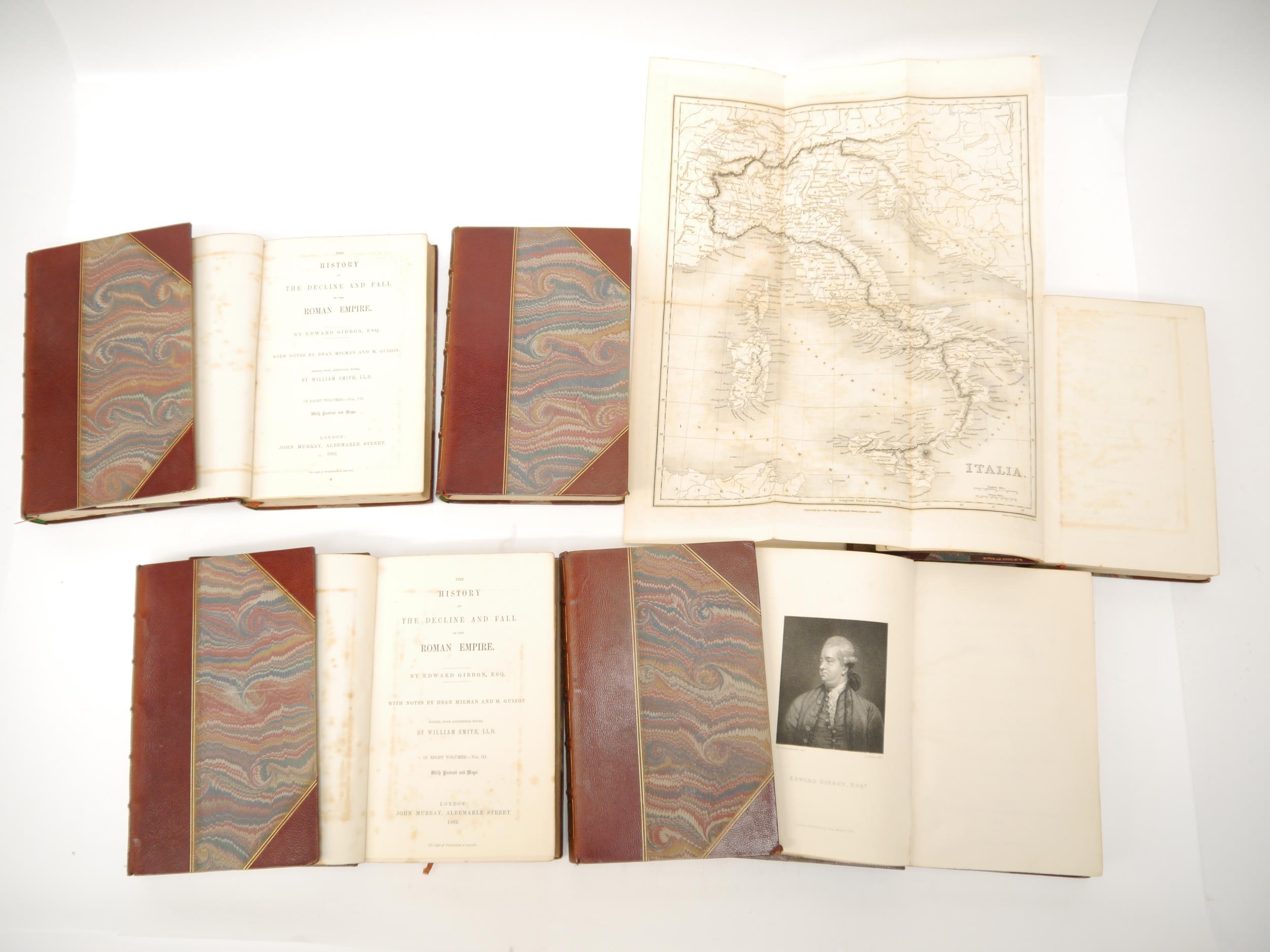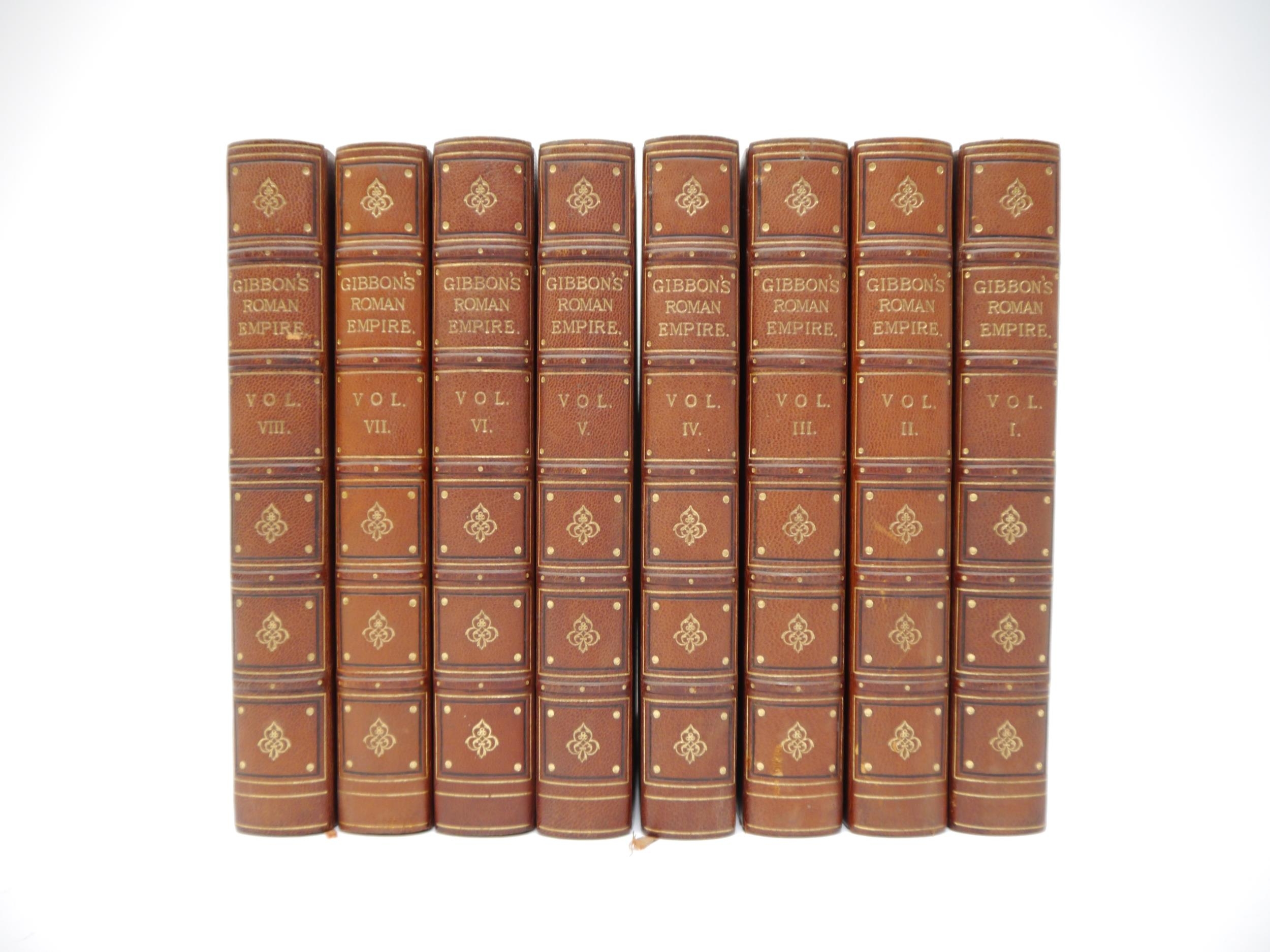 (Bumpus Binding), Edward Gibbon: 'The History of the Decline and Fall of the Roman Empire', London, John Murray, 1862, 8 volumes, engraved portrait frontis + 14 engraved maps (of which 12 folding and 2 single page) as called for, uniform fine three quarter morocco gilt by Bumpus Ltd, Oxford, spines gilt in compartments, all edges gilt, marbled paper covered boards and endpapers/pastedowns. An attractive set of Gibbon's opus (8)