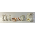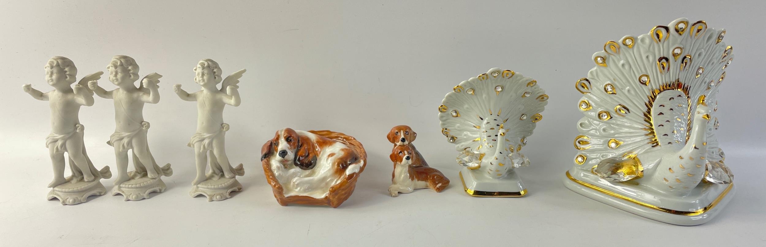 A small collection of decorative items to include a vintage ROYAL DOULTON beagle in a basket (10cm wide), a pair of BESWICK puppies (6cm tall), 3 cherubs and 2 gilded swans one 16cm tall the other 12cm both set with clear stones
