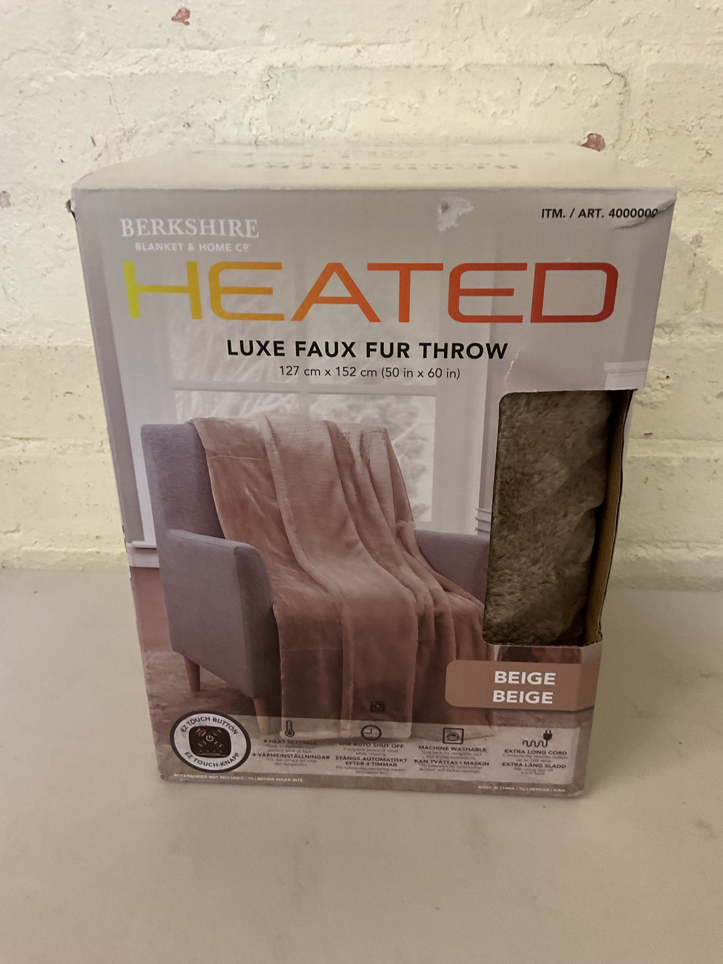 BOXED BERKSHIRE LIFE HEATED LUXE FAUX FUR THROW IN BEIGE 127CM X 152CM
