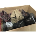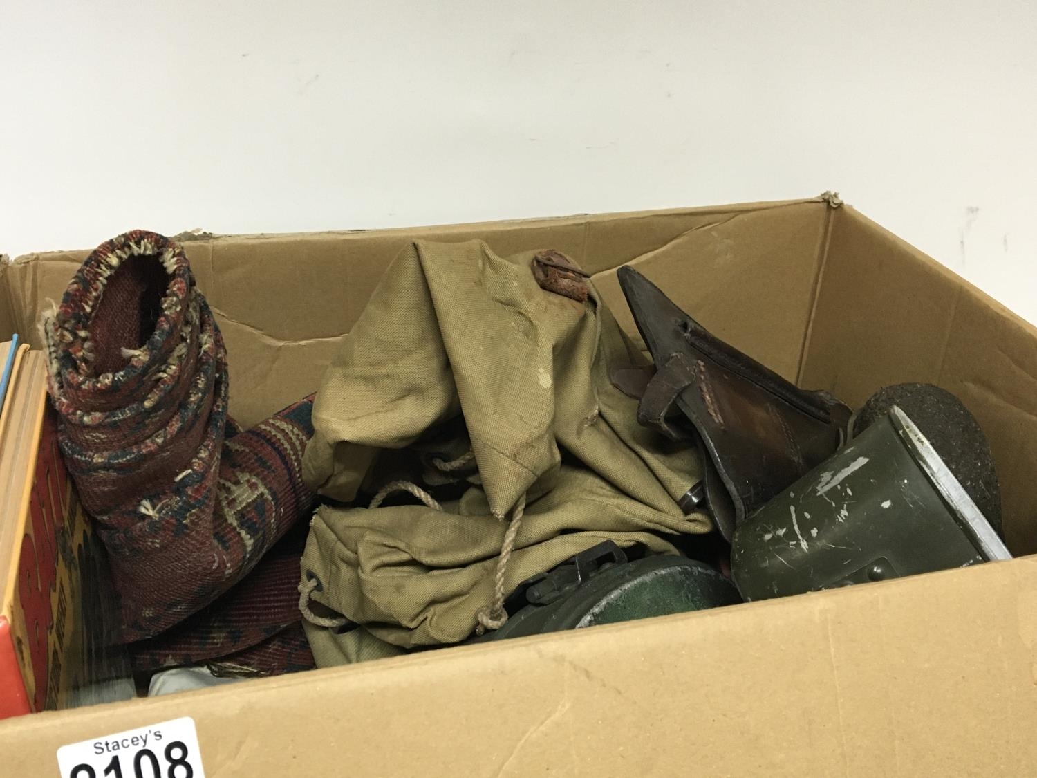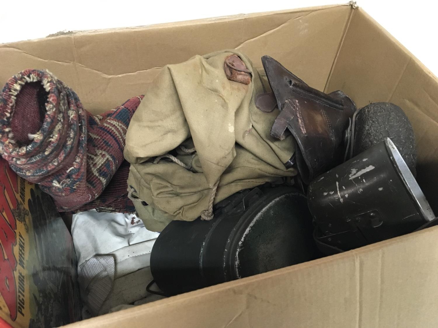 A box containing military items and other oddments a leather pistol case tins bags and vintage books a small Afghan rug.