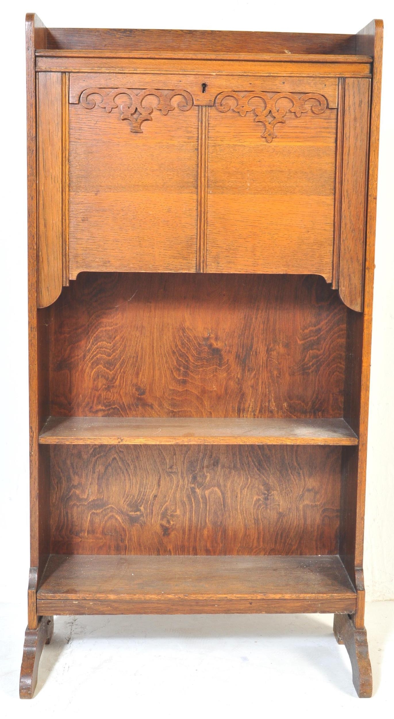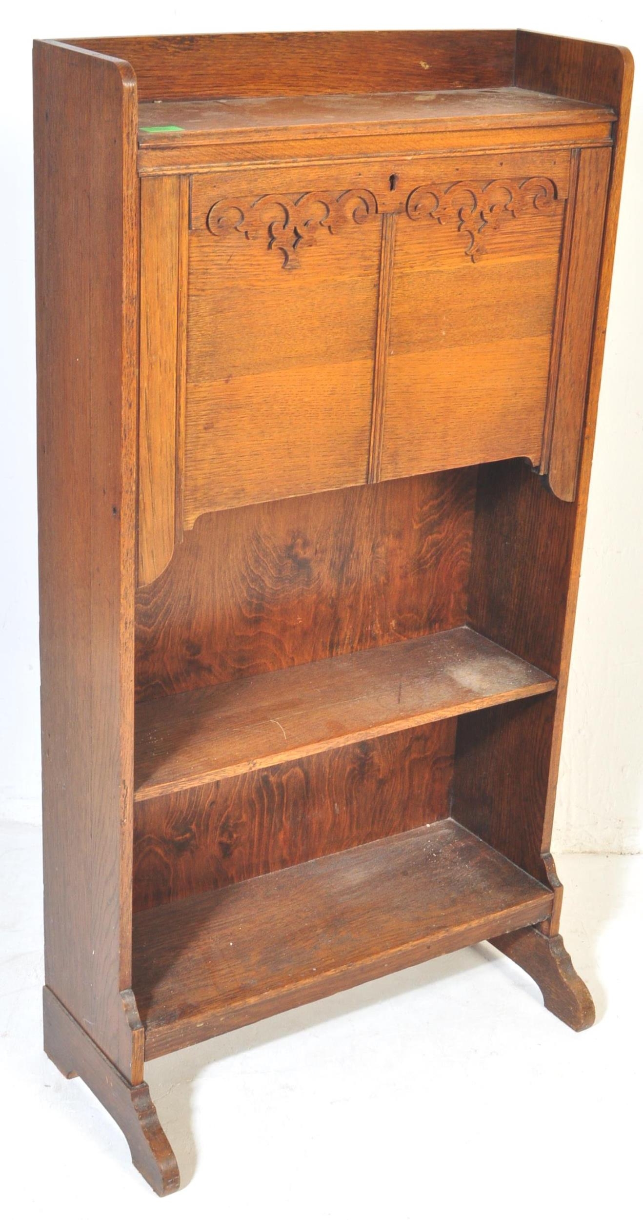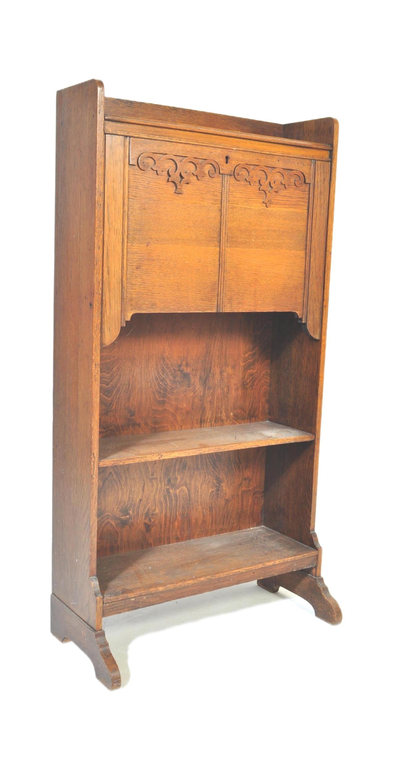 A vintage early 20th Century Arts & Craft circa 1930s oak bureau student bookcase. Of rectangular form with gallery back carved wood front drawer atop two shelves with trestle supports. Measures approx. 118cm x 62cm x 31cm.