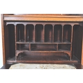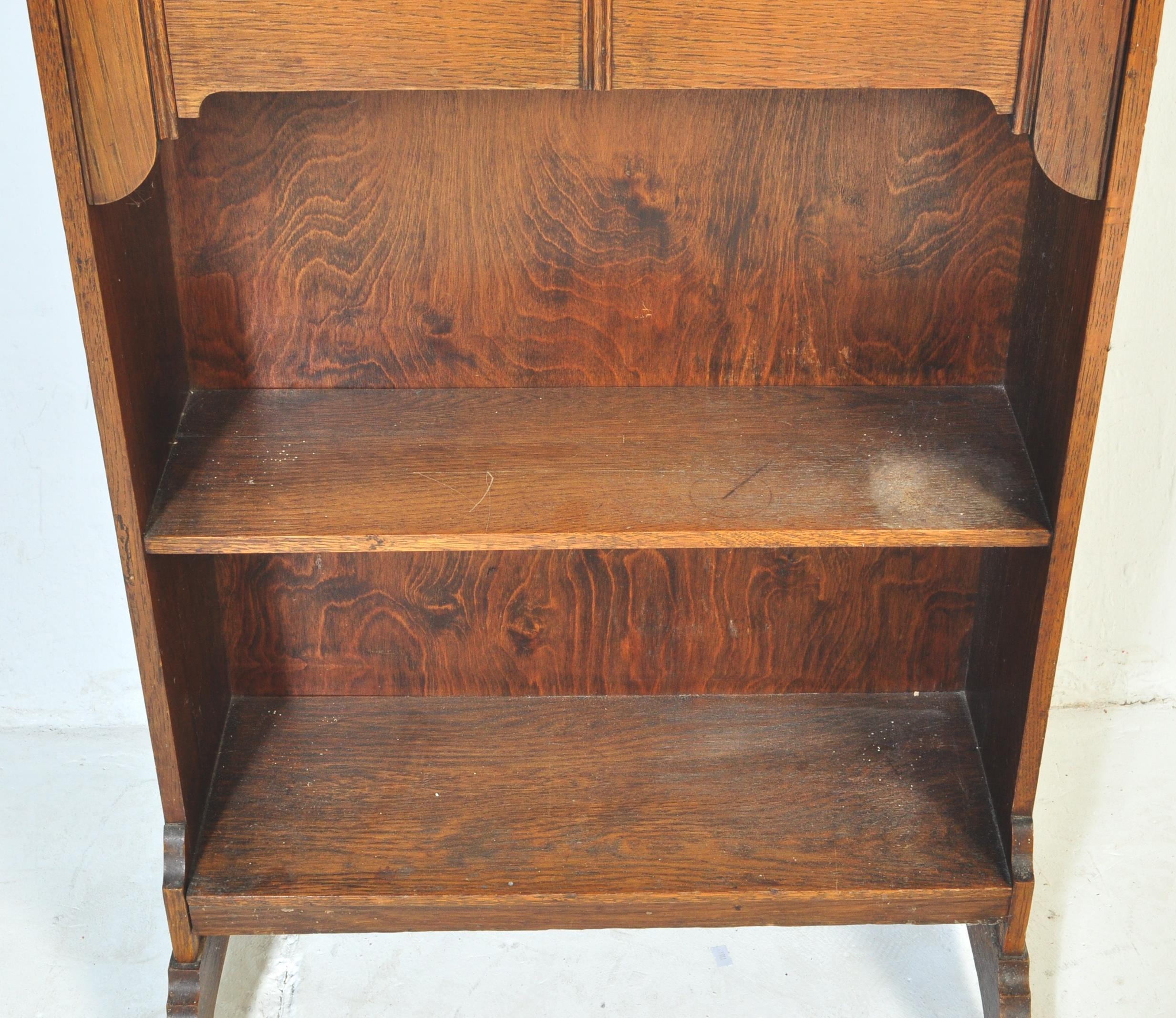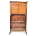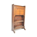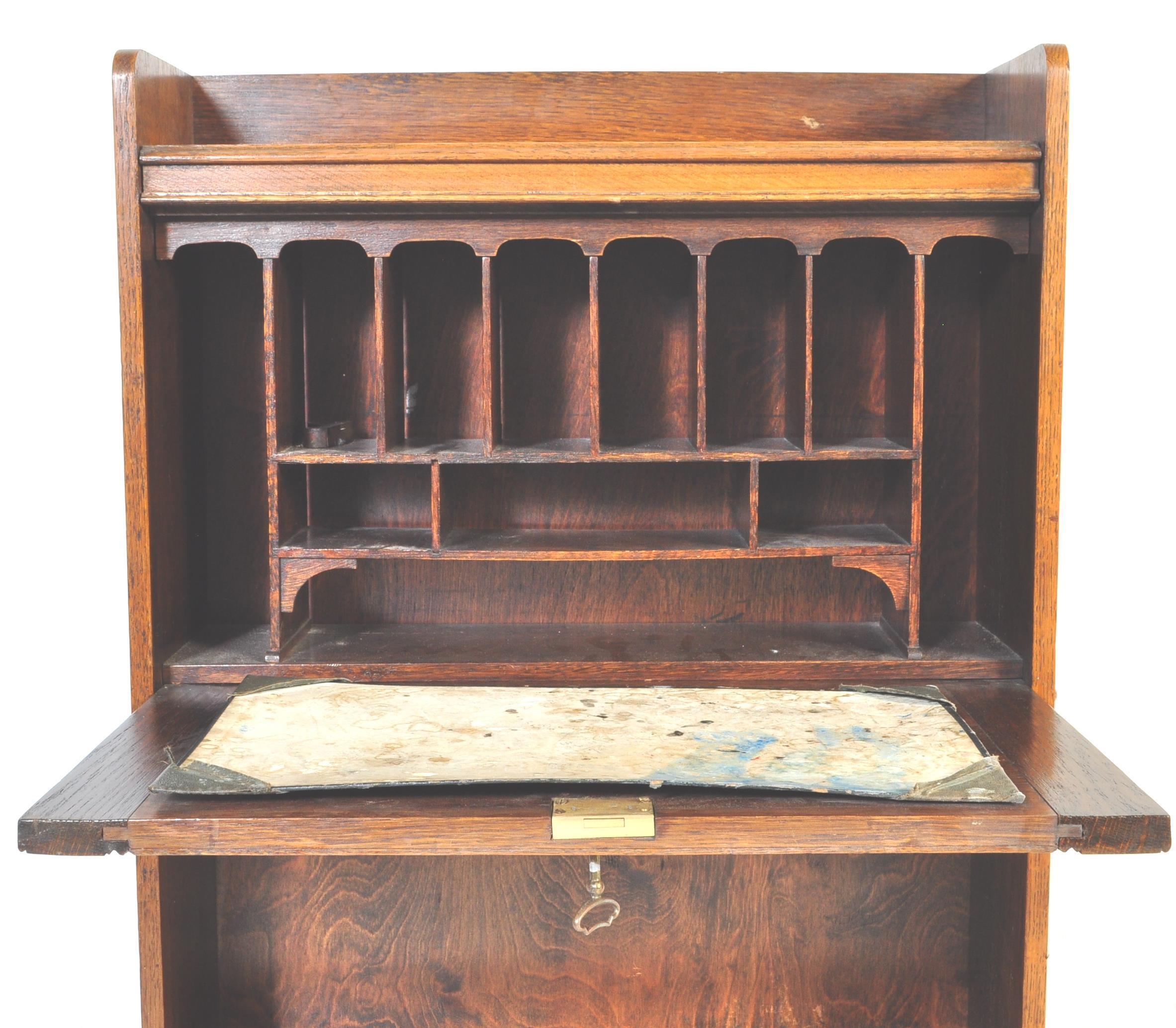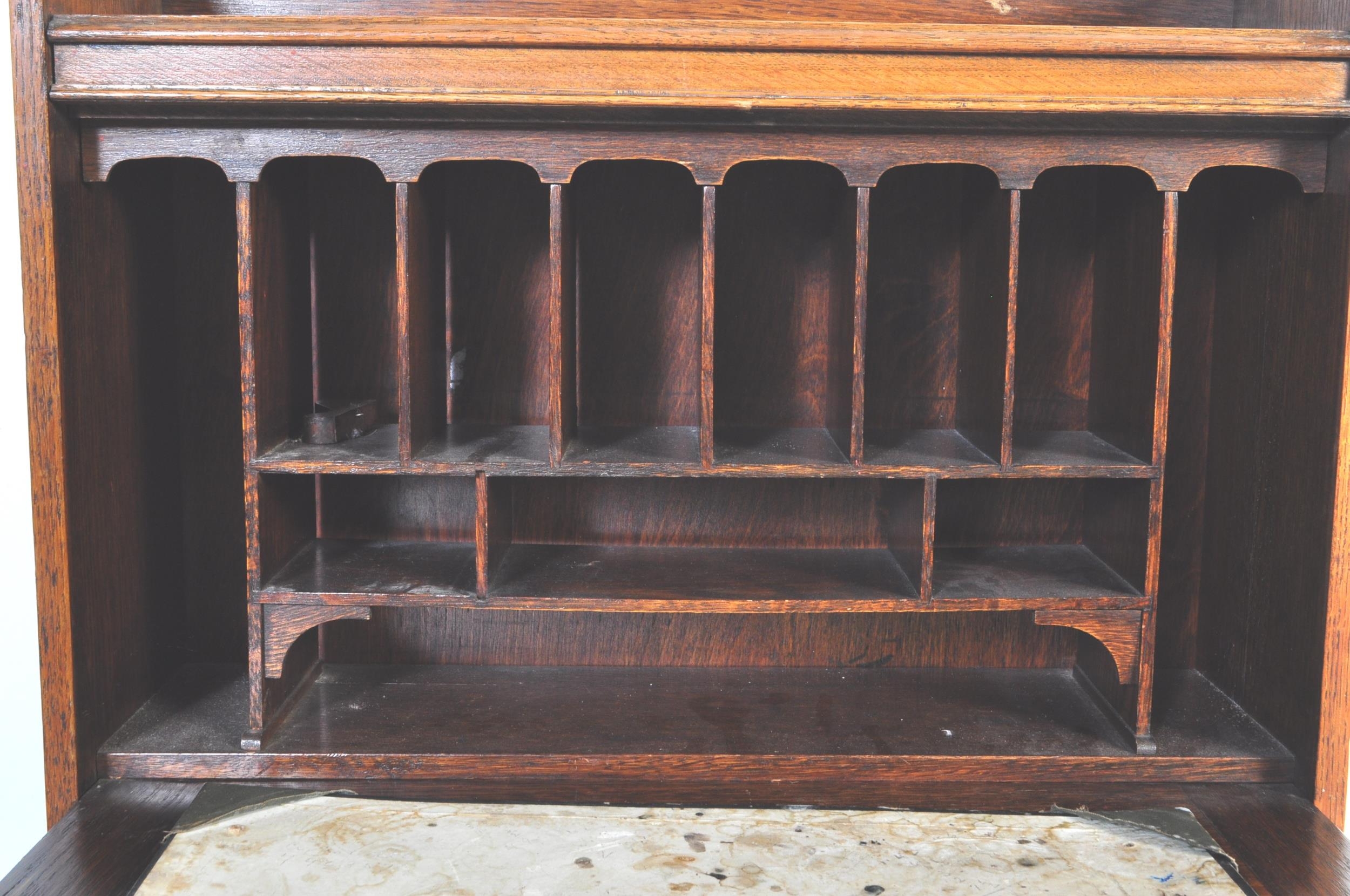 A vintage early 20th Century Arts & Craft circa 1930s oak bureau student bookcase. Of rectangular form with gallery back carved wood front drawer atop two shelves with trestle supports. Measures approx. 118cm x 62cm x 31cm.