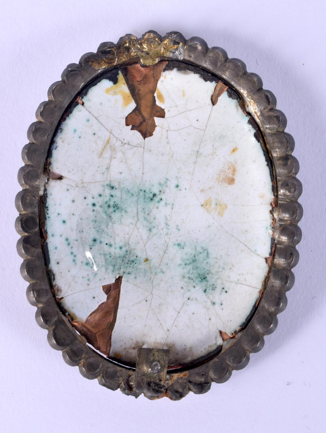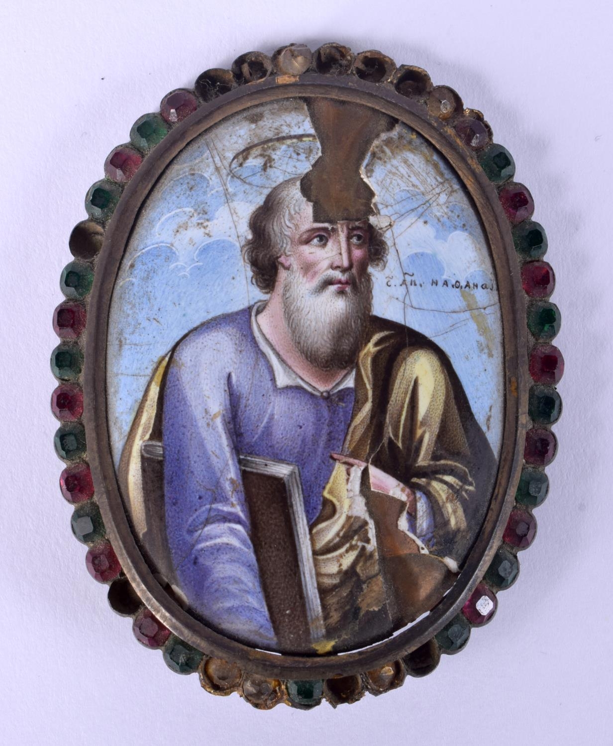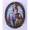 A 17TH/18TH CENTURY CONTINENTAL JEWELLED ENAMEL ICON depicting a saint. 7 cm x 4.5 cm.