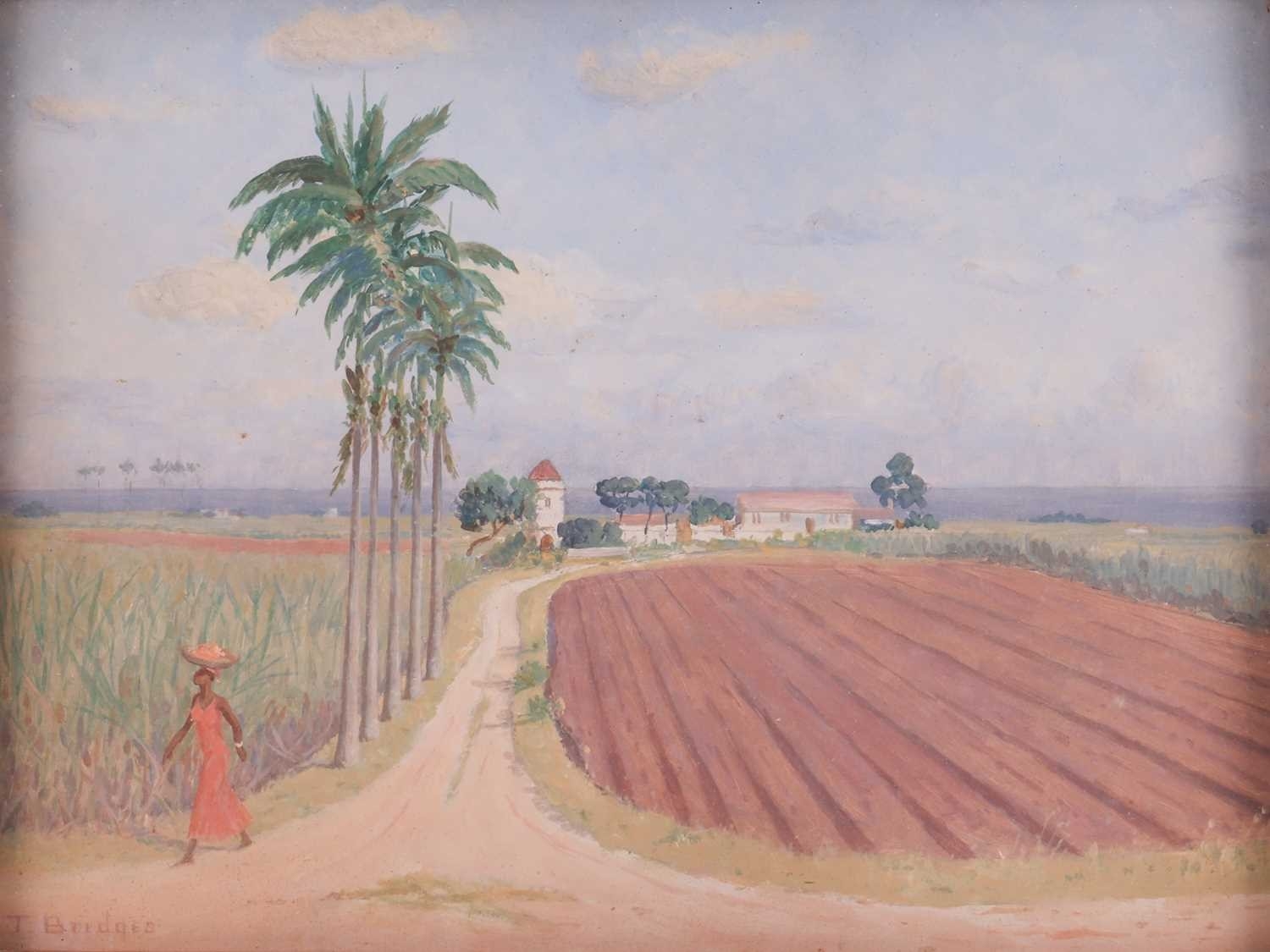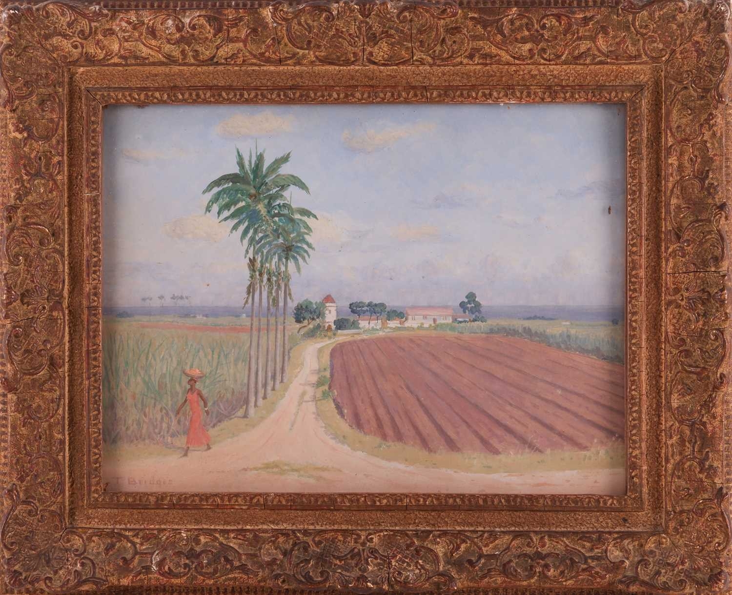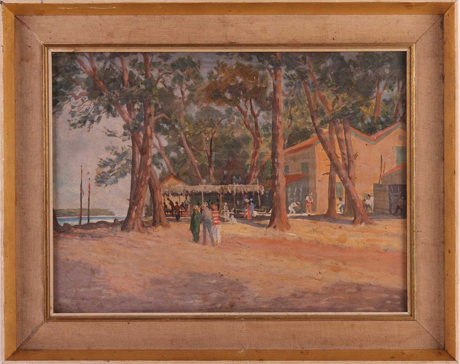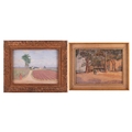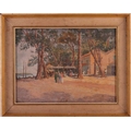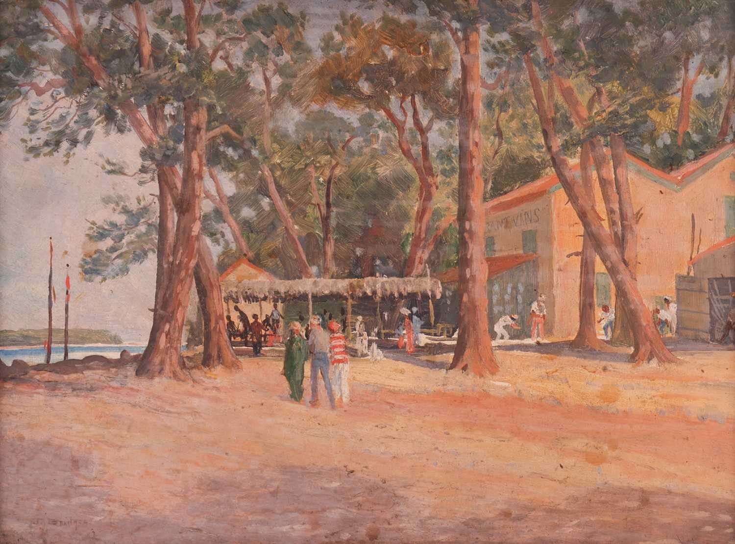 Sir George Tom Molesworth ?Tom? Bridges KCB KCMG DSO (British 1871?1939) Plantation road with figure; & Waterfront cafe two, both signed 'T.Bridges' (lower left) both oil on board one 29 x 38 cm, framed and glazed 44 x 55 cm, the other 28 x 38.5 cm, framed 39.5 x 49.5 cm Provenance: By descent within the family of Lieutenant-General Sir George Tom Molesworth ?Tom? Bridges KCB KCMG DSO (1871?1939), Governor of South Australia (1922?27), soldier, writer and painter. Footnote: Sir Tom Bridges was a career British officer commissioned from Woolwich into the Royal Artillery in 1892. He served in India and Africa, fought in the South African War (where he was twice mentioned in despatches), and was severely wounded. In the First World War he became briefly famous during the retreat from Mons: on 27 August 1914 at St-Quentin, whilst injured, he rallied exhausted infantry with a toy drum and tin whistle leading them back to the British Expeditionary Force commanded by Field Marshall Sir John French. He later commanded the 19th (Western) Division on the Somme (1916) and at Ypres/Passchendaele, where a September 1917 wound led to the amputation of a leg. He received the DSO, was created KCB and KCMG, and separately from his Boer War notices, was also mentioned in despatches for WWI service. After missions in the Balkans and Middle East, Bridges was appointed Governor of South Australia (1922?27). He painted seriously, studying at the Slade and exhibiting in Adelaide and London. Bridges cultivated an eccentric public image. During the war he kept a pet lion, ?Poilu,? which was often found wandering the trenches; press reports in 1917 wrote that he requested his amputated leg to supplement his pets poor war diet. He died at Brighton on 26 November 1939, aged 68.