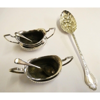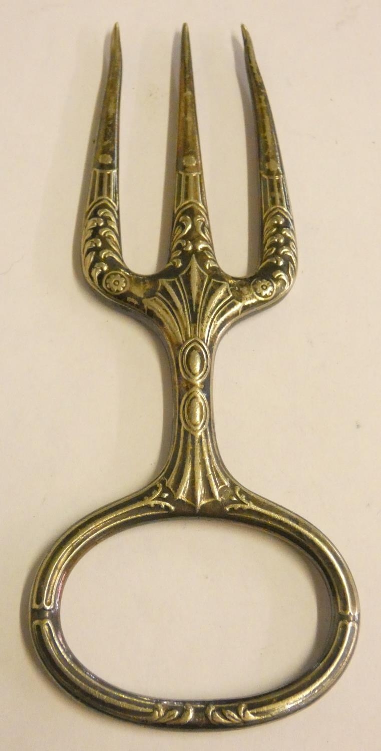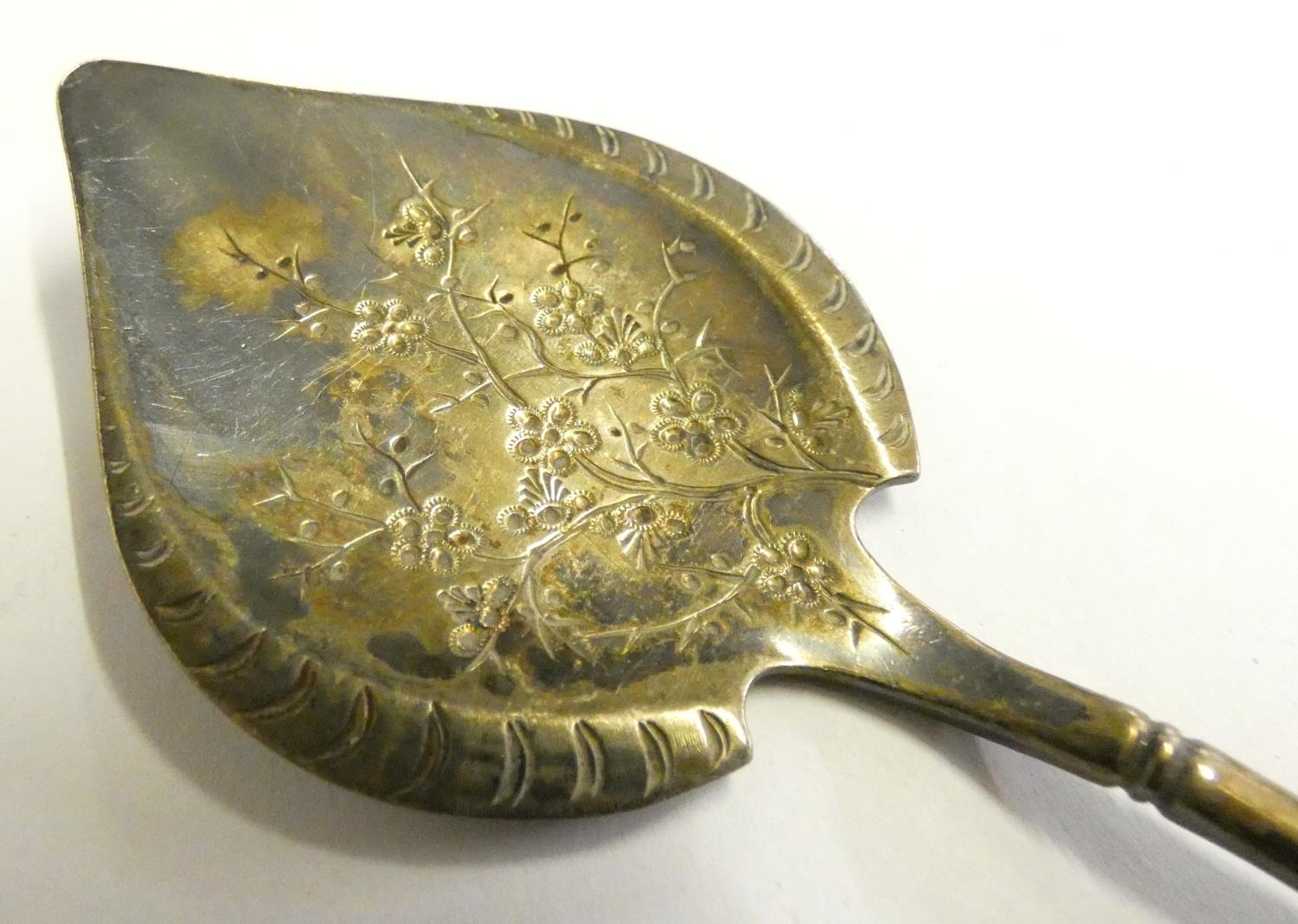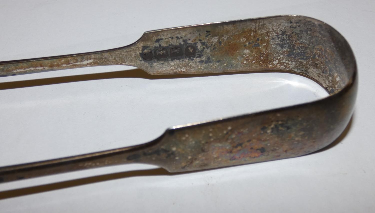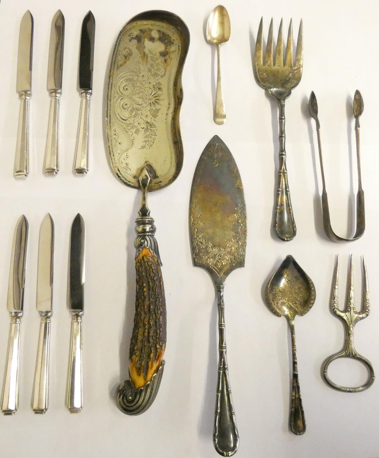 A Victorian silver pair of sugar tongs, Exeter 1847, a set of six silver handled tea knives, London 1930 and other wares.