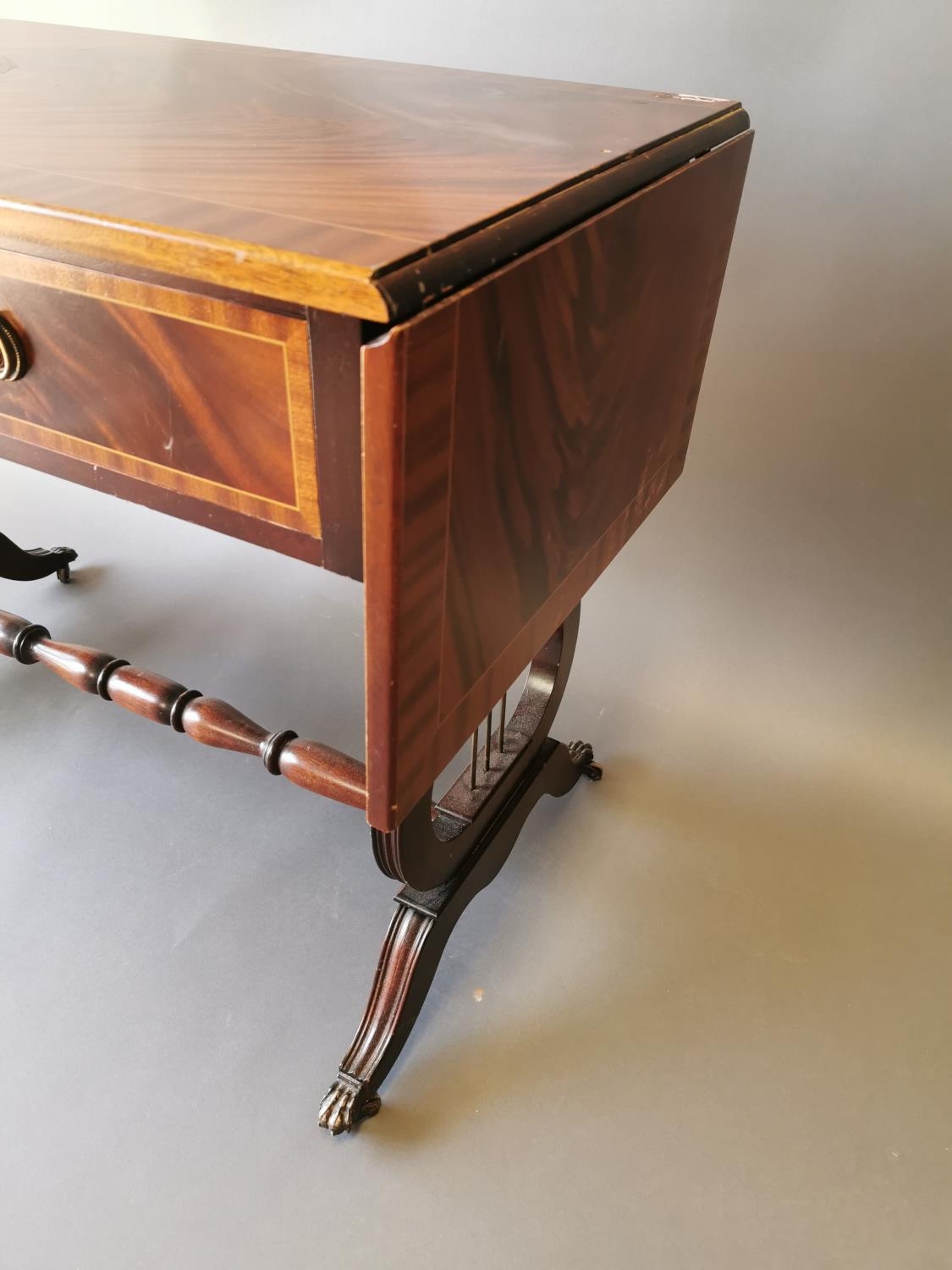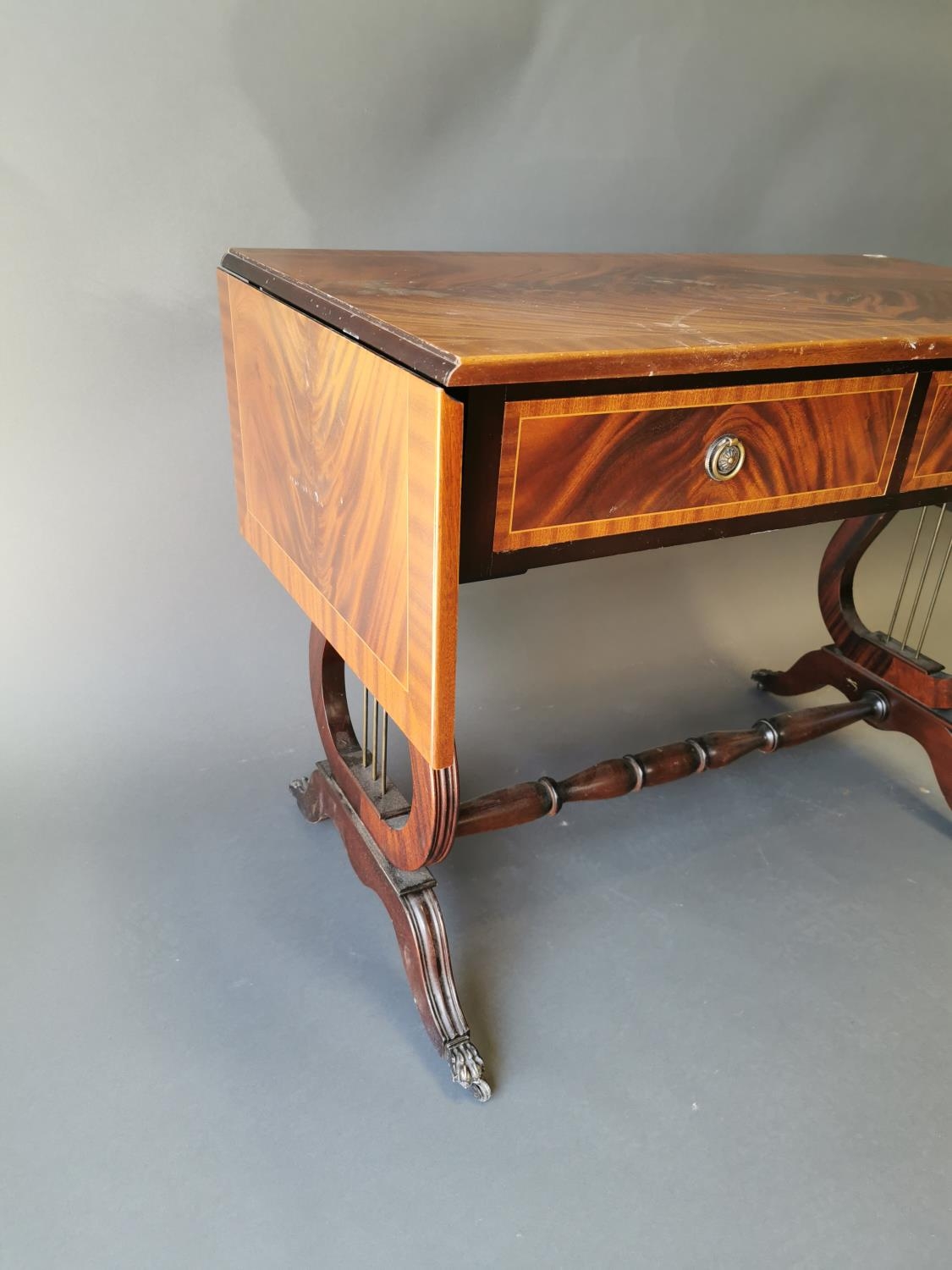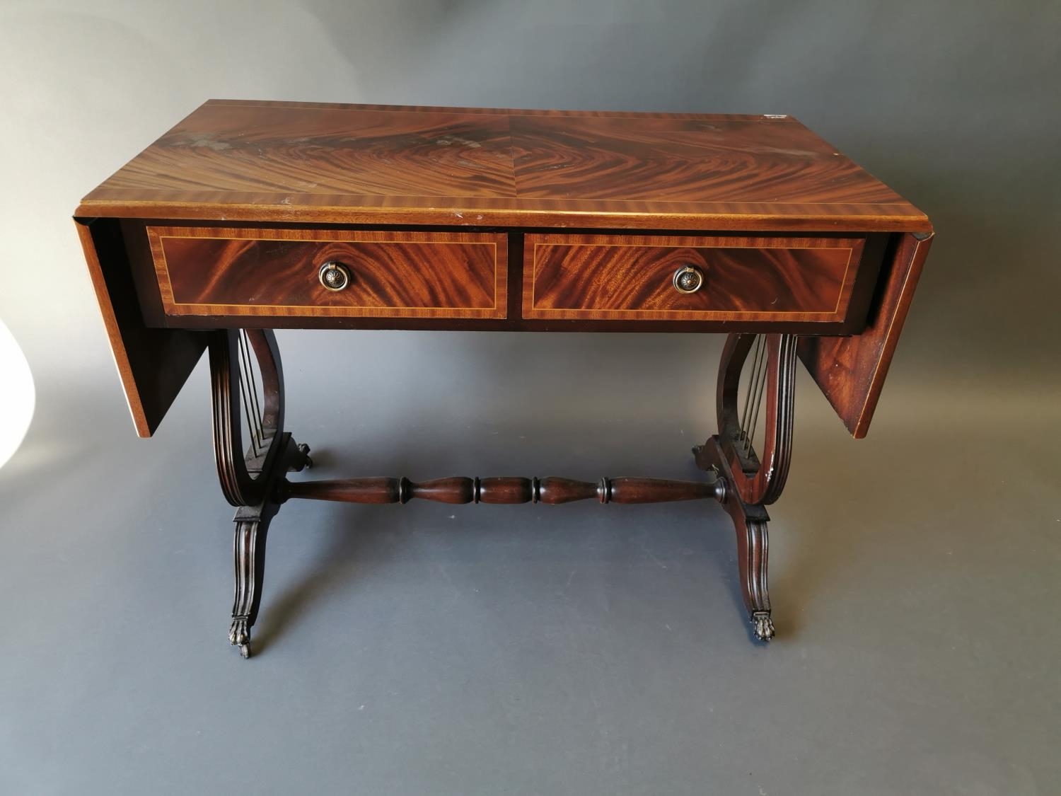 Mahogany inlaid sofa table with two drawers in the frieze on lyre supports in the Georgian style {73 cm H x 100 cm W x 52 cm D}.