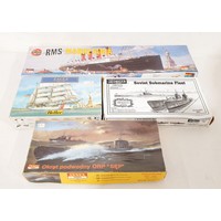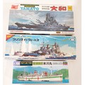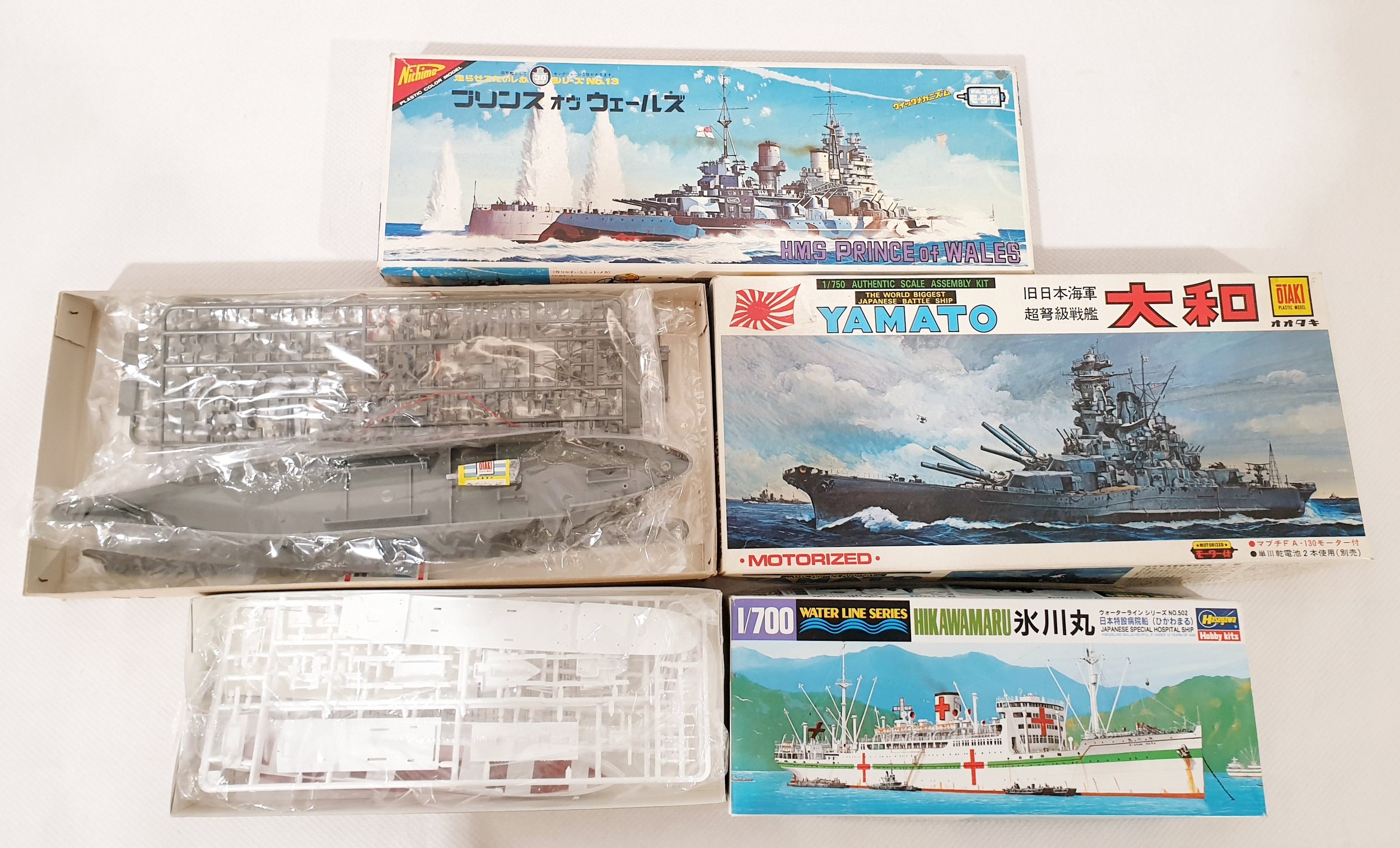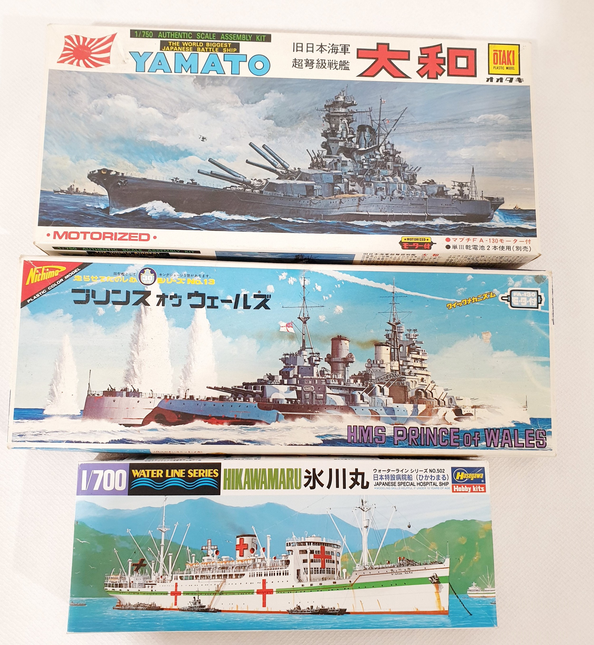 Three Japanese model ship kits Otaki 1/750 scale 'Yamato', Hasegawa 1:700 scale 'Hikawamaru' & Nichimo 'HMS Prince of Wales'.