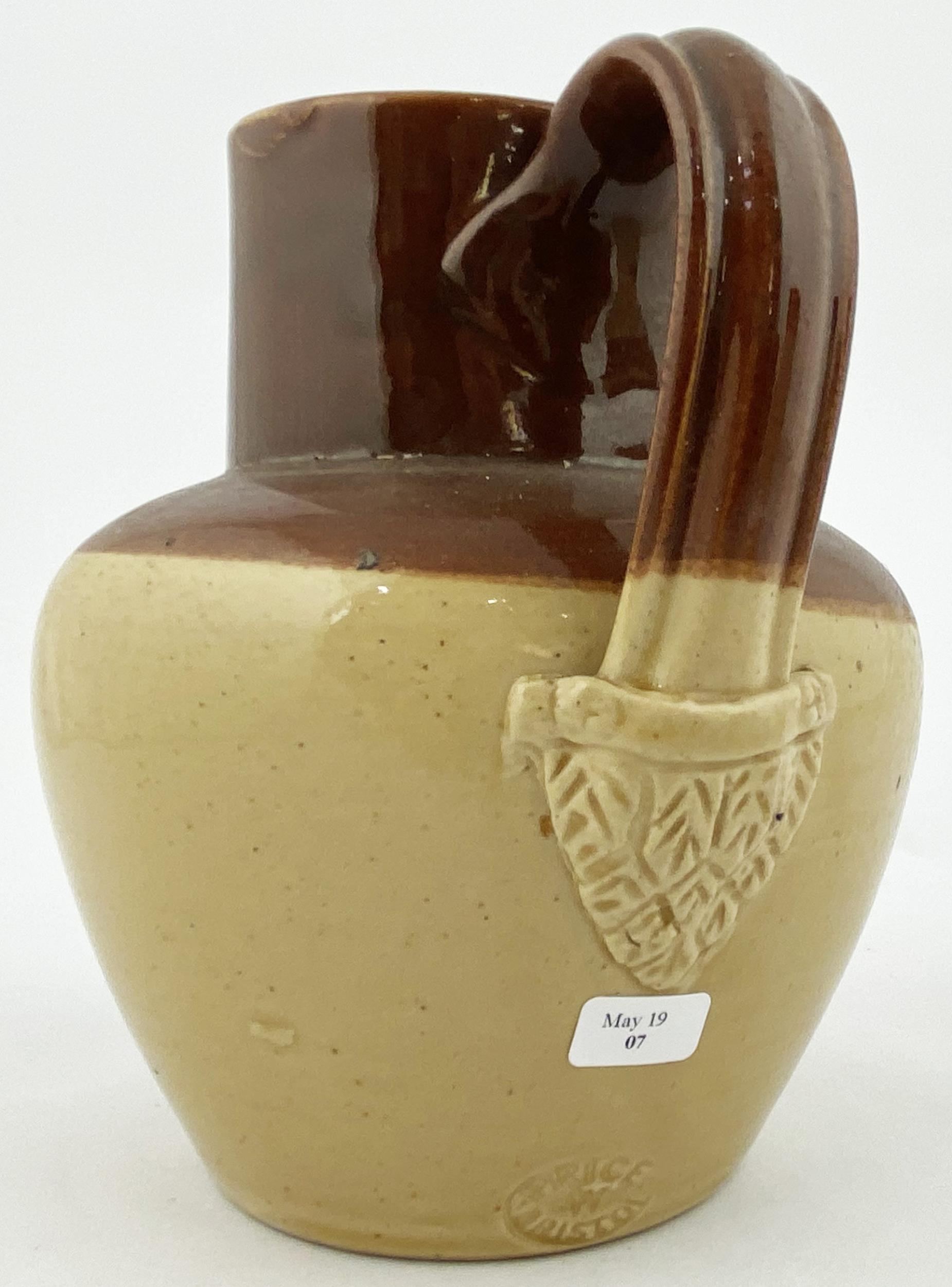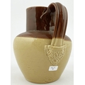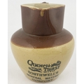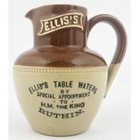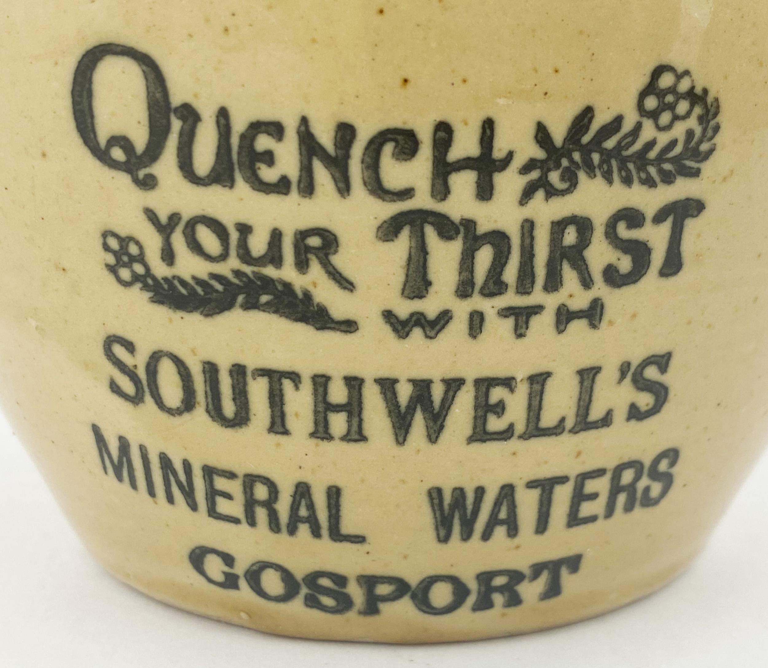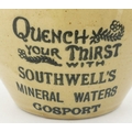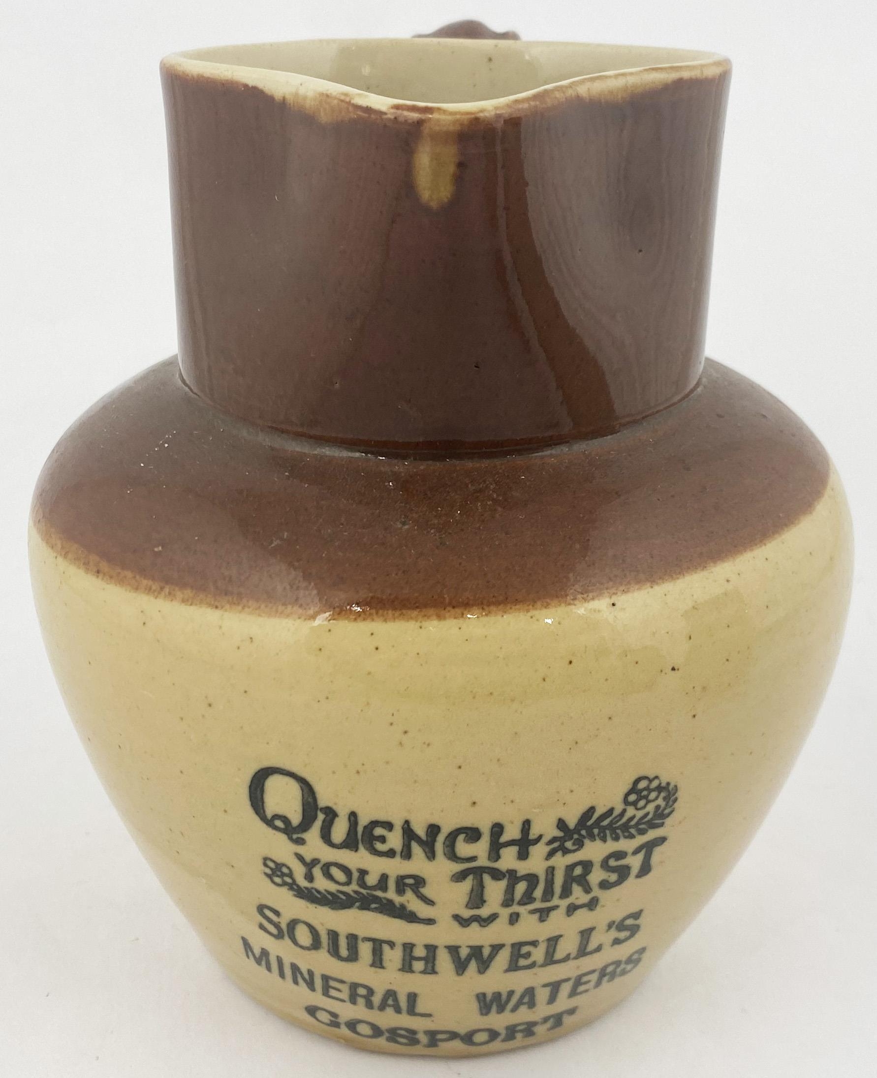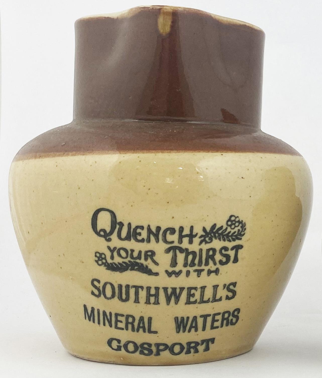 GOSPORT MINERAL WATERS ADVERTISING JUG. 6ins tall, bulbous bodied jug, lower cream colour, top area brown, pouring lip, rear handle, Price Bristol. Belly transfer QUENCH/ YOUR THIRST/ WITH/ SOUTHWELLS/ MINERAL WATERS. No damages.