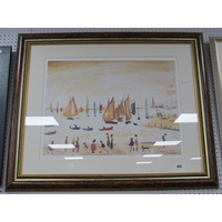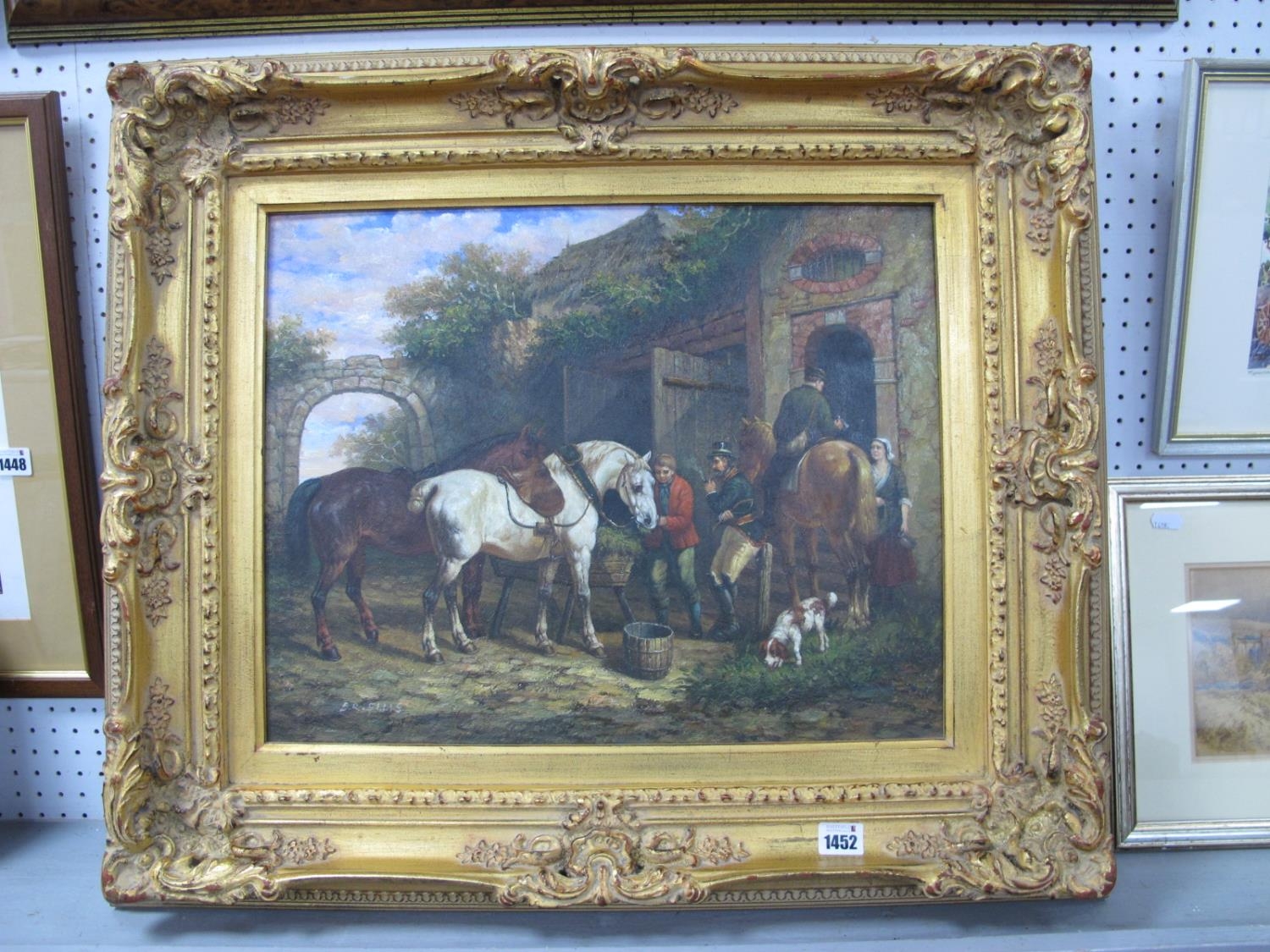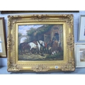 B.R. Ellis (XX Century), Looking After the Horses, with figures and spaniel in attendance, oil on board, signed lower left, label verso, 38.5 x 48.5cm.