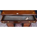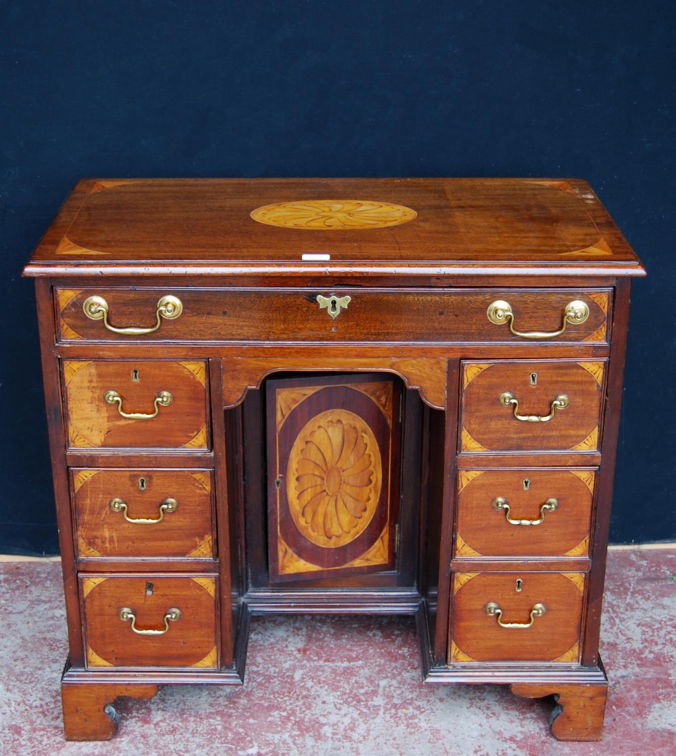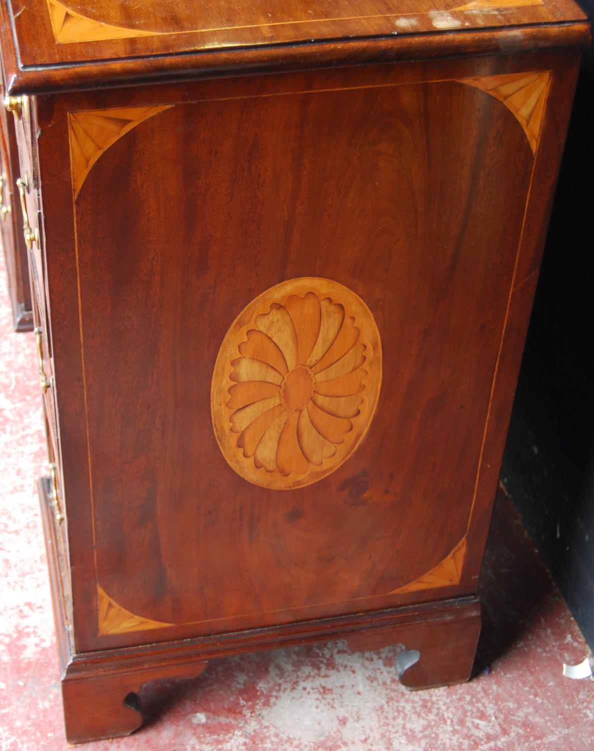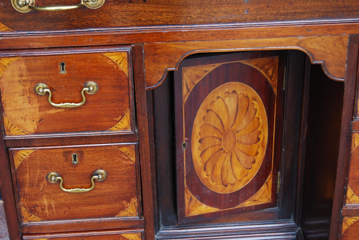 George III style marquetry inlaid mahogany kneehole desk, the long drawer above a cupboard door flanked by three short deep drawers, decorated all over with satinwood inlaid shell paterae, on bracket feet, 82cm high, 88cm wide and 46cm deep.