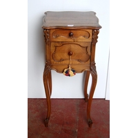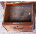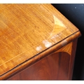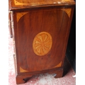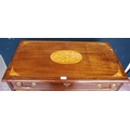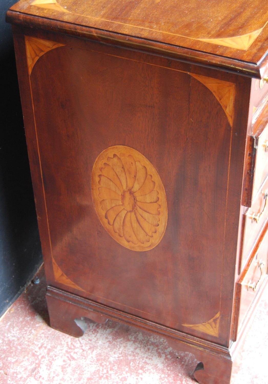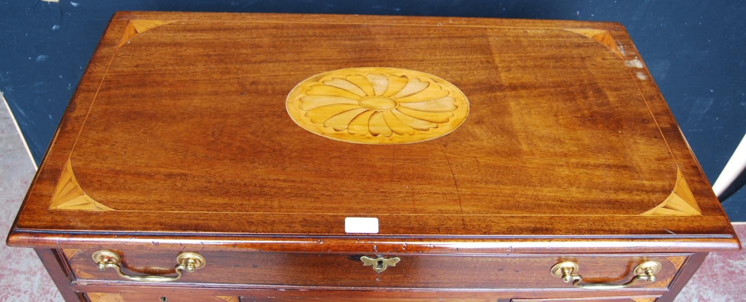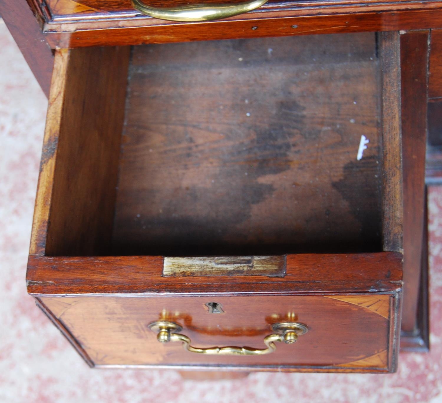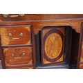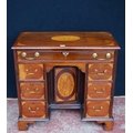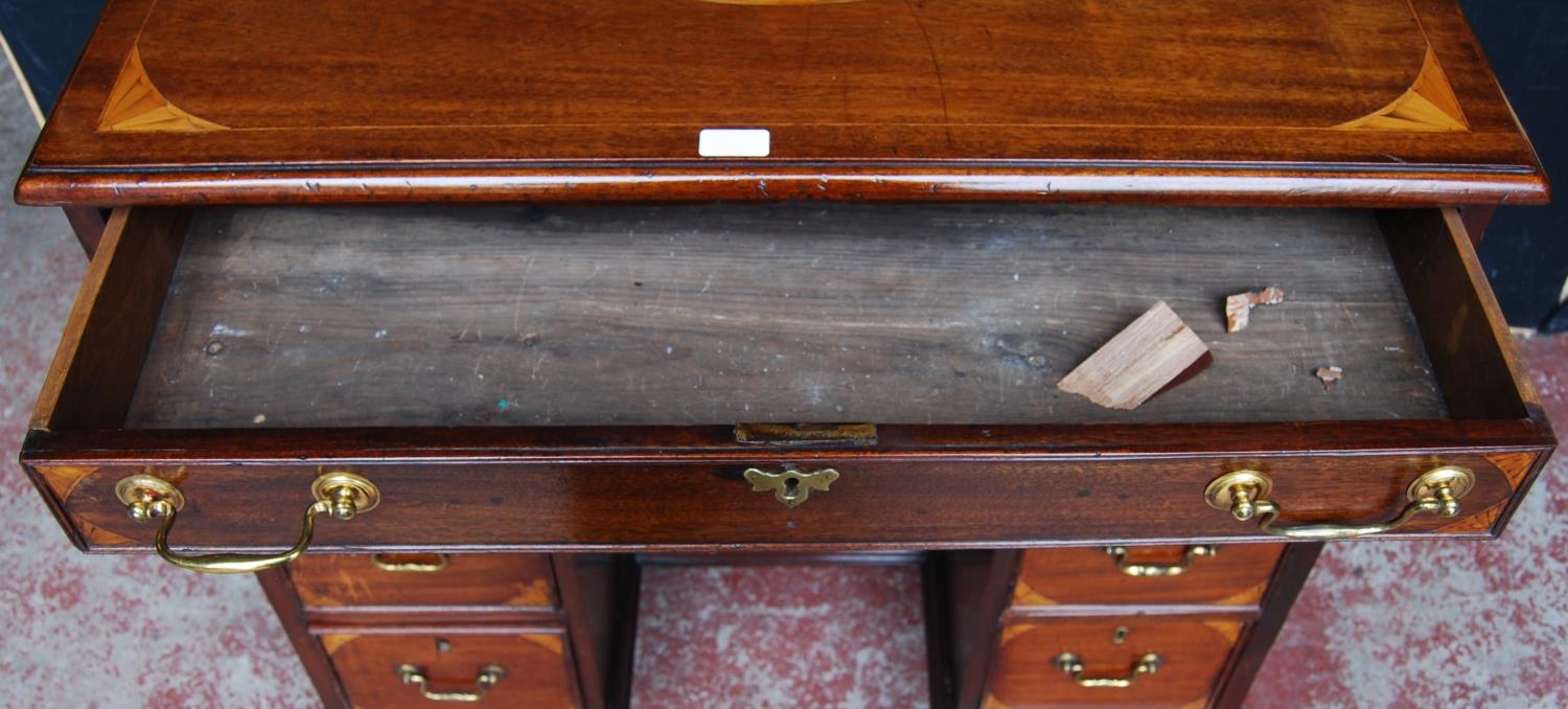 George III style marquetry inlaid mahogany kneehole desk, the long drawer above a cupboard door flanked by three short deep drawers, decorated all over with satinwood inlaid shell paterae, on bracket feet, 82cm high, 88cm wide and 46cm deep.