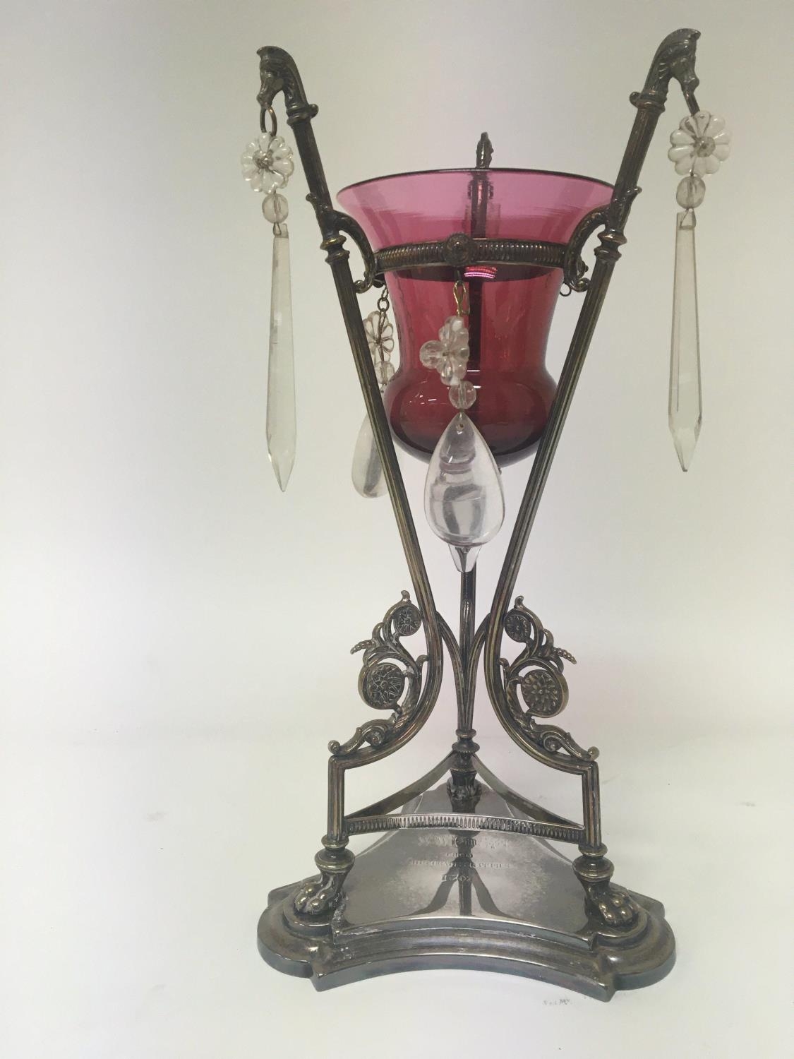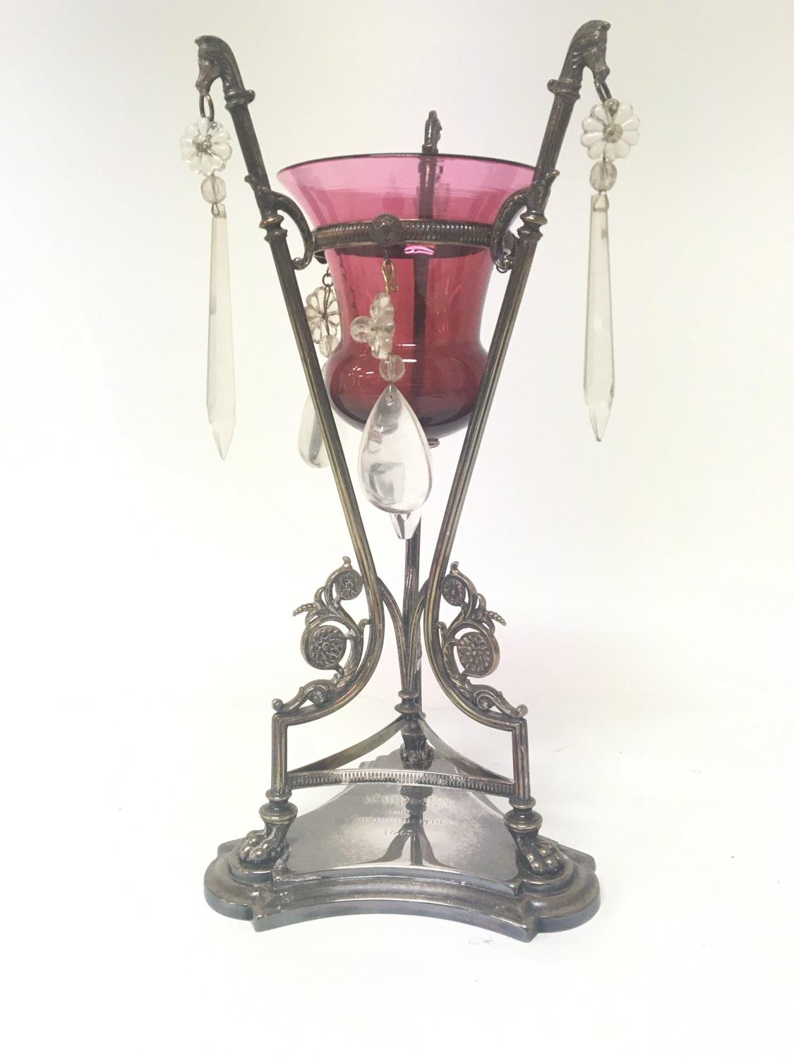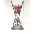 A Victorian cranberry glass and silver plated Epergne with glass drops. Hight 34cm.