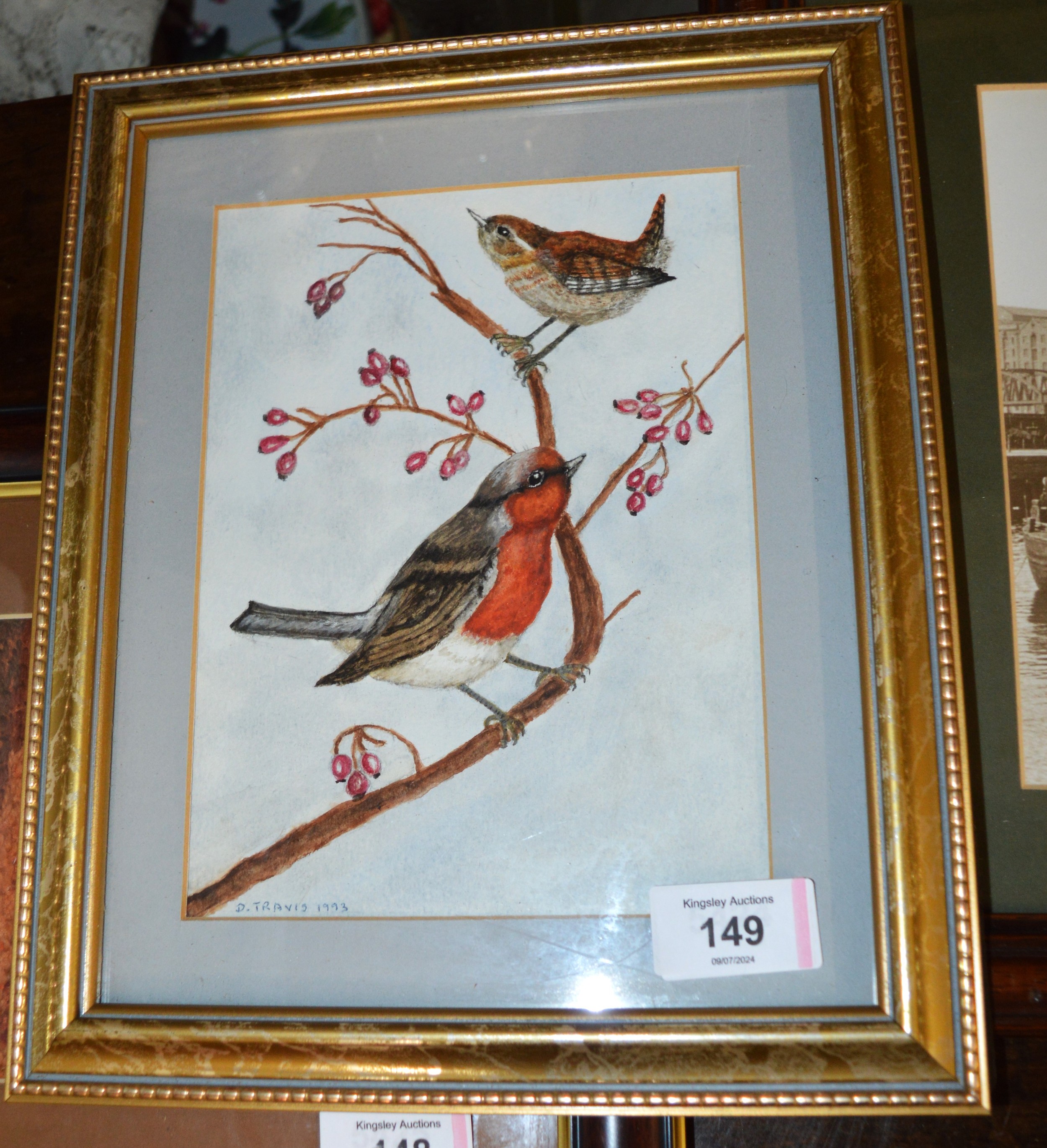 Framed Original Watercolour of a Robin Painting Signed D Travis 1993