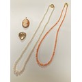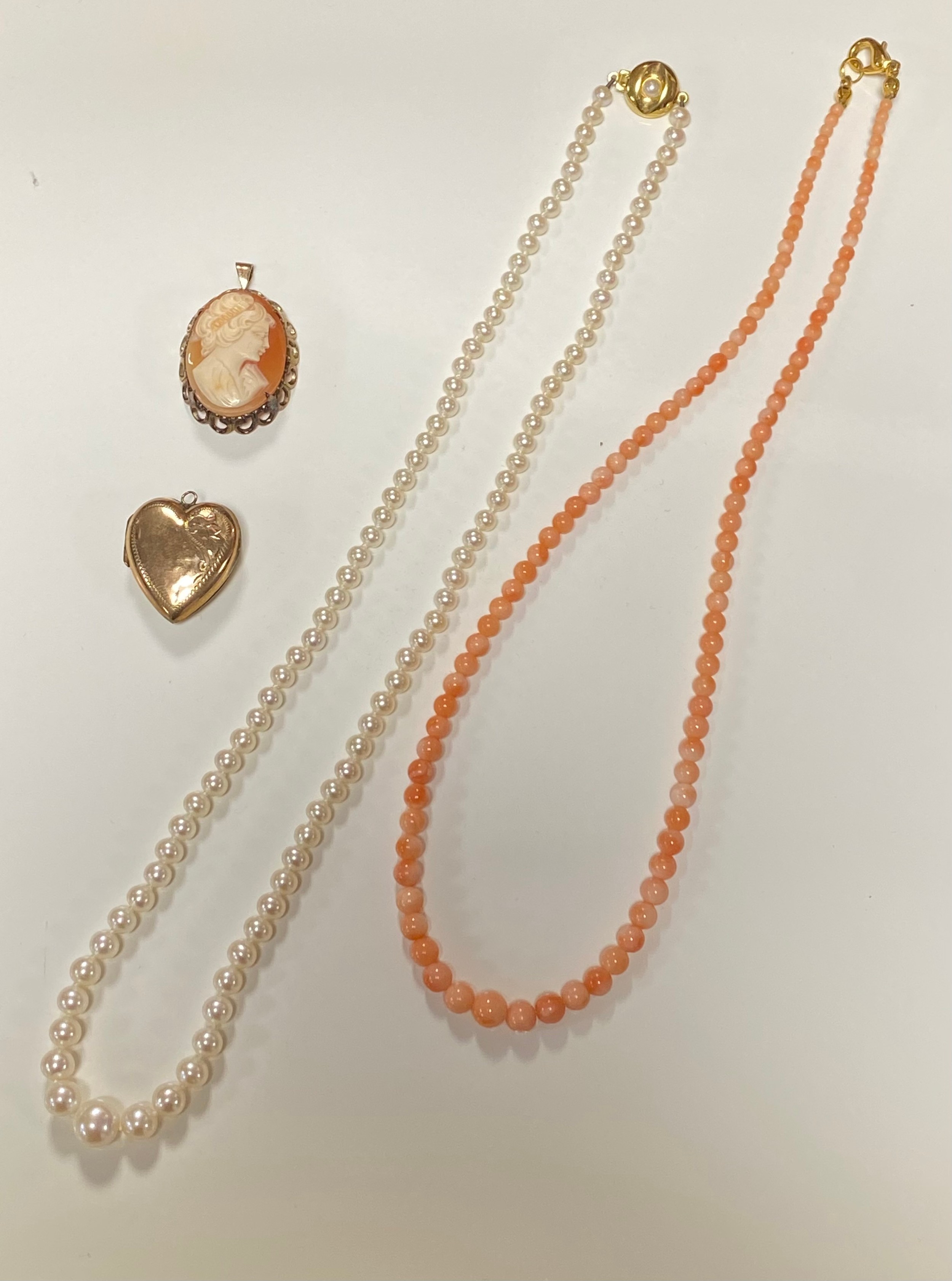 A 9ct gold locket, together with a 9ct mounted shell cameo pendant, a row of pearls to 9ct clasp and coral bead necklace -