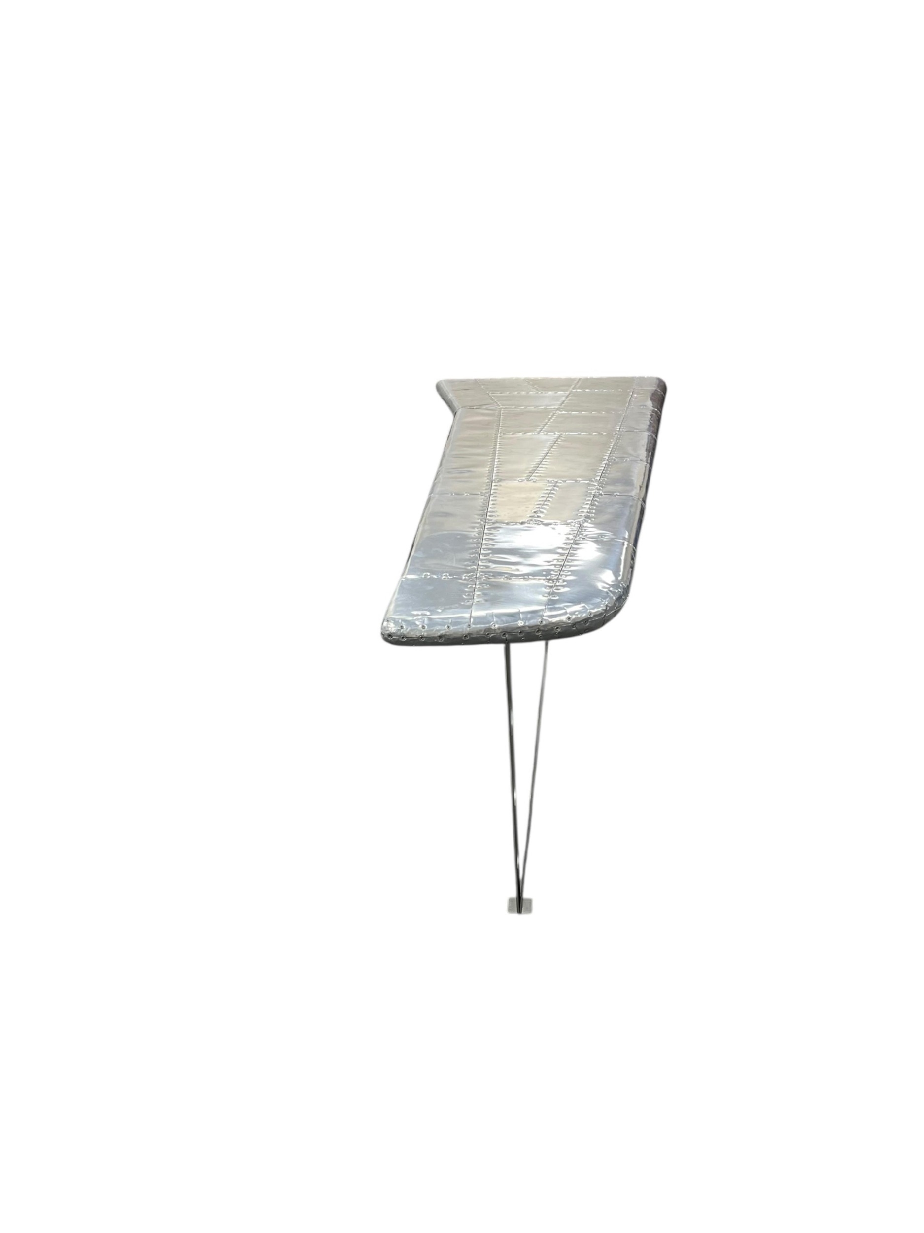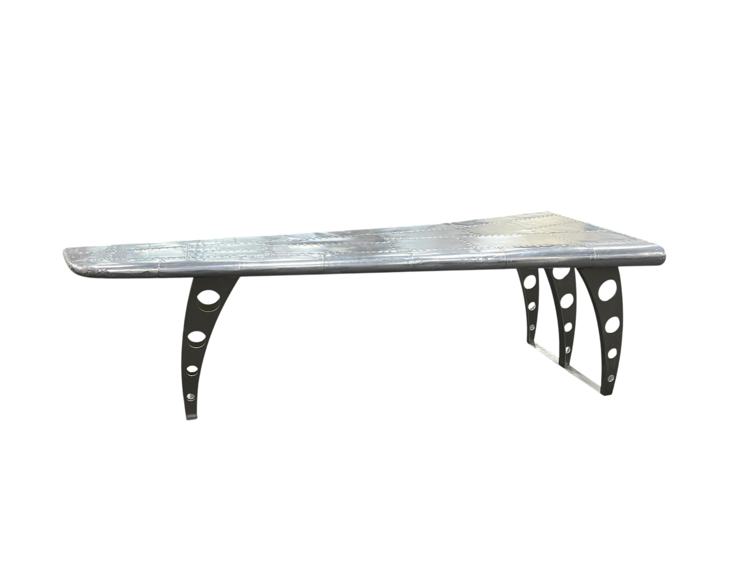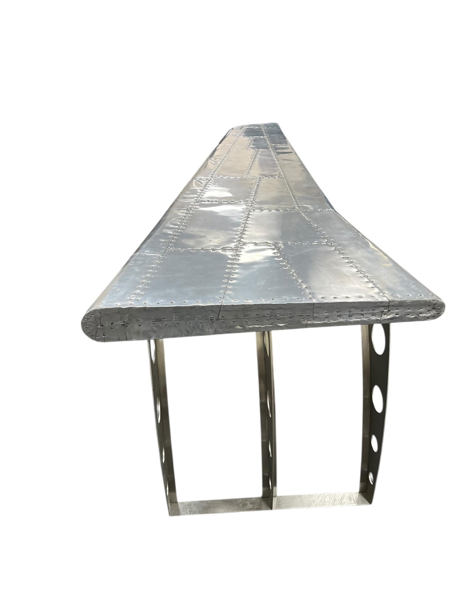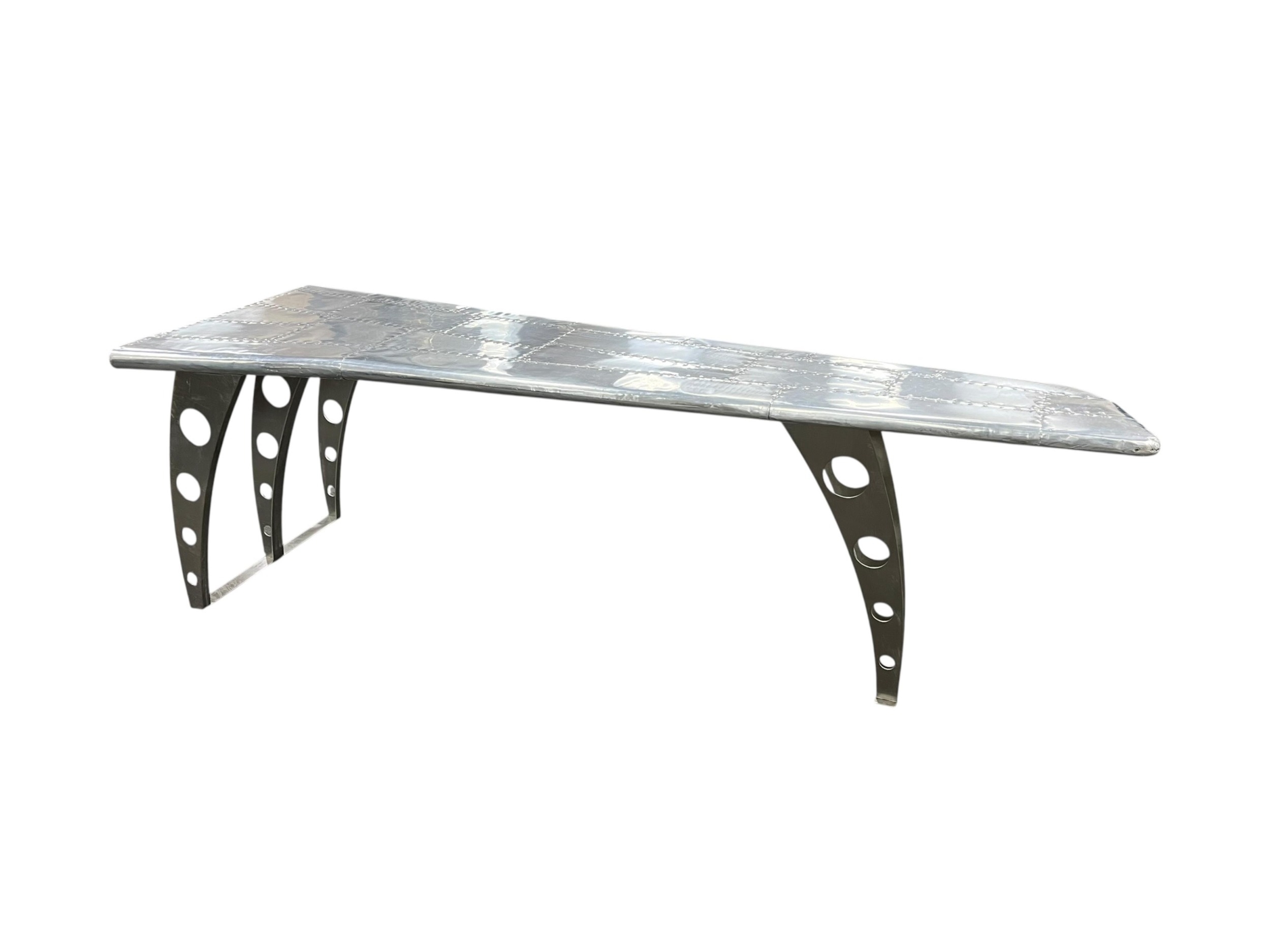 An Aviator style aluminium covered 'aircraft wing' desk / console table, manner of Timothy Oulton, length 243cm, maximum depth 87cm, height 79cm