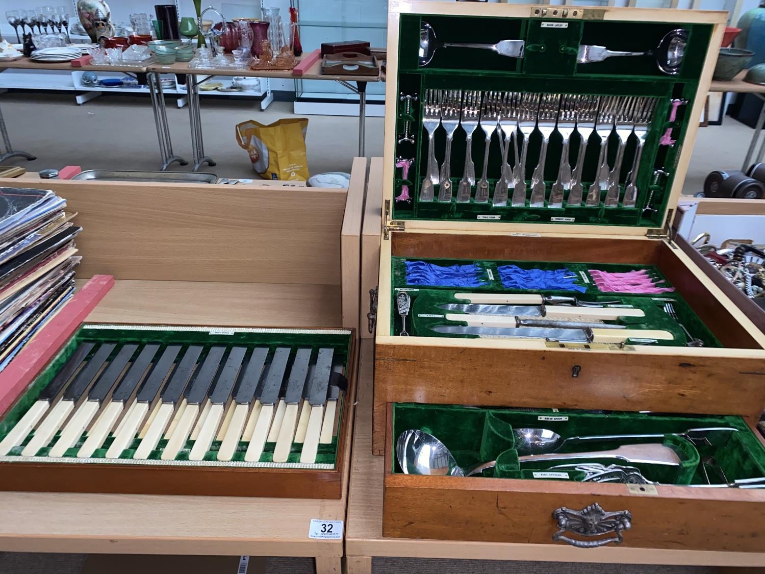A complete silver plated Walker and Hall 12 place setting canteen of cutlery in fitted mahogany cutlery box