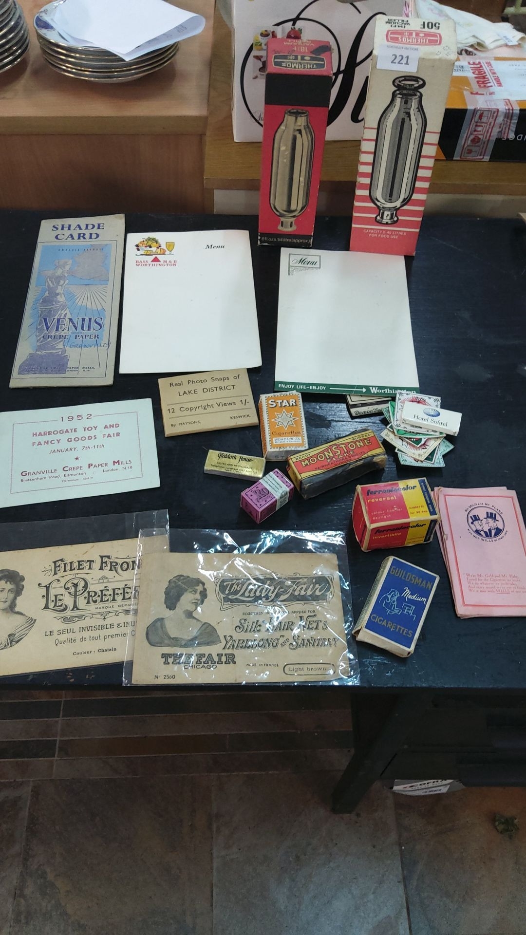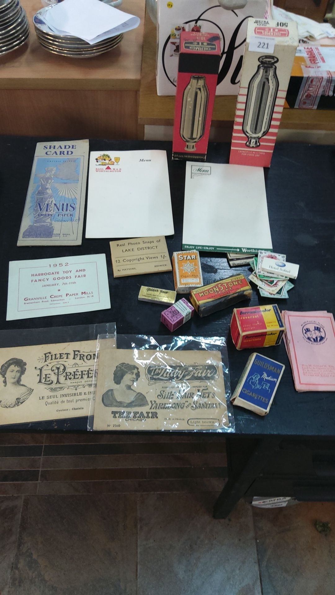 Mixed lot includes mid-20th century ephemera, cigarette boxes, vintage menus, paper samples, and Lake District snapshots.