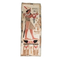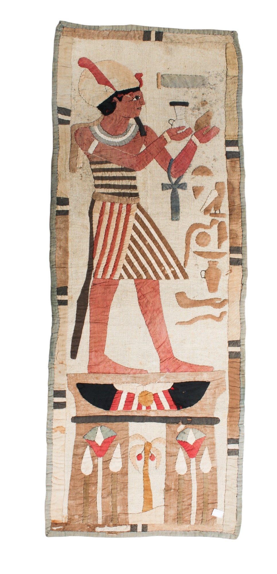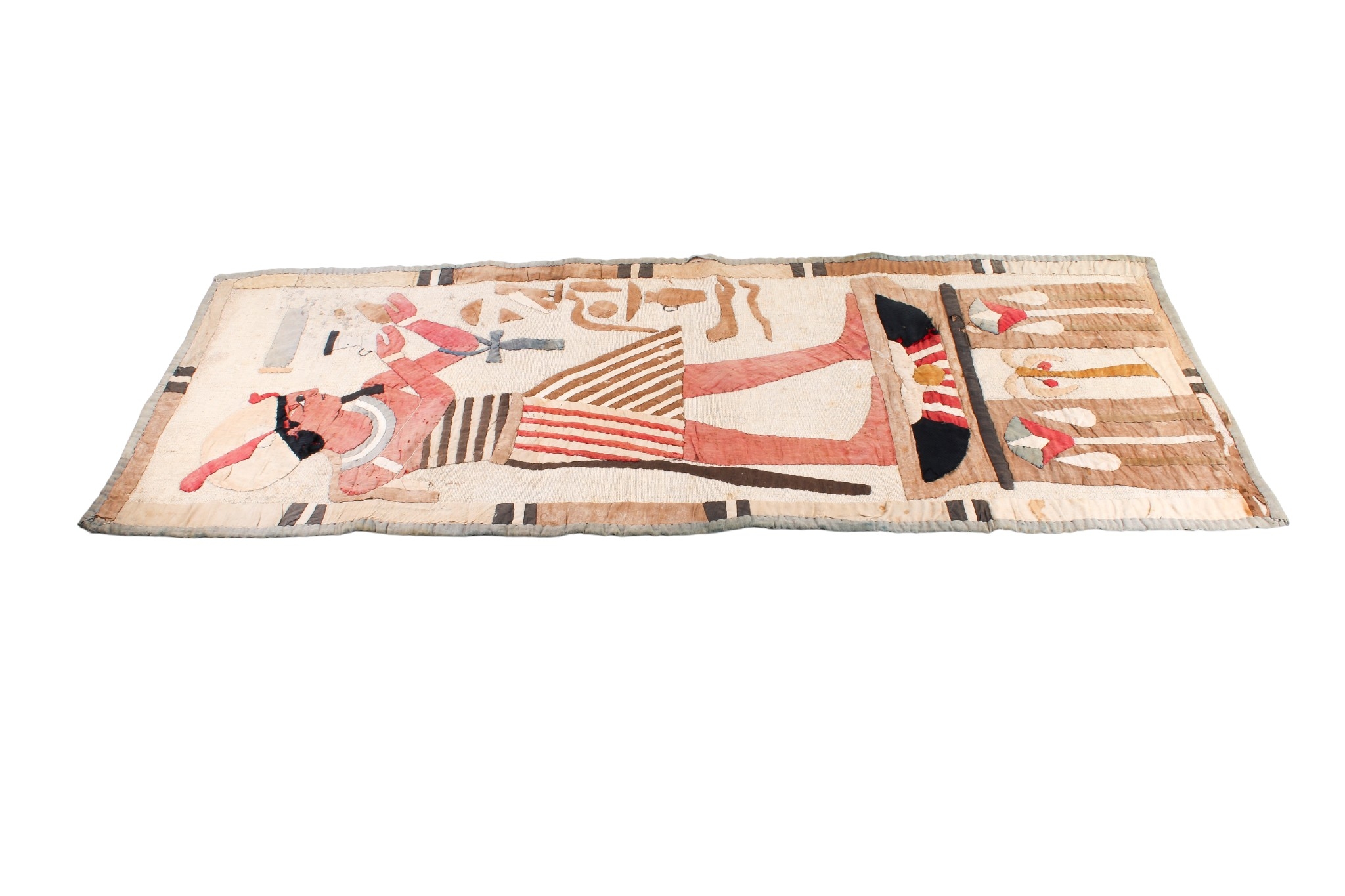 An early 20th century Egyptian khayamiya. The cotton appliqué decoration stitched onto woven fabric, depicting a standing figure surrounded by hieroglyphs, 116cm x 45.5cm Notes: Khayamiya were originally constructed from tent panels which were used for special occasions such as weddings and festivals. Later, from around the late 19th century, tentmakers also began producing examples for decorative purposes. Following the discovery of Tutankhamun's tomb in 1922, 'Tutmania' dominated the West, and works depicting Pharaonic or figural scenes became popular, mainly to be exported for the tourist trade.