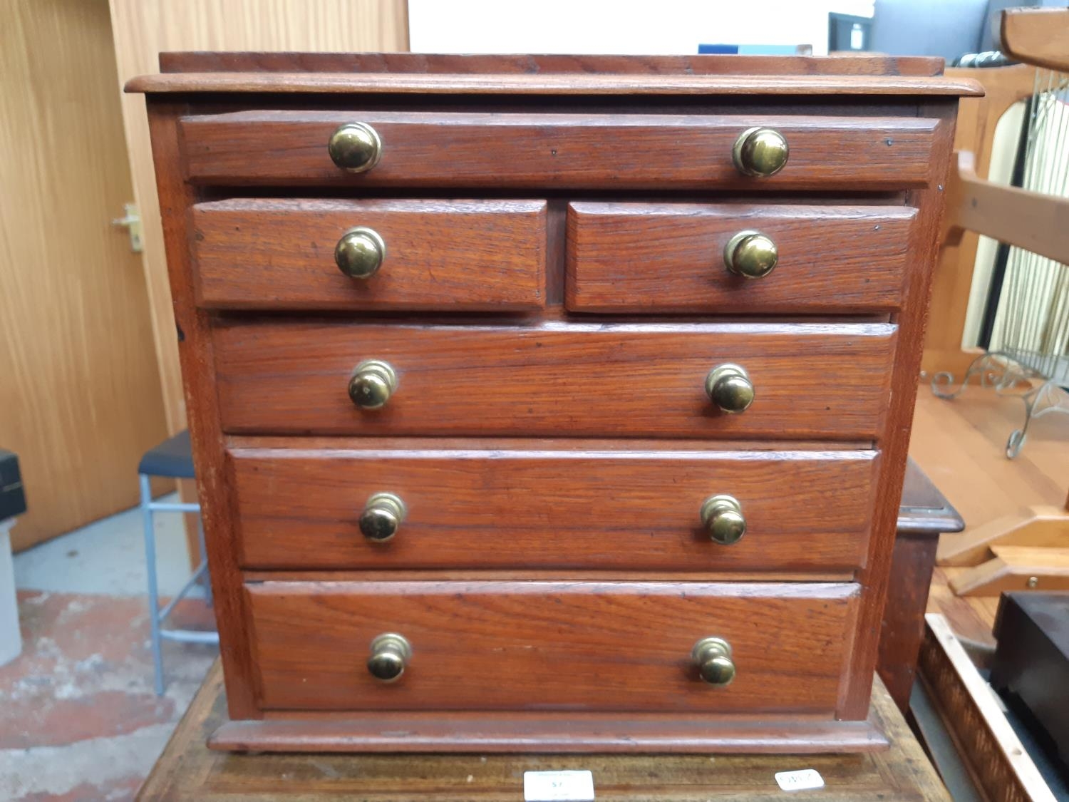 A vintage pine miniature chest of drawers with four long and two short drawers each having brass handles - measuring approx. 38cm in height and 39cm in width