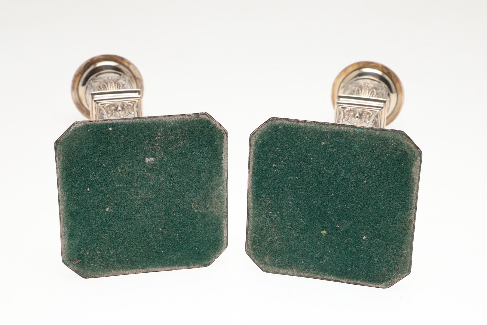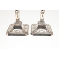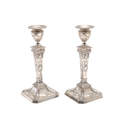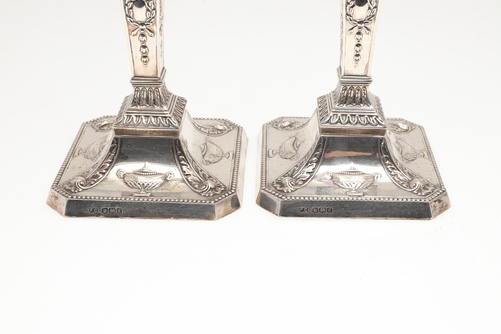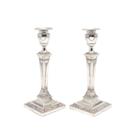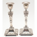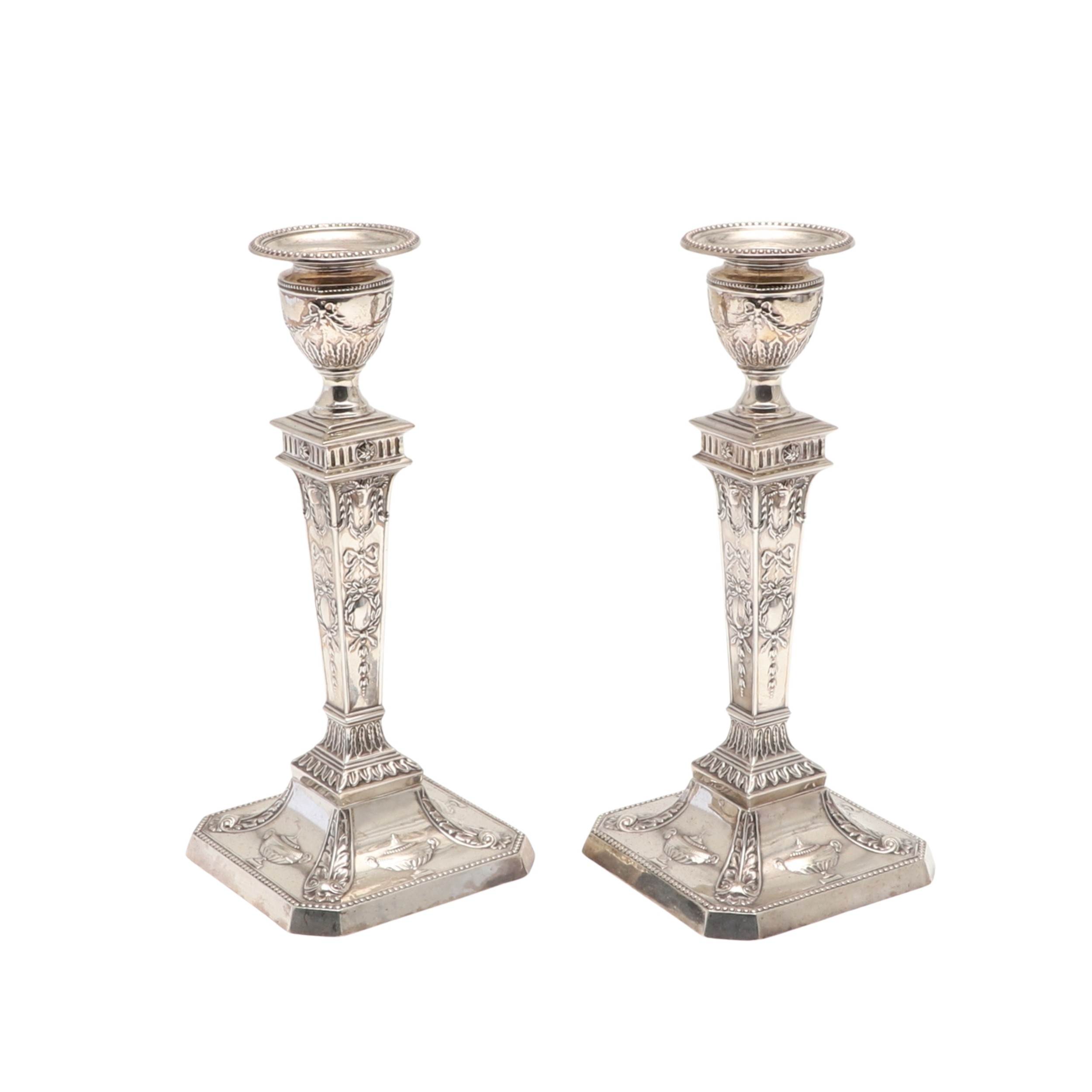 A PAIR OF EARLY 20TH CENTURY FILLED SILVER CANDLESTICKS. In the Adam style, each candlestick being decorated with a beaded circular sconce, urn shaped capitals with swag decoration, and tapering stem with square beaded base having acanthus leaf and tureens on each panel. Height 20cm x Base Width 9cm. Hallmarked Frank Cobb & Co Ltd, Sheffield, 1924. Total weight of each candlestick approximately 14.3ozt. (2).