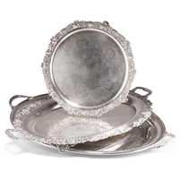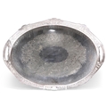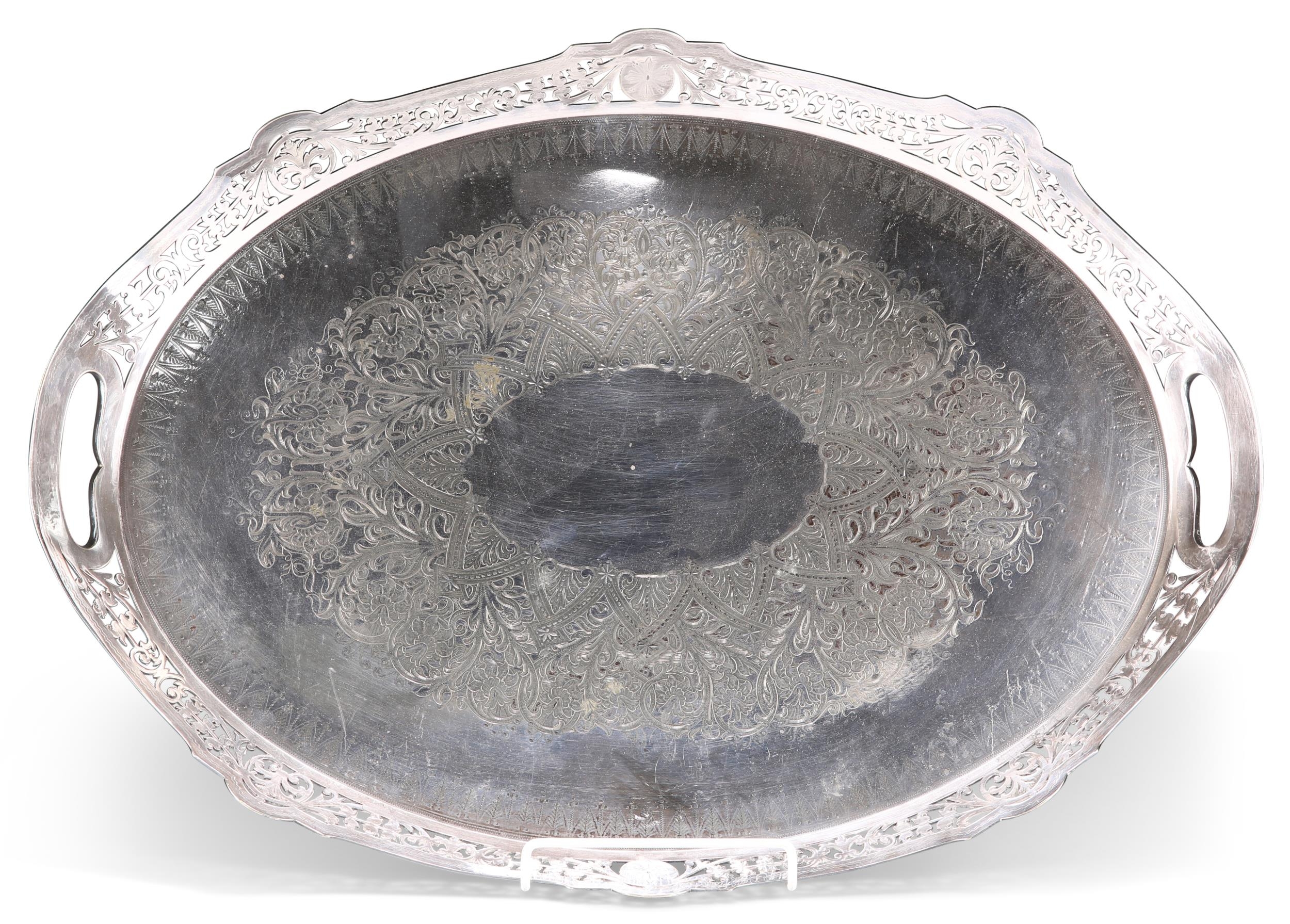 A VICTORIAN SILVER-PLATED LARGE TRAY, by Roberts & Belk, oval with pierced gallery, engraved decoration. 61.5cm long