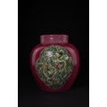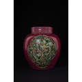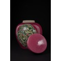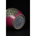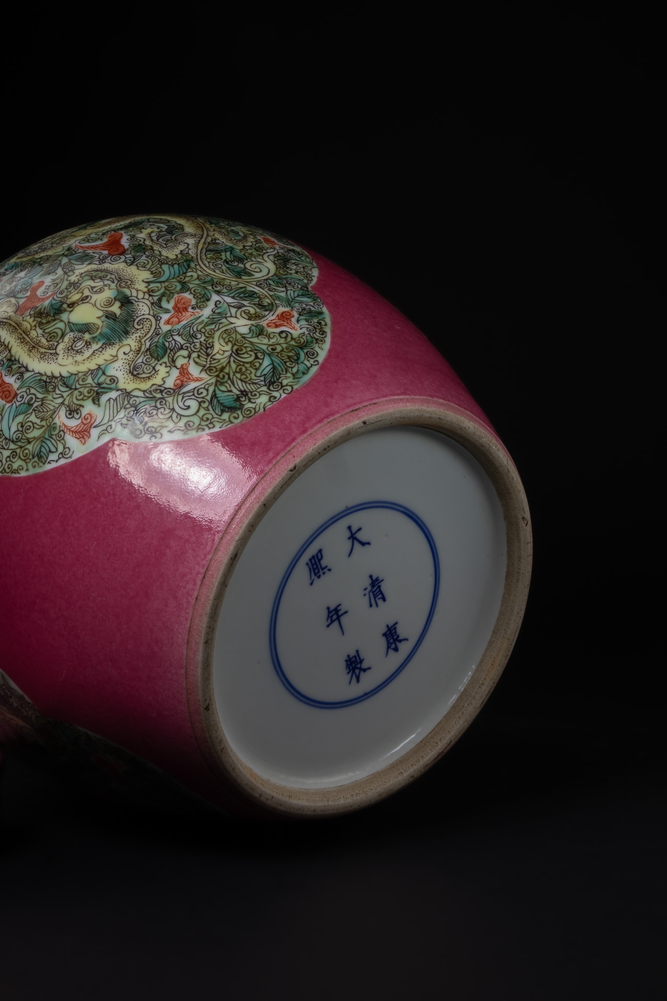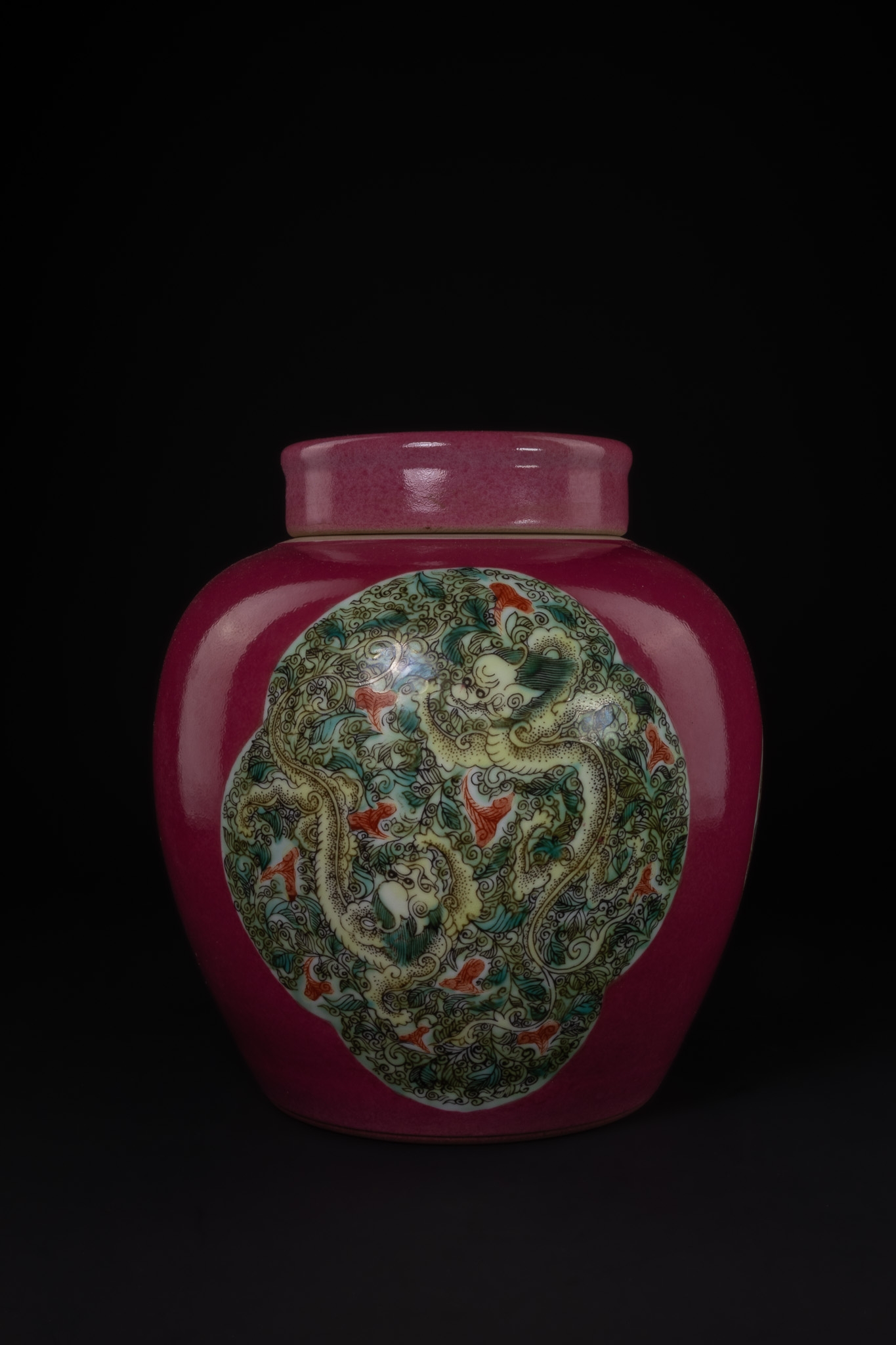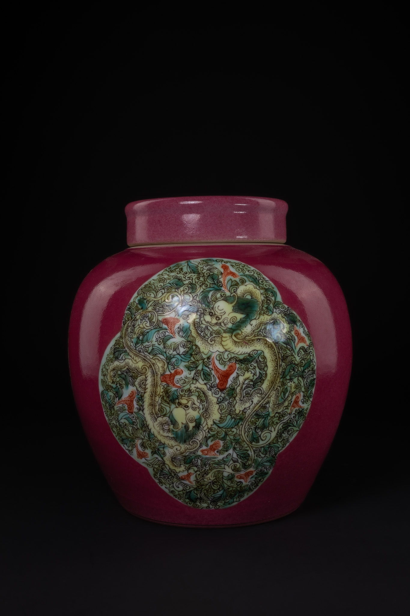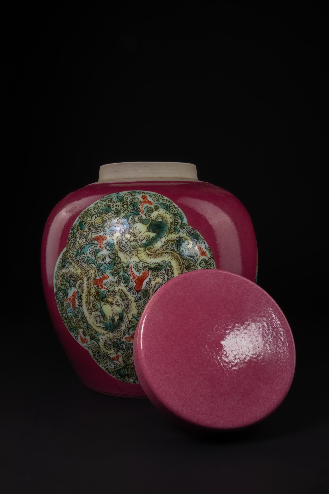 A Chinese porcelain jar of rounded baluster form, covered overall in a deep rose-pink glaze. The body is decorated on each side with a large circular medallion enclosing a finely detailed dragon shown amidst dense scrolling foliage and stylised cloud motifs, painted in famille rose enamels with turquoise, iron-red, and black detailing.