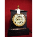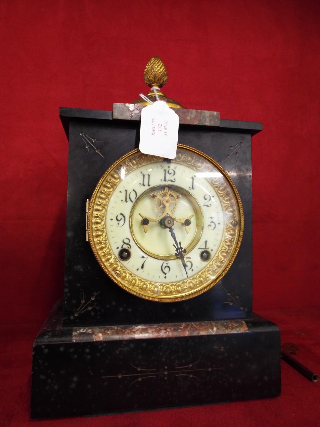 A Victorian marble mantel Ansonia clock enamel dial with Arabic numerals and acorn finial