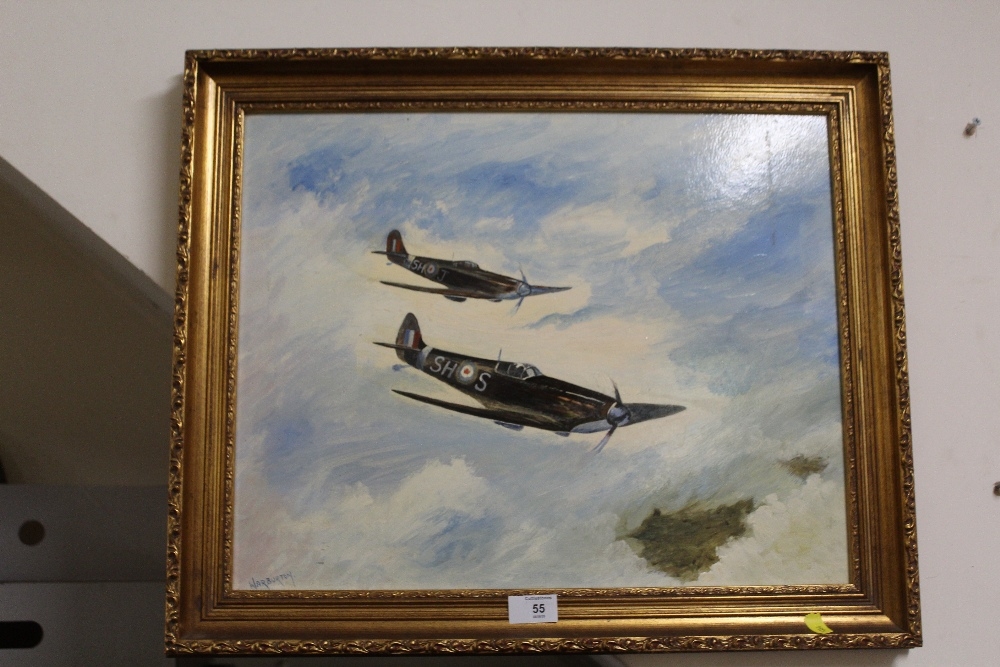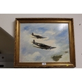 A GILT FRAMED OIL ON BOARD DEPICTING SPITFIRES IN FLIGHT SIGNED WARBURTON LOWER LEFT - OVERALL SIZE 59 X 49 CM