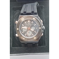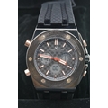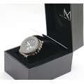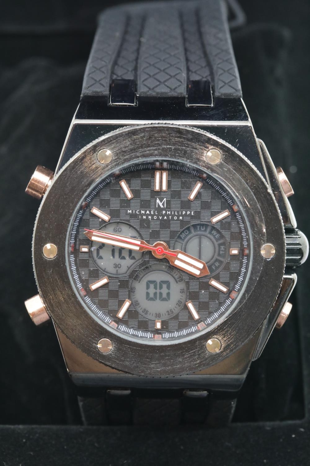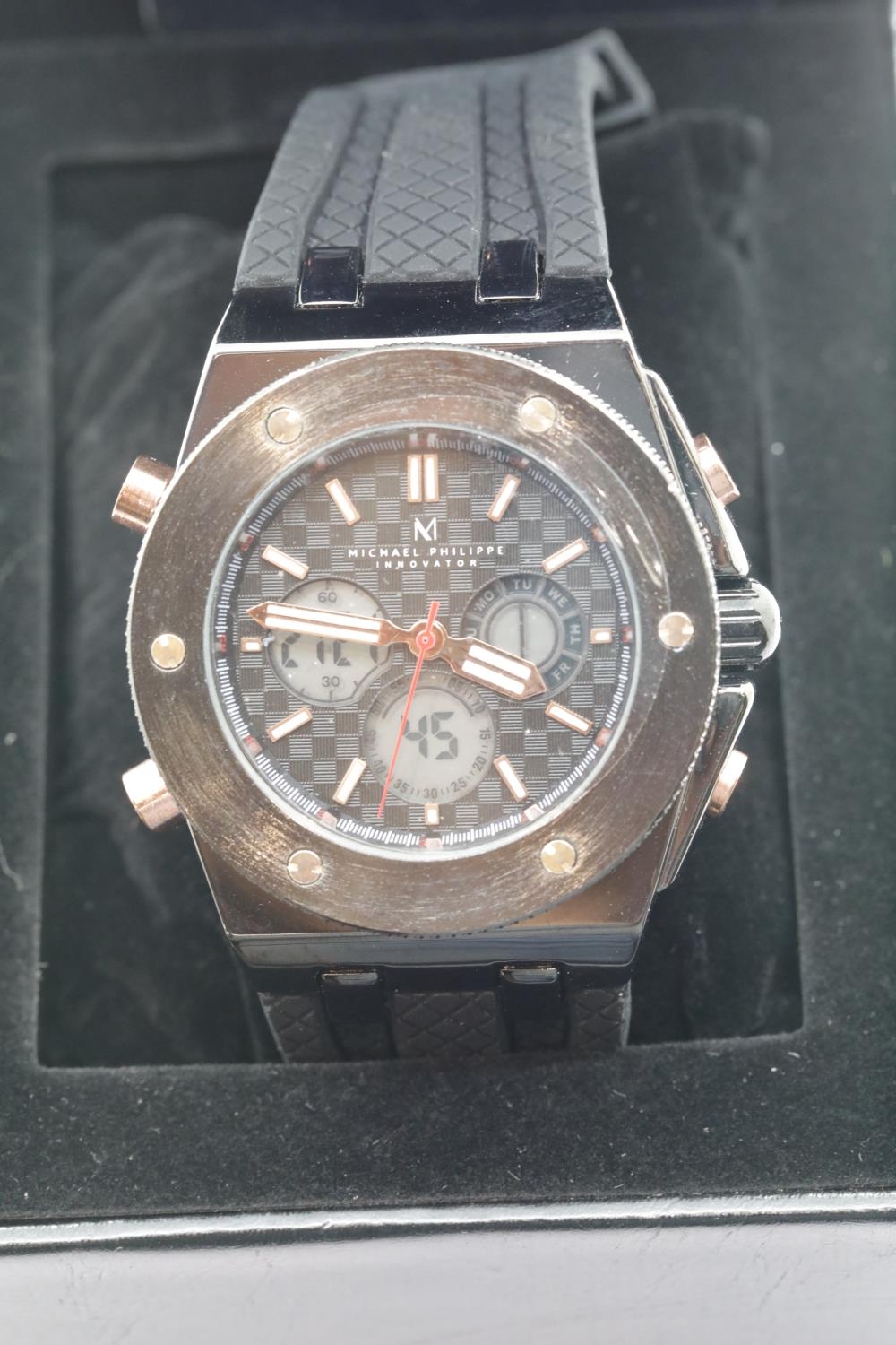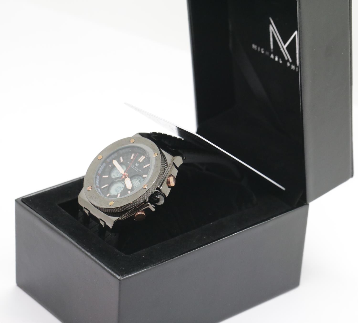 Boxed Michael Philippe mens wristwatch with black dial on black rubber strap. P&P Group 1 (£14+VAT for the first lot and £1+VAT for subsequent lots)