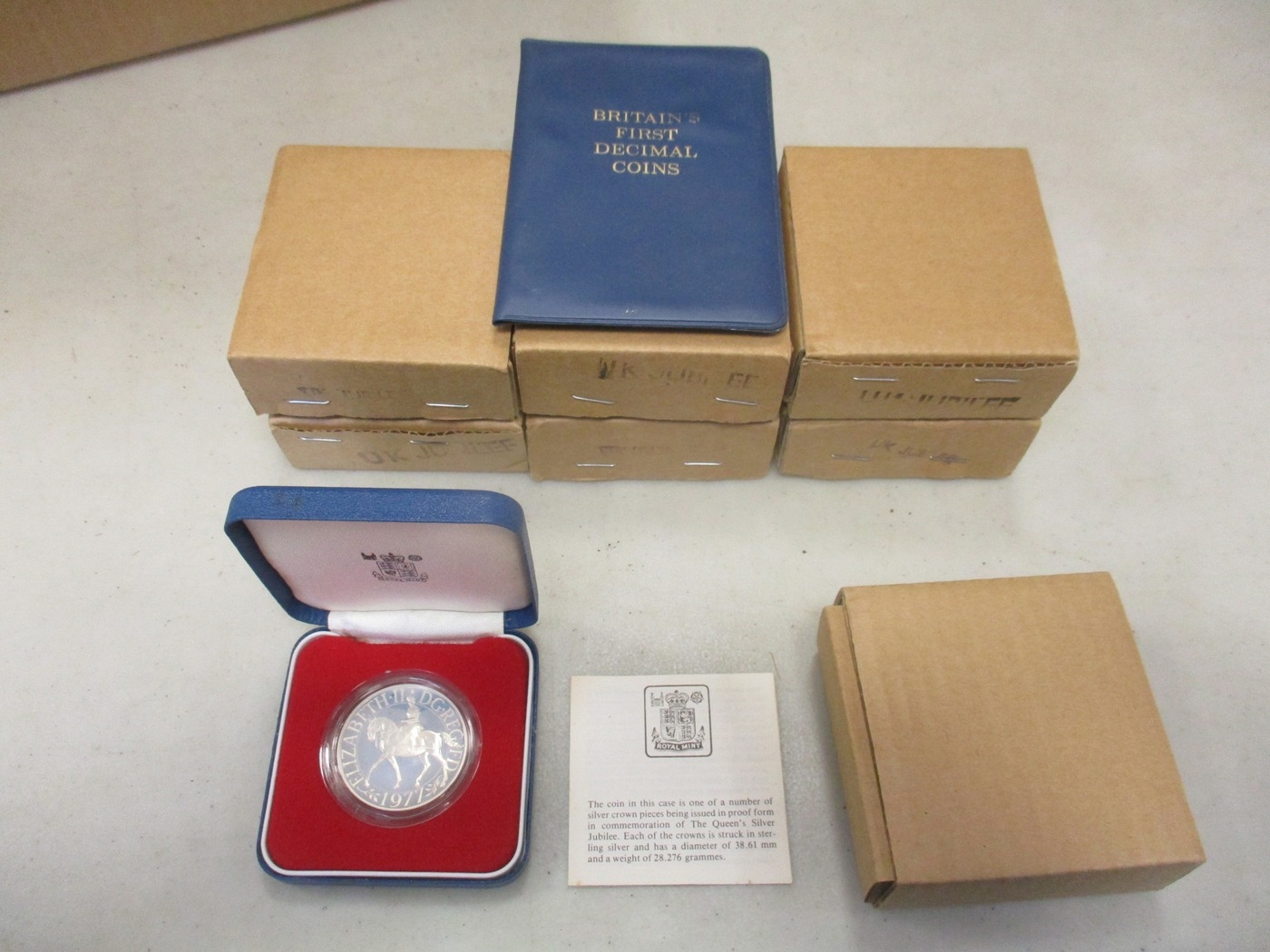 Range of 1977 Silver Jubilee boxed silver proof crowns FDC (7), plus 1970 Britain's First Decimal Coins pack. Qty 8 (T)