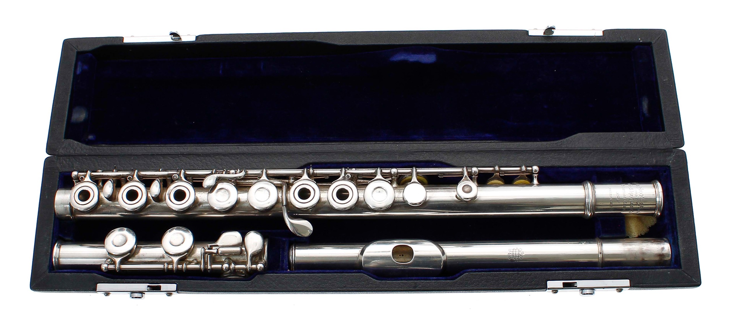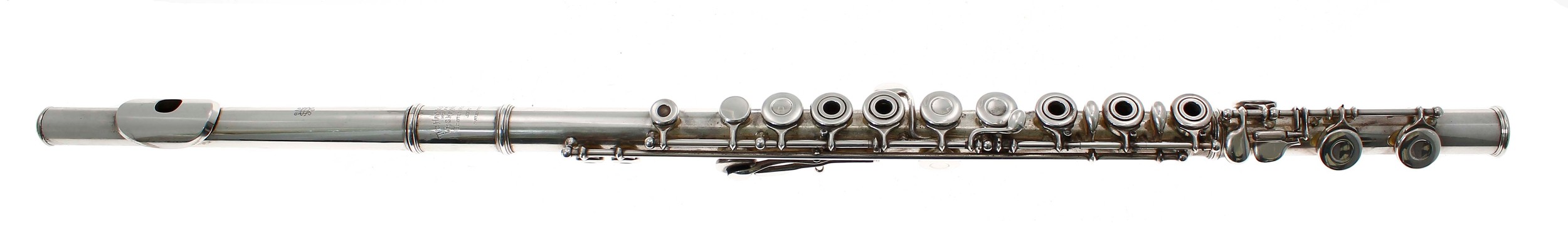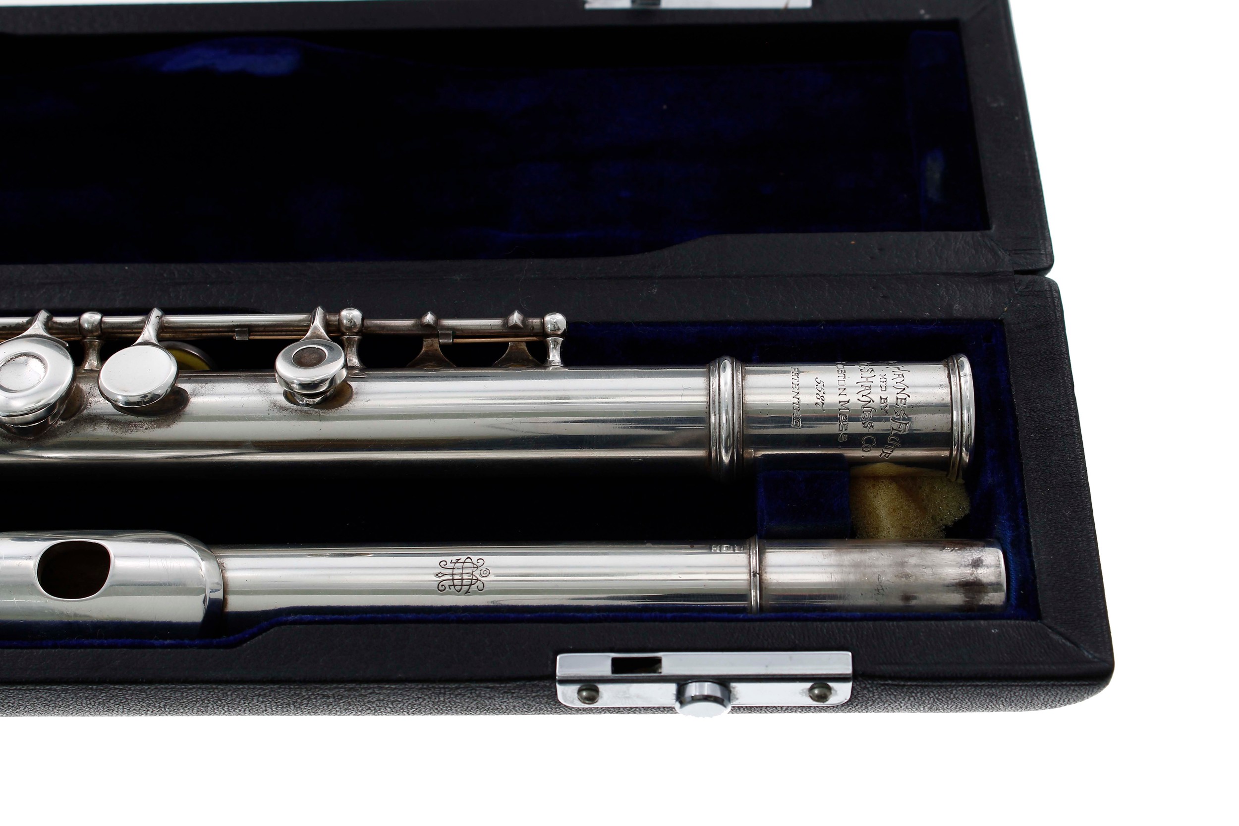 Good solid silver William Haynes French System flute with open holed keys stamped The Haynes Flute, Mfd by Wm.S. Haynes & Co, Boston Mass, no. 5587, Patented, case