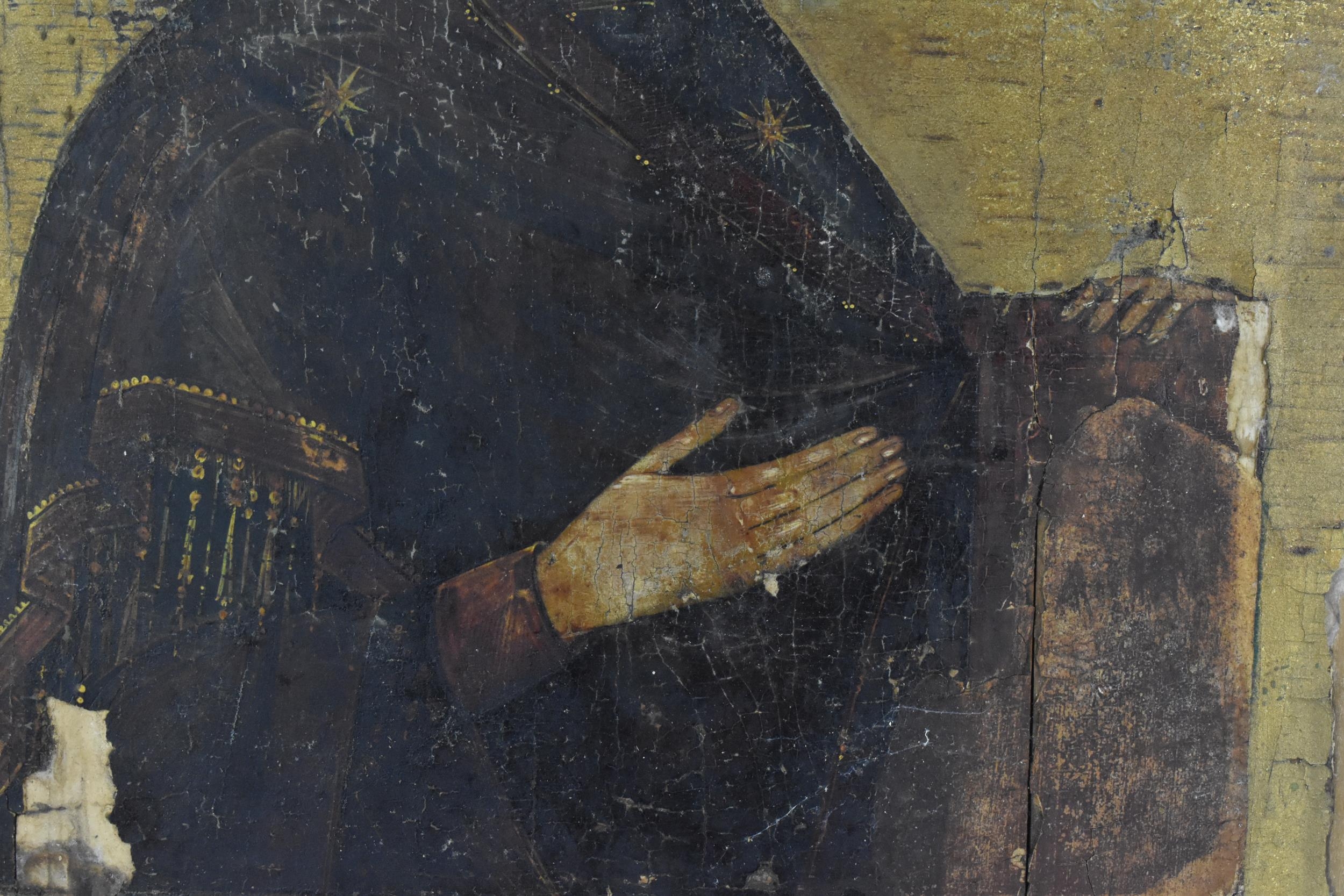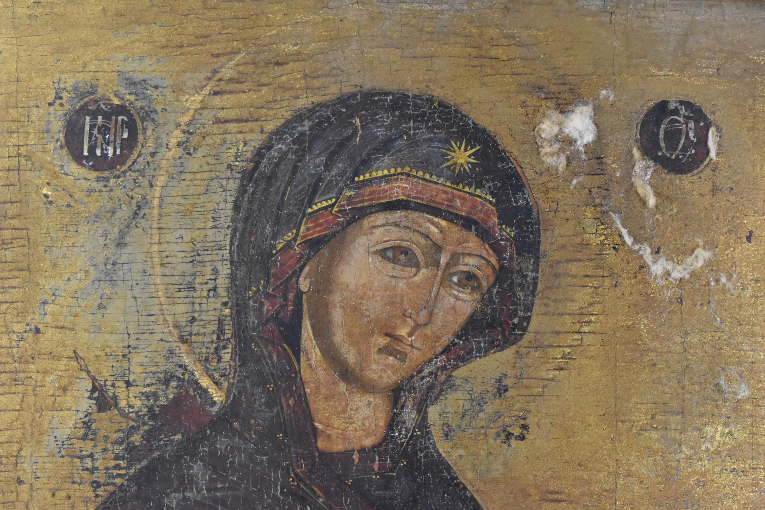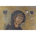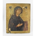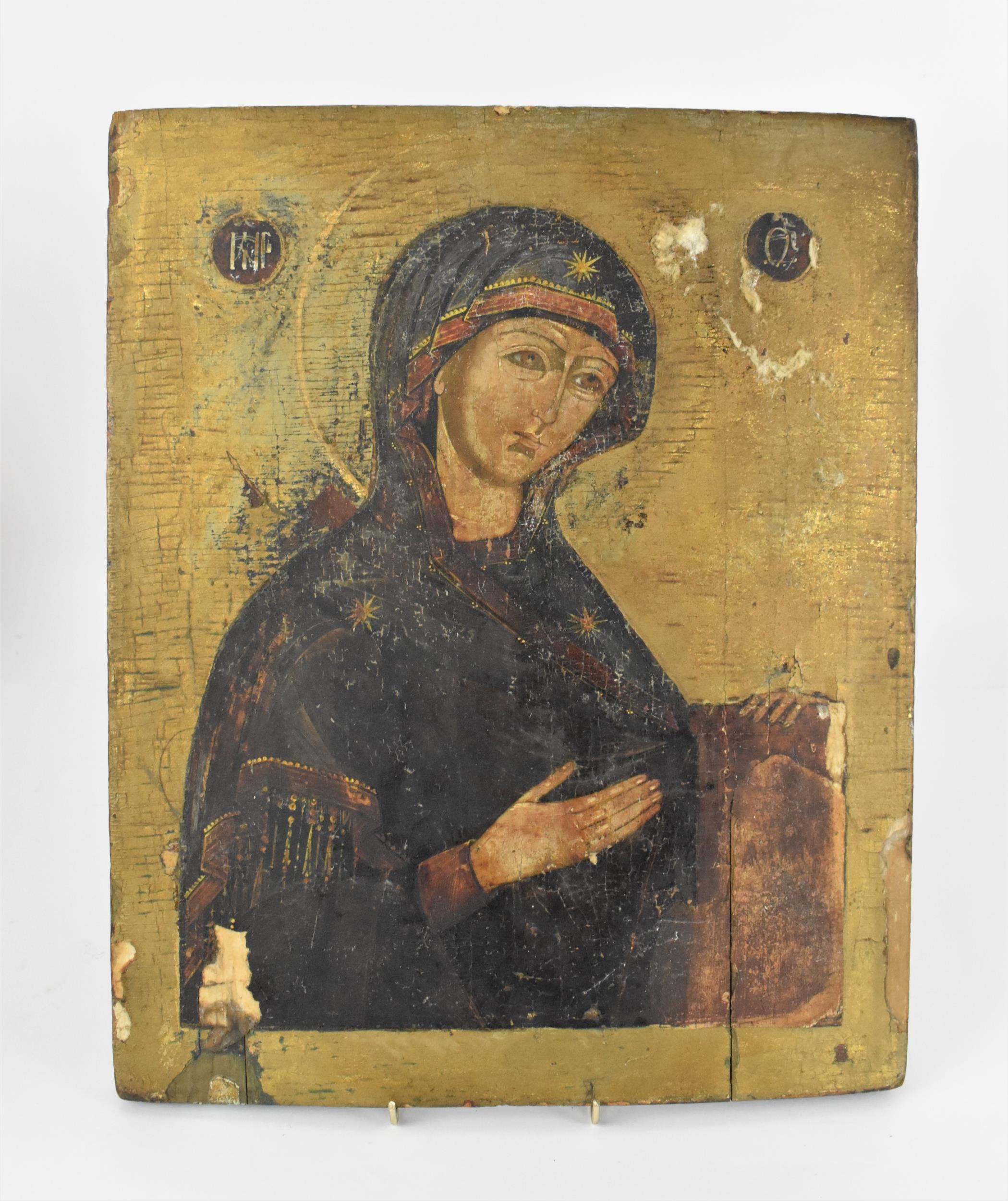 A 19th century Russian icon of The Mother of God, with Cyrillic letters either side of her, tempura on panel with gilt ground, 43 cm x 35 cm