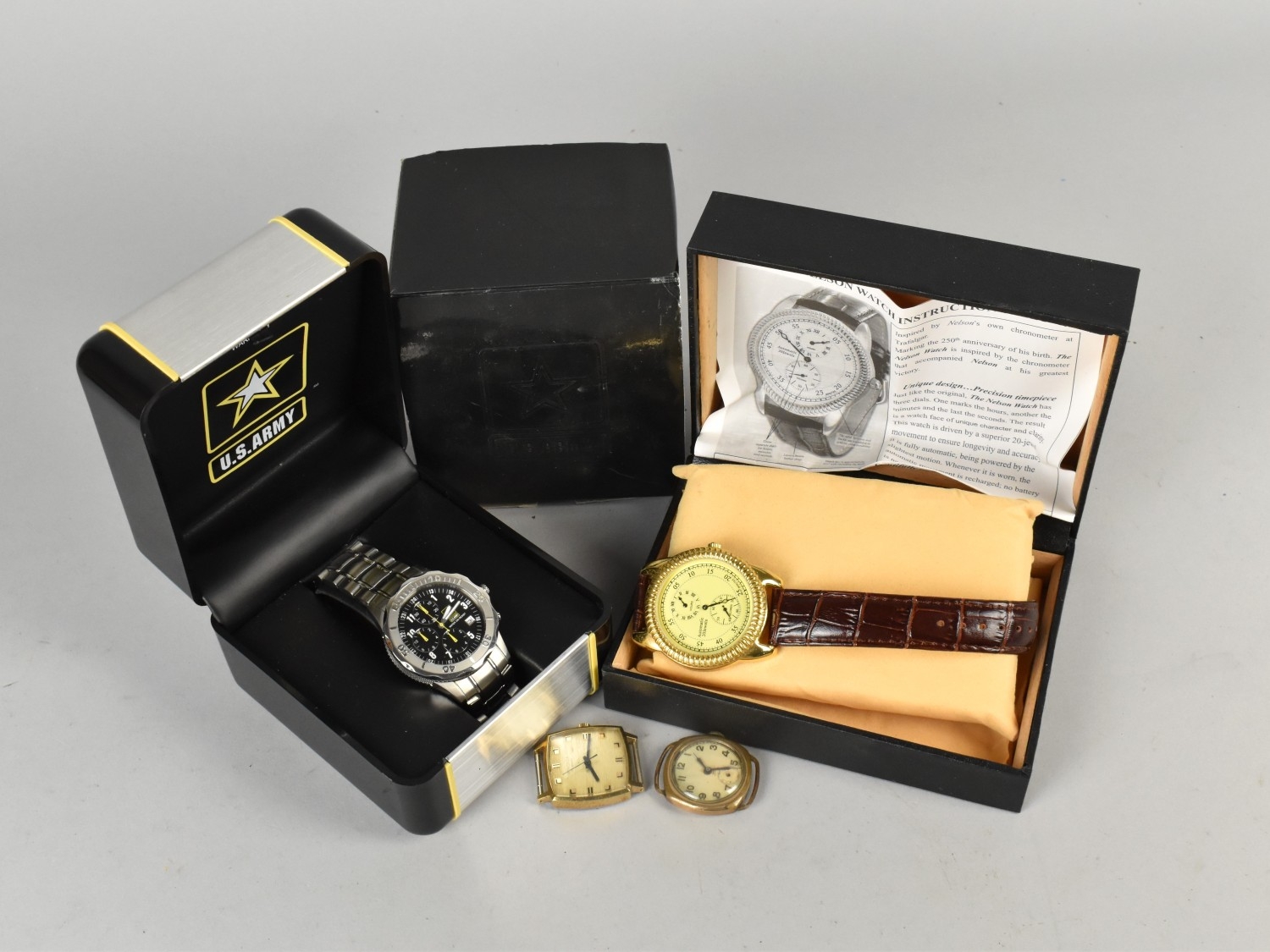 A Collection of Early/Mid and Late 20th Century Wristwatches to include An Early 20th Century Rolled Gold Cased Wristwatch, Signed to the Interior of the Case 'Claridge Meteor', Swiss Movement with Fifteen Jewels, Currently Running, A Sekonda Gold Plated Example with Square Face (Non Running), A Commemorative 250th Anniversary Nelson Automatic Wristwatch, Boxed, A Stainless Steel U.S.Army Wristwatch (Boxed)