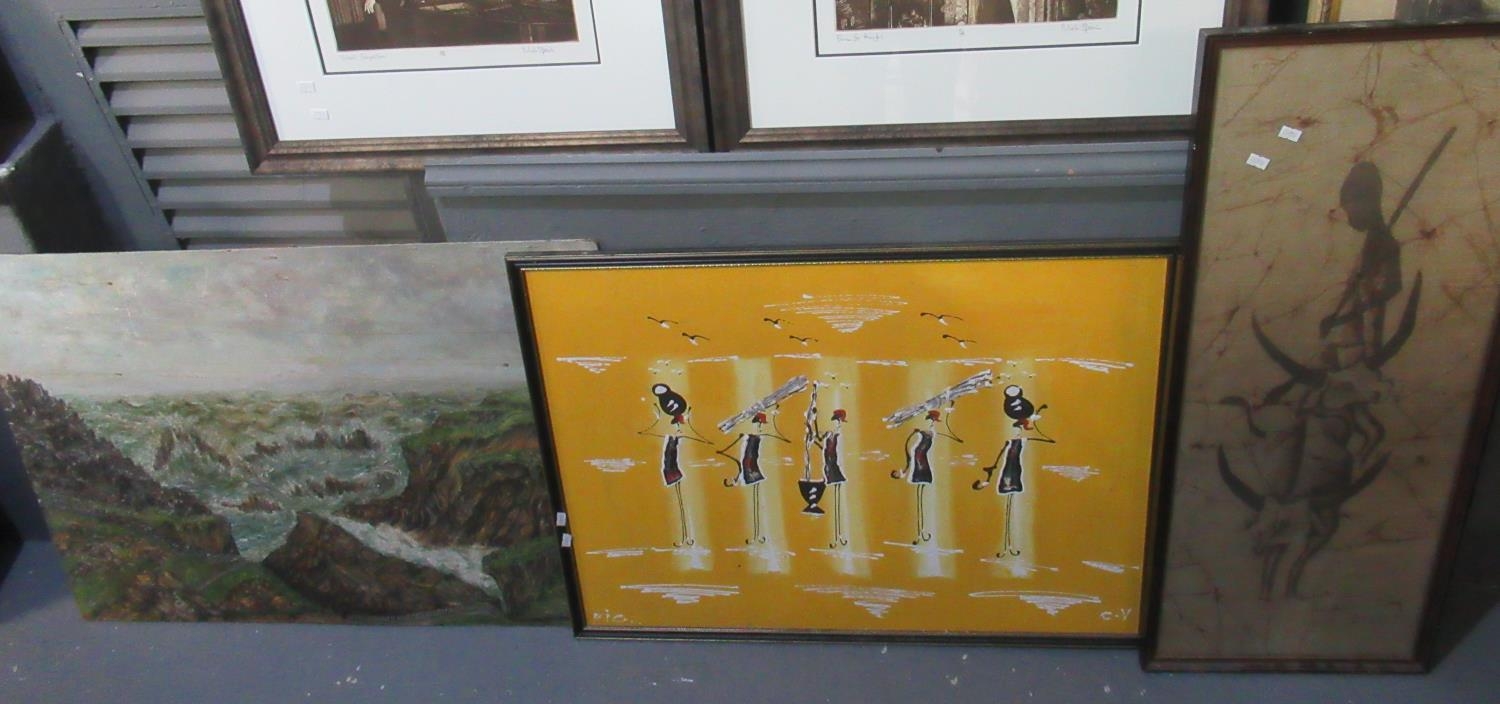Cliff Top Seascape in oils, unsigned on board, together with modern figure study in oils on yellow background, and an African subject print (3)