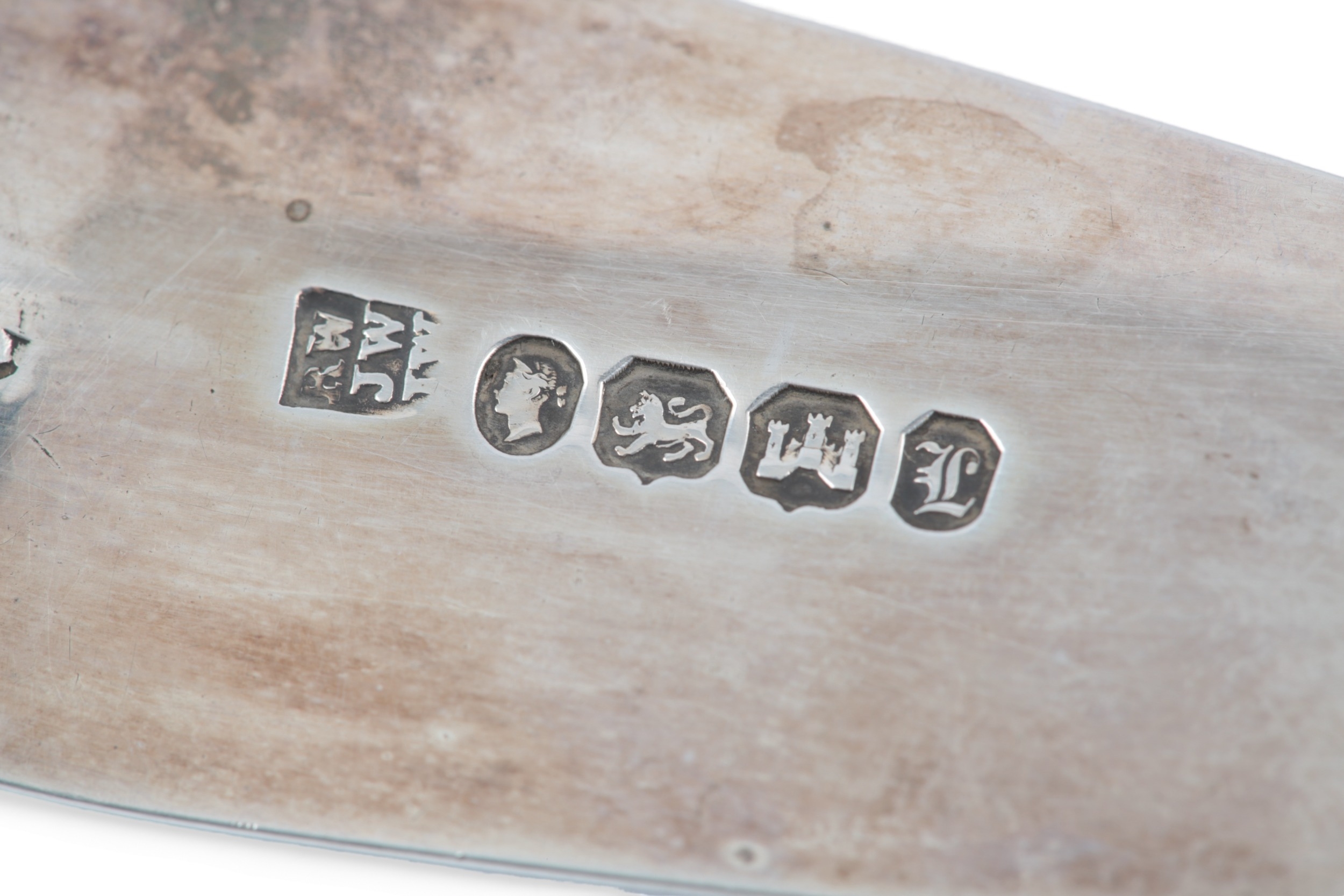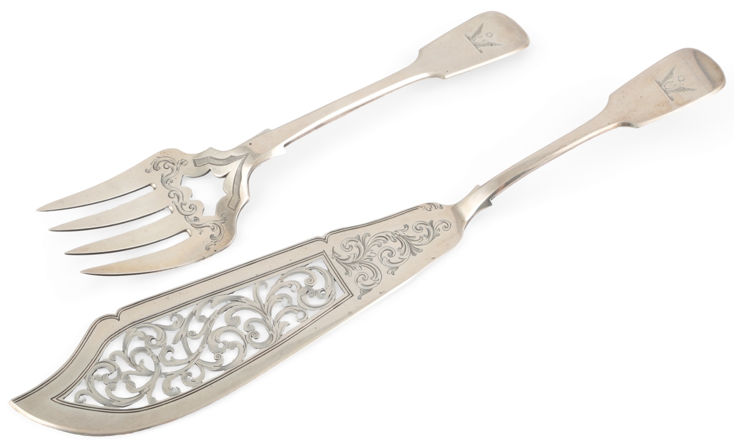A pair of early Victorian provincial silver fiddle pattern fish servers by Robert Williams & Sons, with pierced and engraved scroll decoration and engraved armorial, Exeter, 1847, knife 32.6cm, 7.5oz.