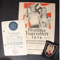 Militaria, Germany, Third Reich, album of documents and other items relating to Alfred and Robert Gunkel, Deutsches Jugendfest 1934 certificate; Fahrtenschwimmer certificate 1939 with cloth badge; Deutsche Stenografenschaft certificate and cloth badge; Soldier's Book, Iron Cross 1st Class, Iron Cross 2nd Class; Hitlerjugend book and badge; Prisoner of War Card; many other official documents and certificates [*41]