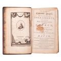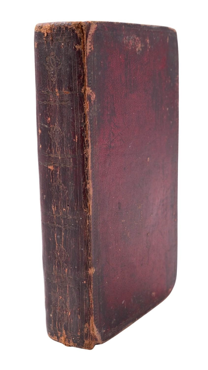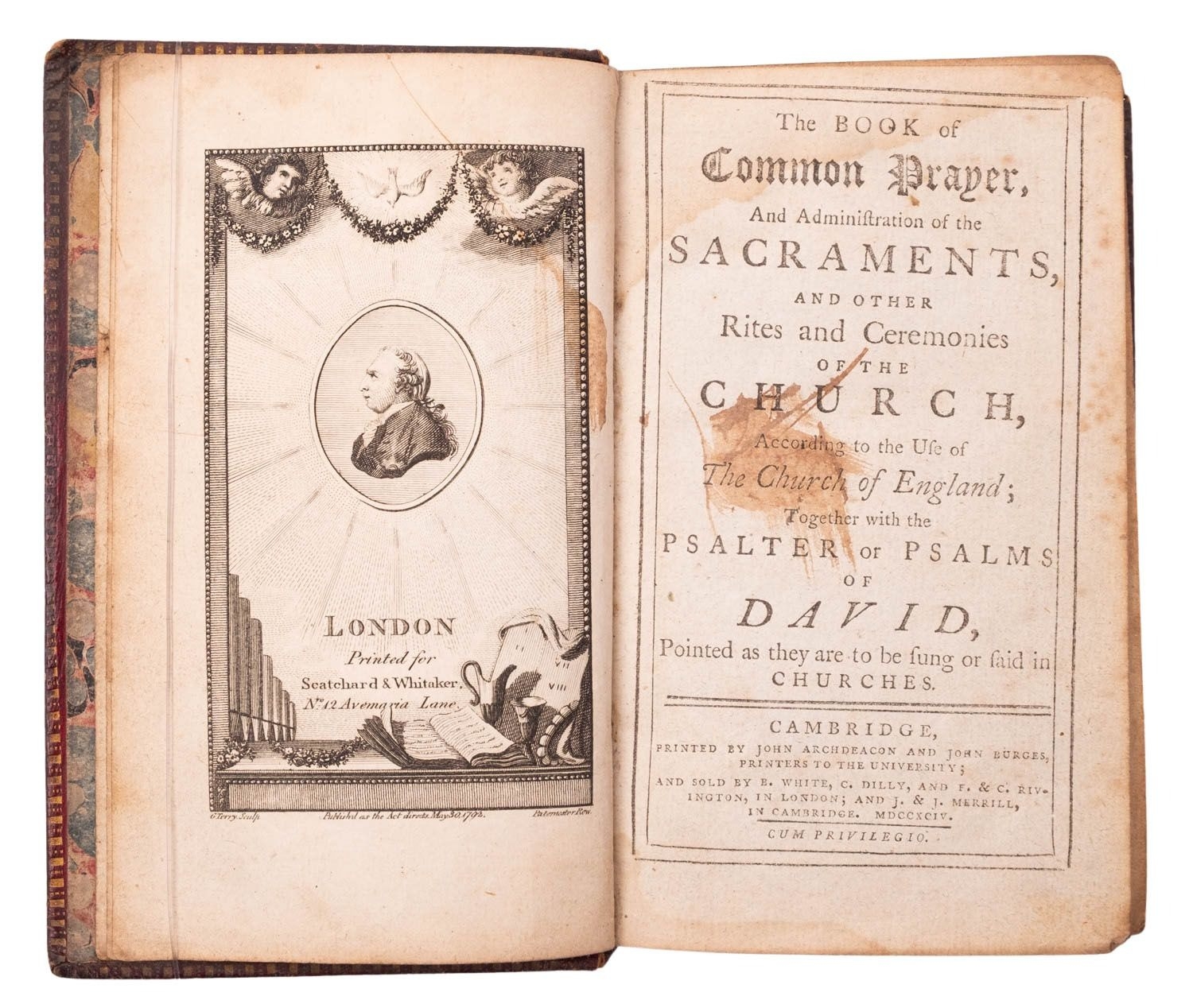 BOOK OF COMMON PRAYER. The Book of Common Prayer, and Administration of the Sacraments..., Cambridge: Printed by John Archdeacon and John Burges, 1794, engr. frontis., letterpress title, 17 engr. plates, contemp. ink ownership inscription verso to ffep, bound with The Whole Book of Psalms, collected into English Metre..., Oxford: Printed at the Clarendon Press..., 1793, letterpress title, some spotting/soiling and edgewear, contemp. decoratively panelled claret red morocco gilt with foliate designs to spine compartments, scuffed/bumped and cracking to joints, marbled endpapers, 12mo.