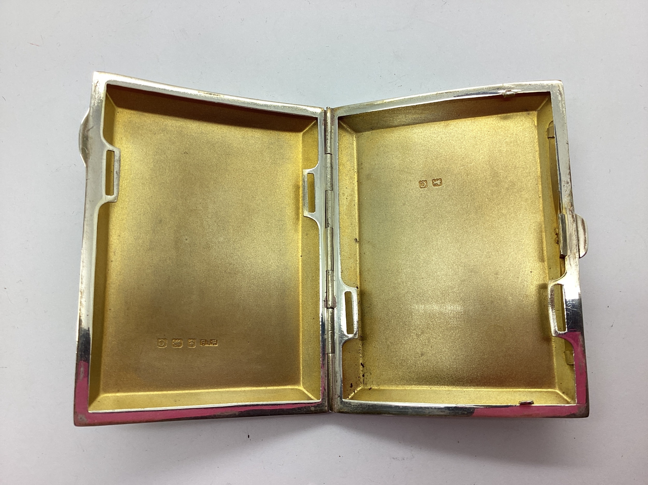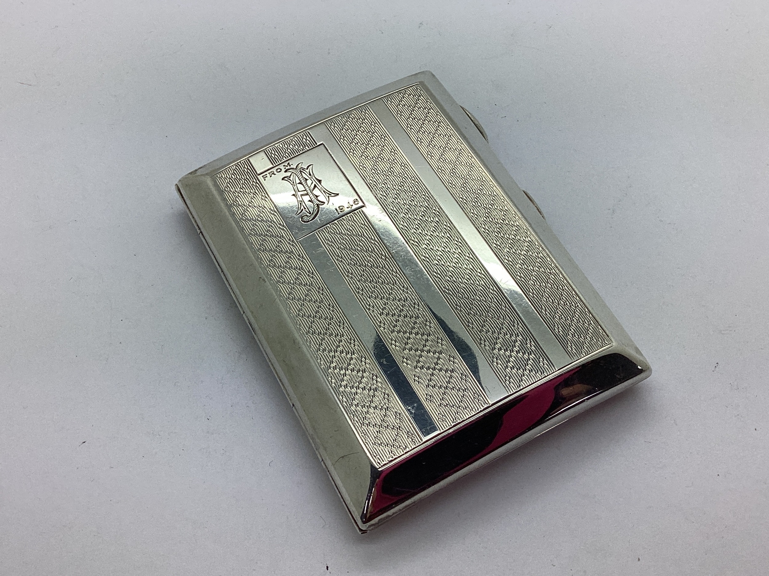 A Hallmarked Silver Cigarette Case, HL Brown, Birmingham 1927, of rectangular form, allover engine turned decoration, initialled and inscribed date 1946, gilt lined (85grams).