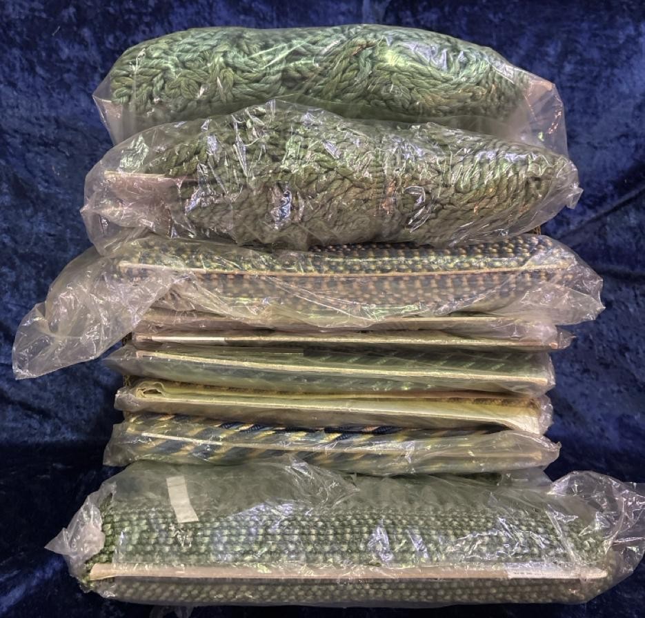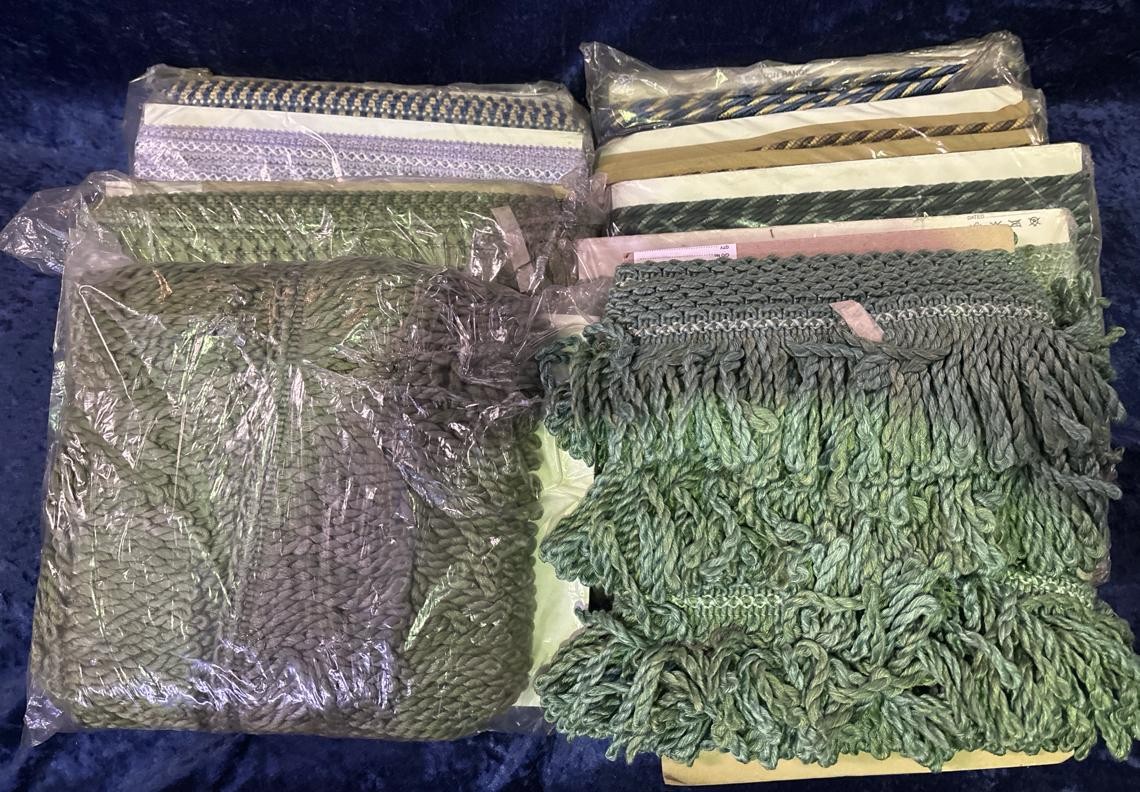 Box of upholstery fringes and braids. Mix of colours and styles.