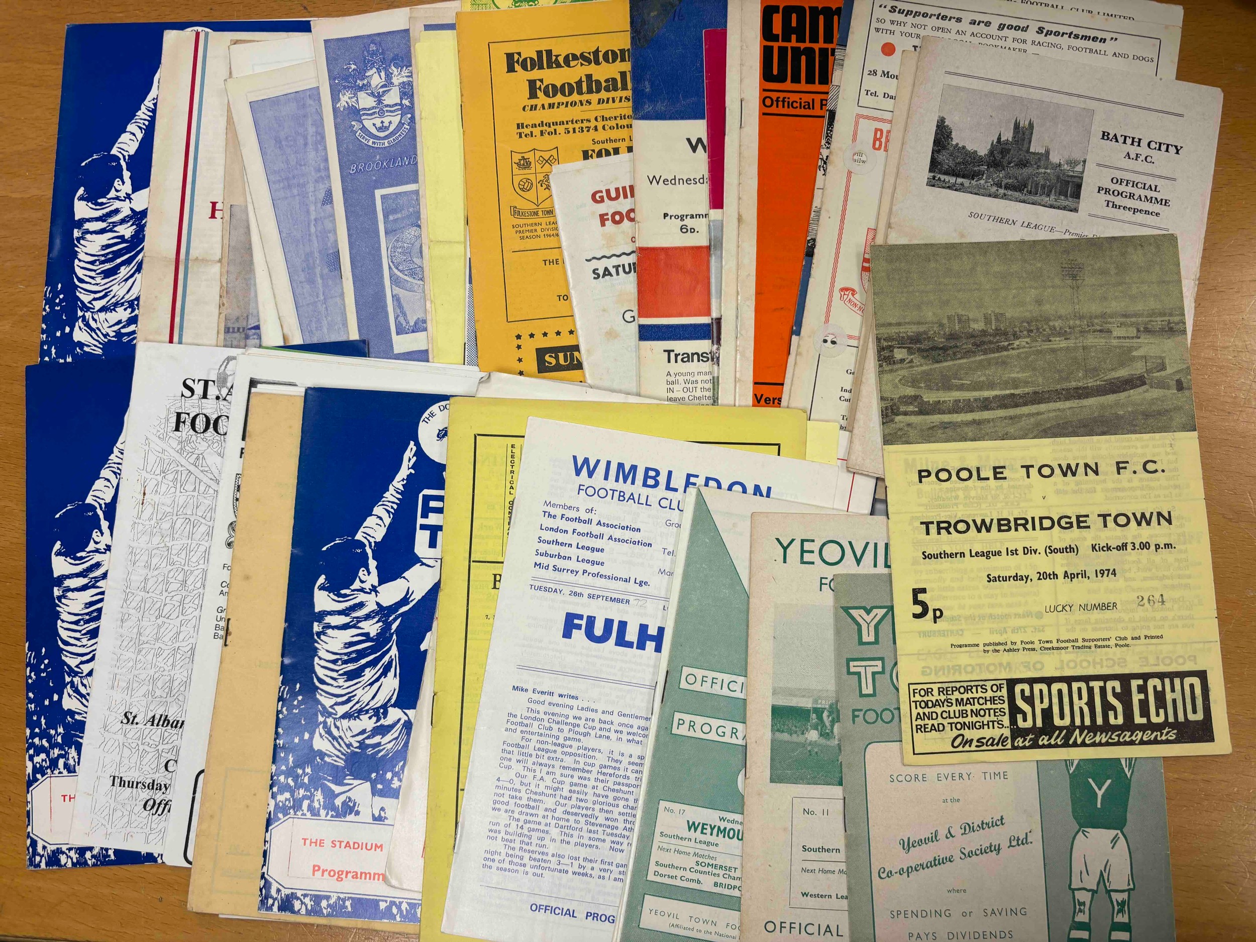 Non-league Football Programmes; 40 plus Late 1950's onwards includes 1958/9 Yeovil v Portland, 1961/2 Barnet v Fulham Reserves,196/7 Highgate Utd v Enfield Amateur Cup @ Villa Park, 1967/8 Marine v Barrow Reserves and 1972/3 Wimbledon v Fulham London Challenge Cup, very slight duplication, three have punch-holes, most others good to very good (40+)