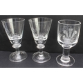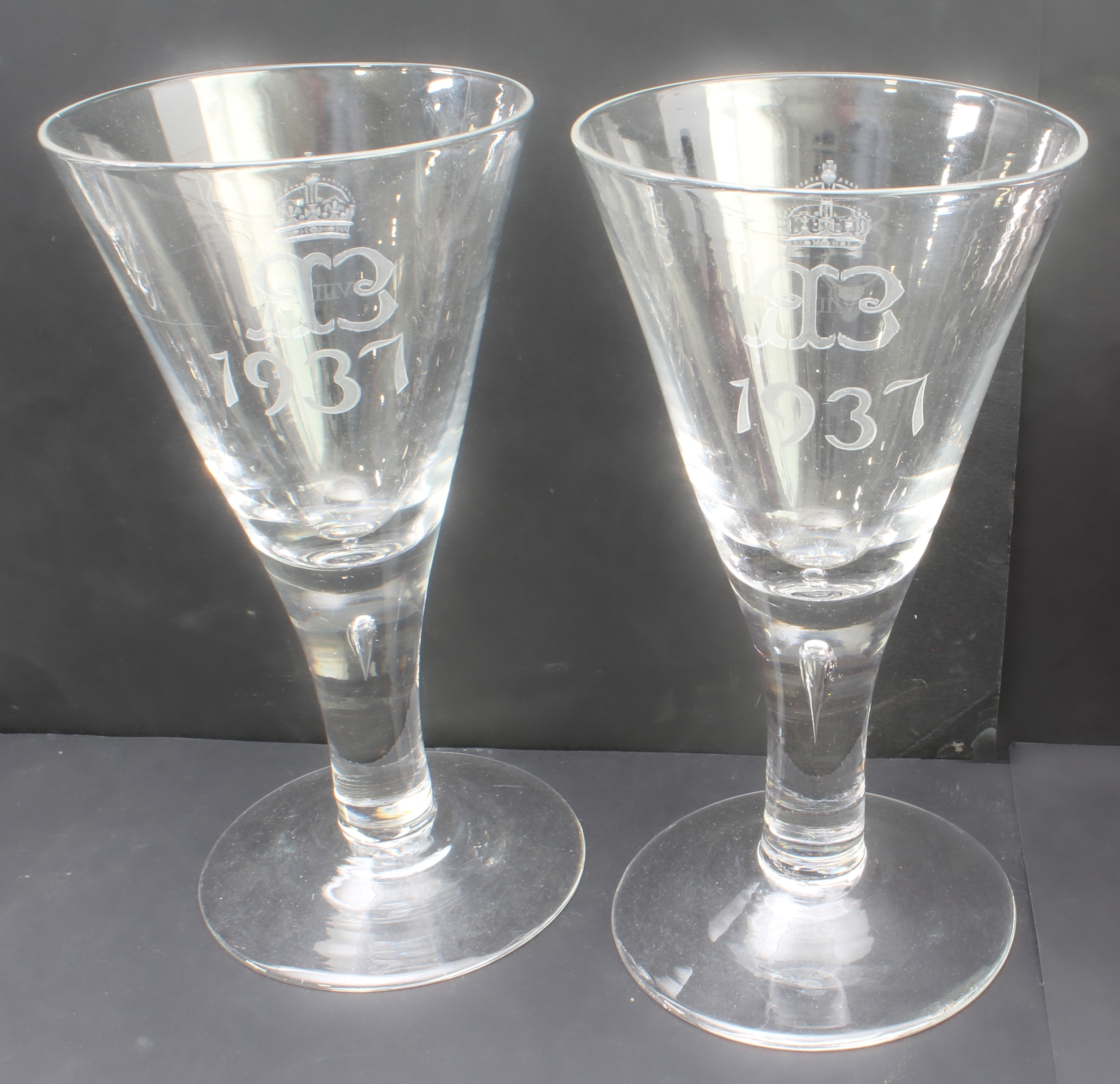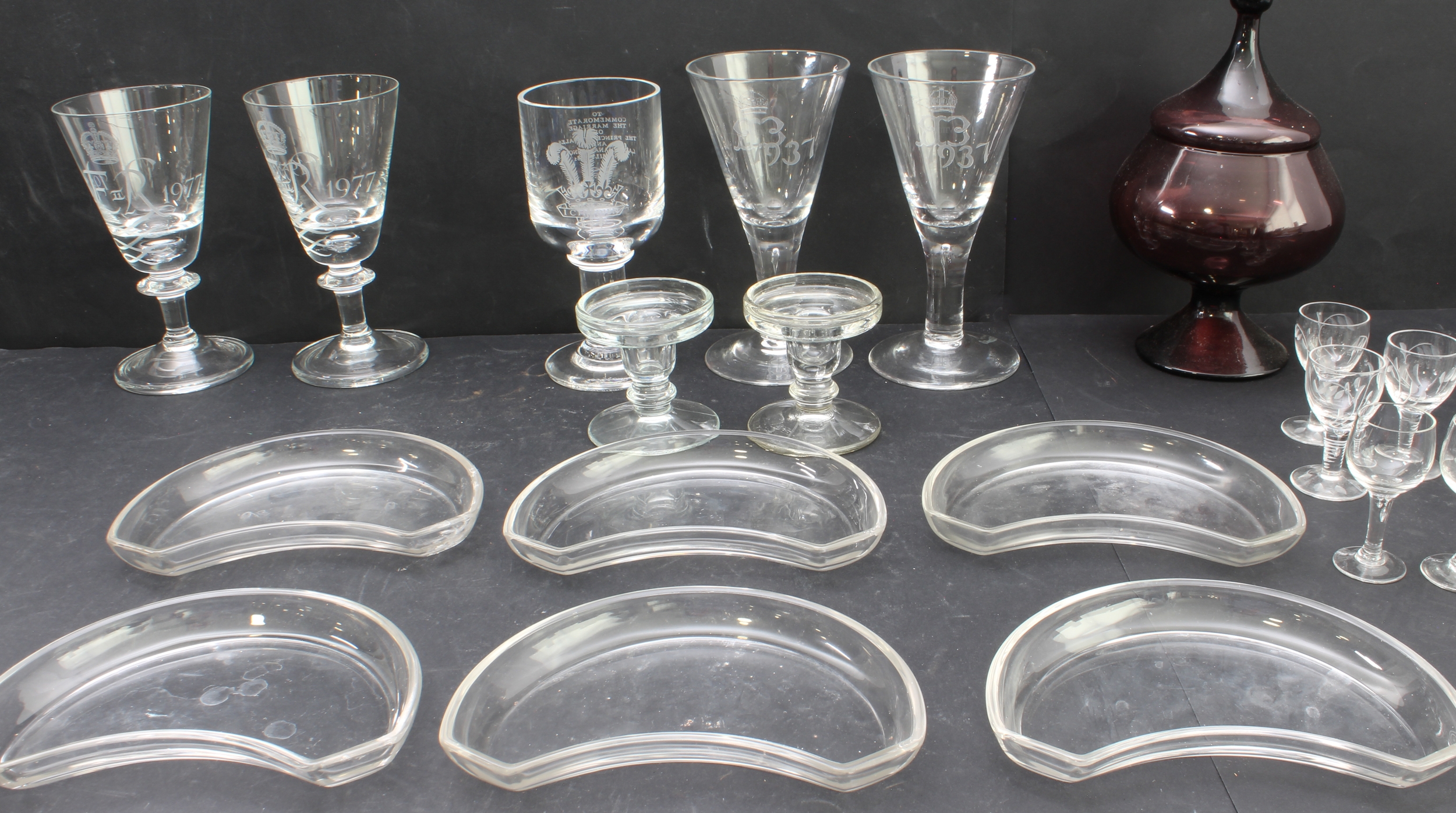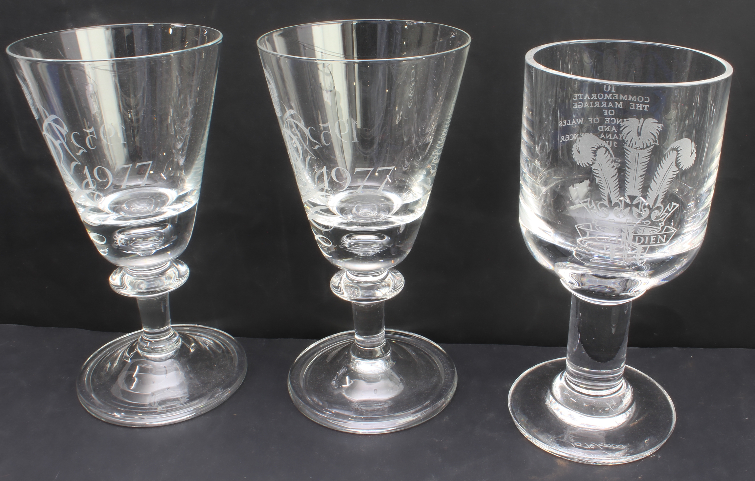 1. five large and heavy royal commemorative engraved conical goblets (2 x 1937 Edward VIII, 2 x 1977 Queen Elizabeth II silver jubilee and 1 x 1981 royal wedding (Dartington 1076 of 5,000). (Each approx. 20 cm high).