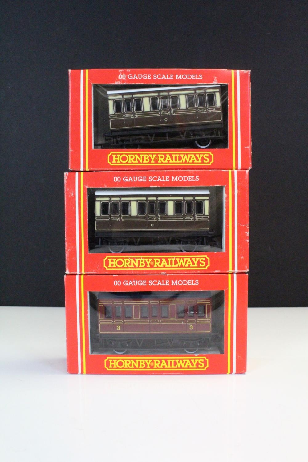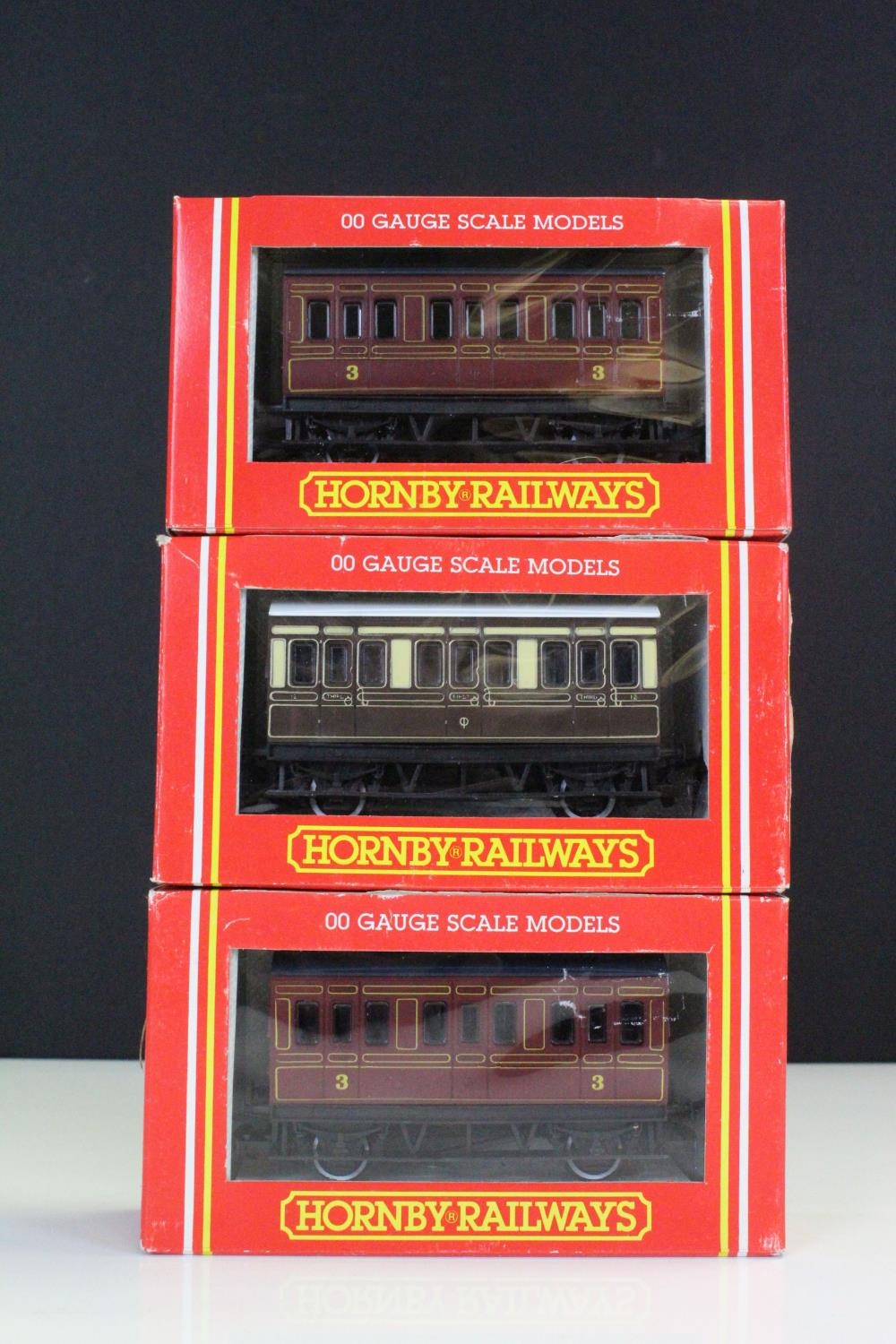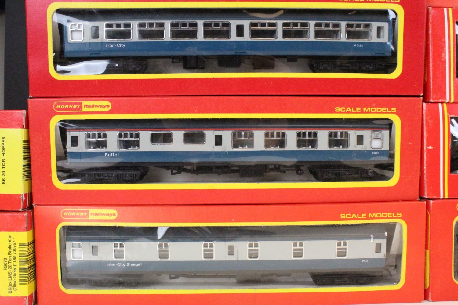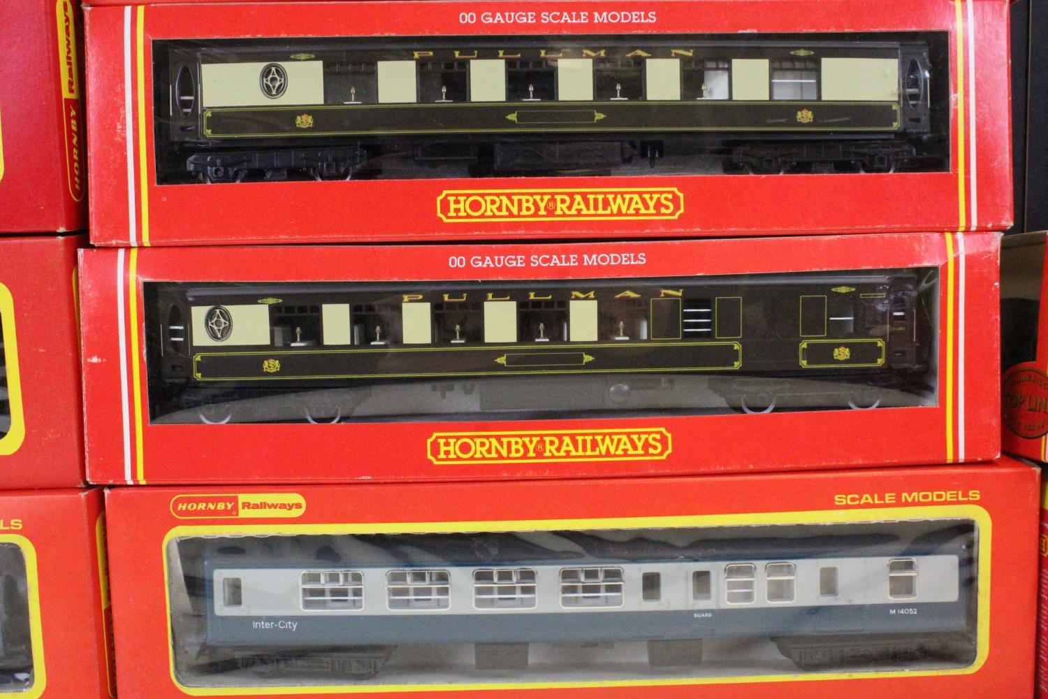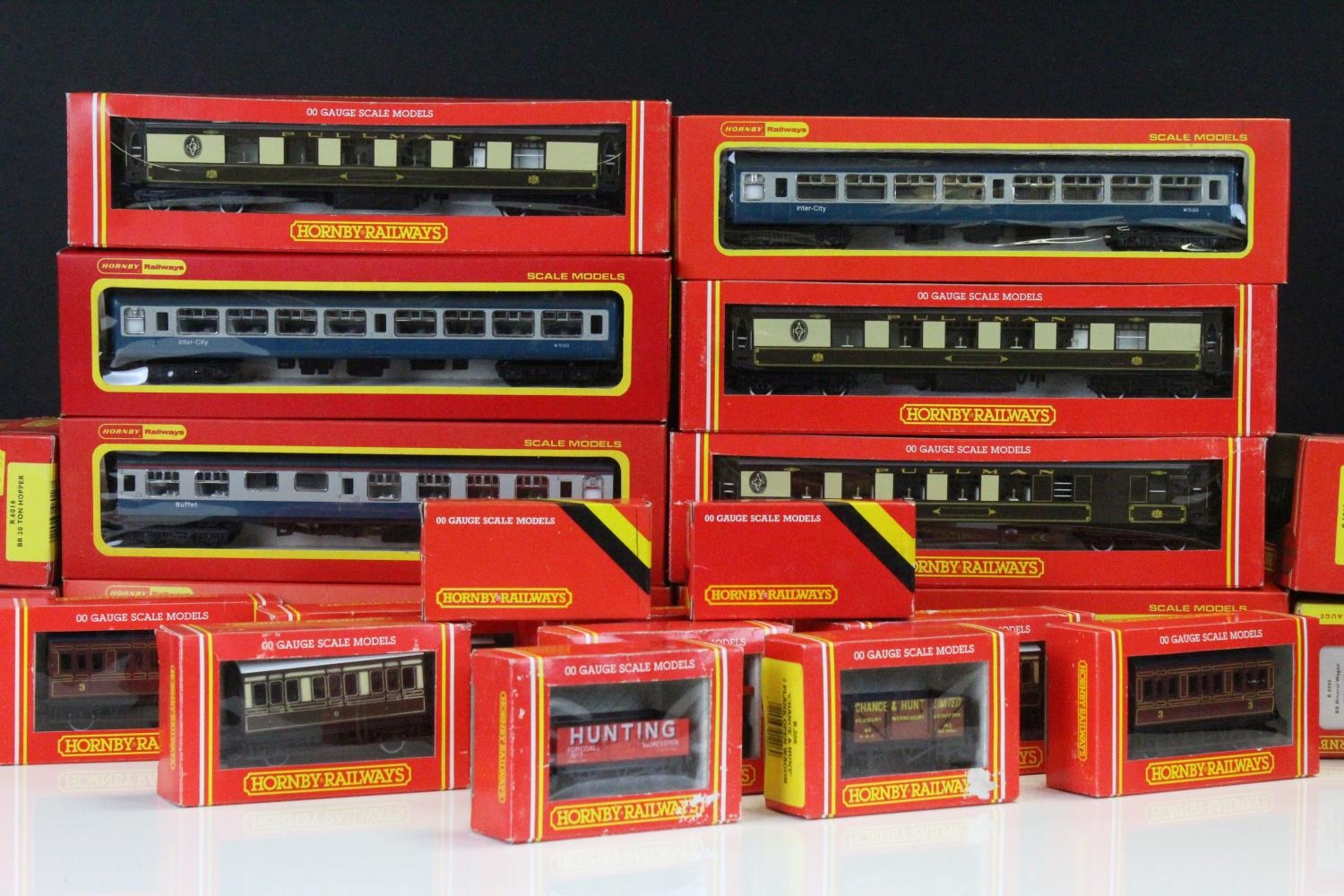 Ex Shop Stock - 27 Boxed Hornby OO gauge items of rolling stock to inclde 2 x R724 BR Intercity 2nd Coach, R223 Pullman First Parlour Coach, R043 Railiner Curtain Side Van PVB etc