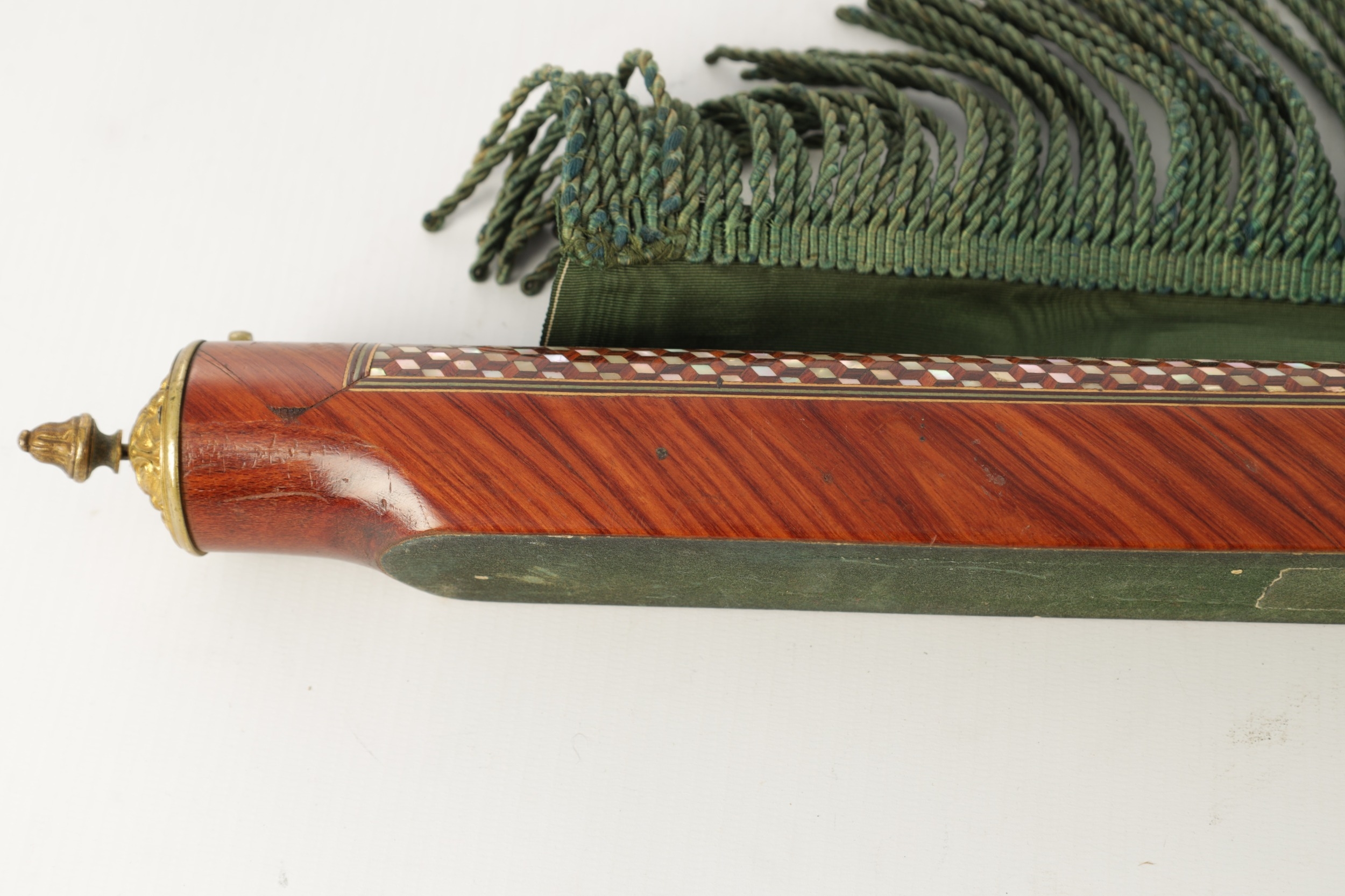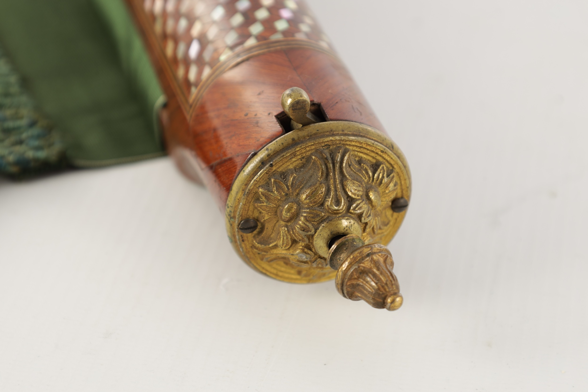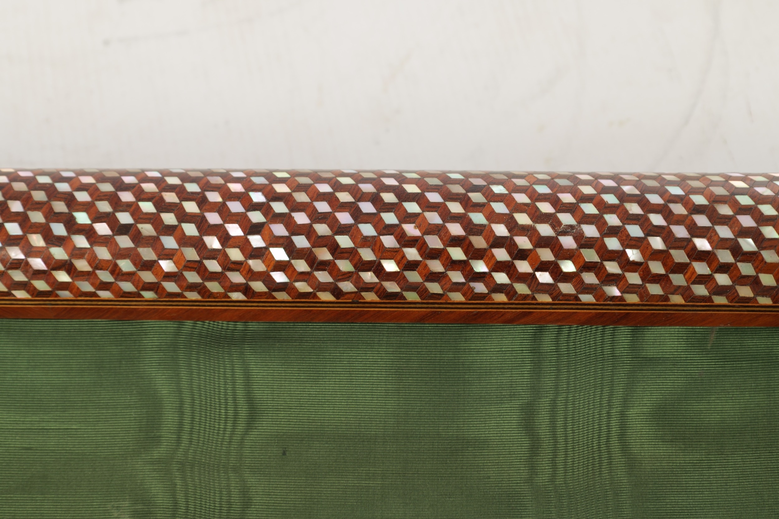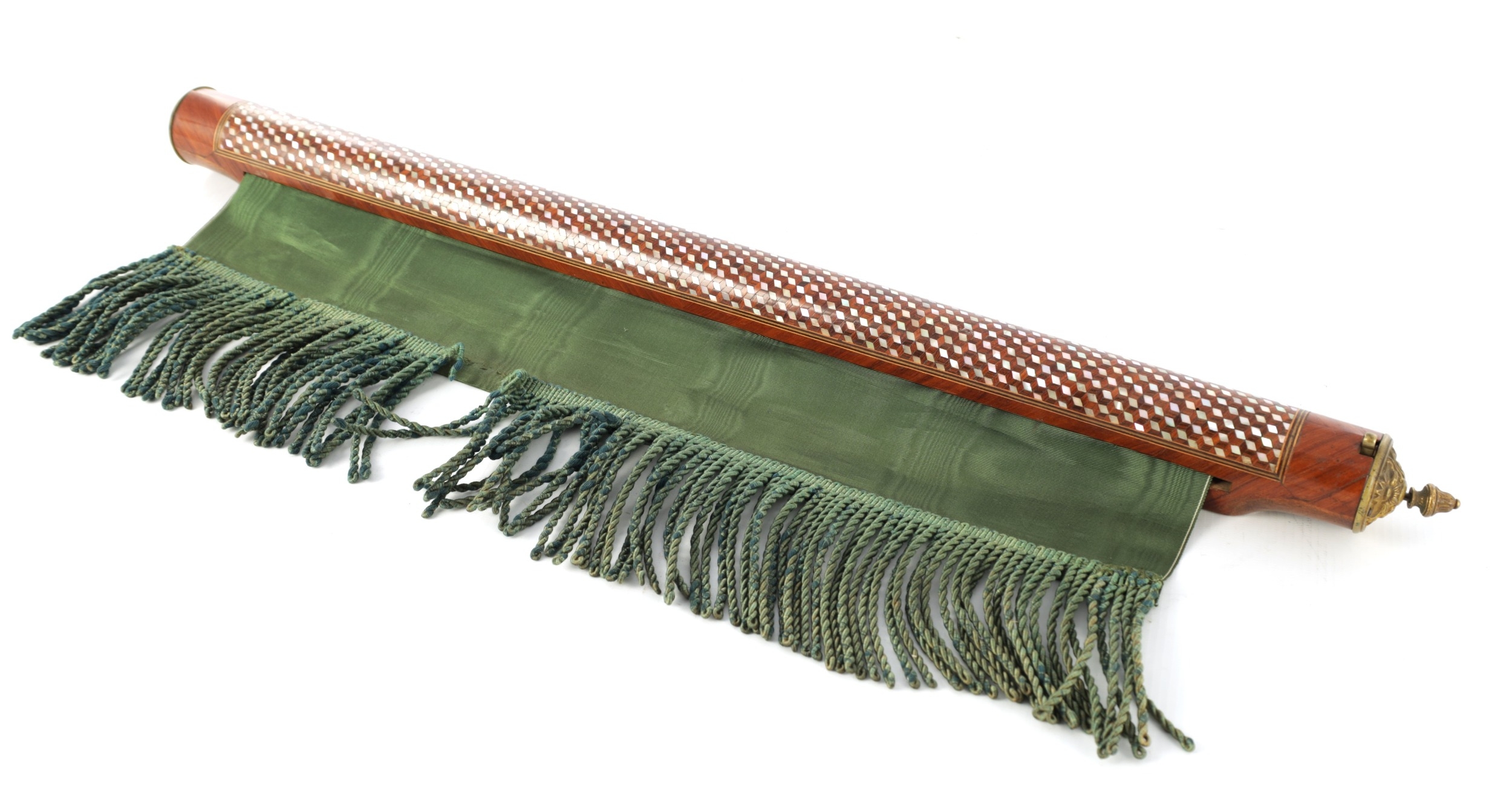 A HIGH RANKING LATE 19TH CENTURY KINGWOOD AND MOTHER OF PEARL PARQUETRY ISLAMIC PRAYER MAT the cylindrical panelled top with sprung brass catch releasing a green watered silk fringed drop. (64cm wide 73cm opened)