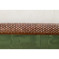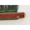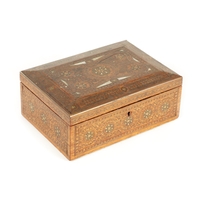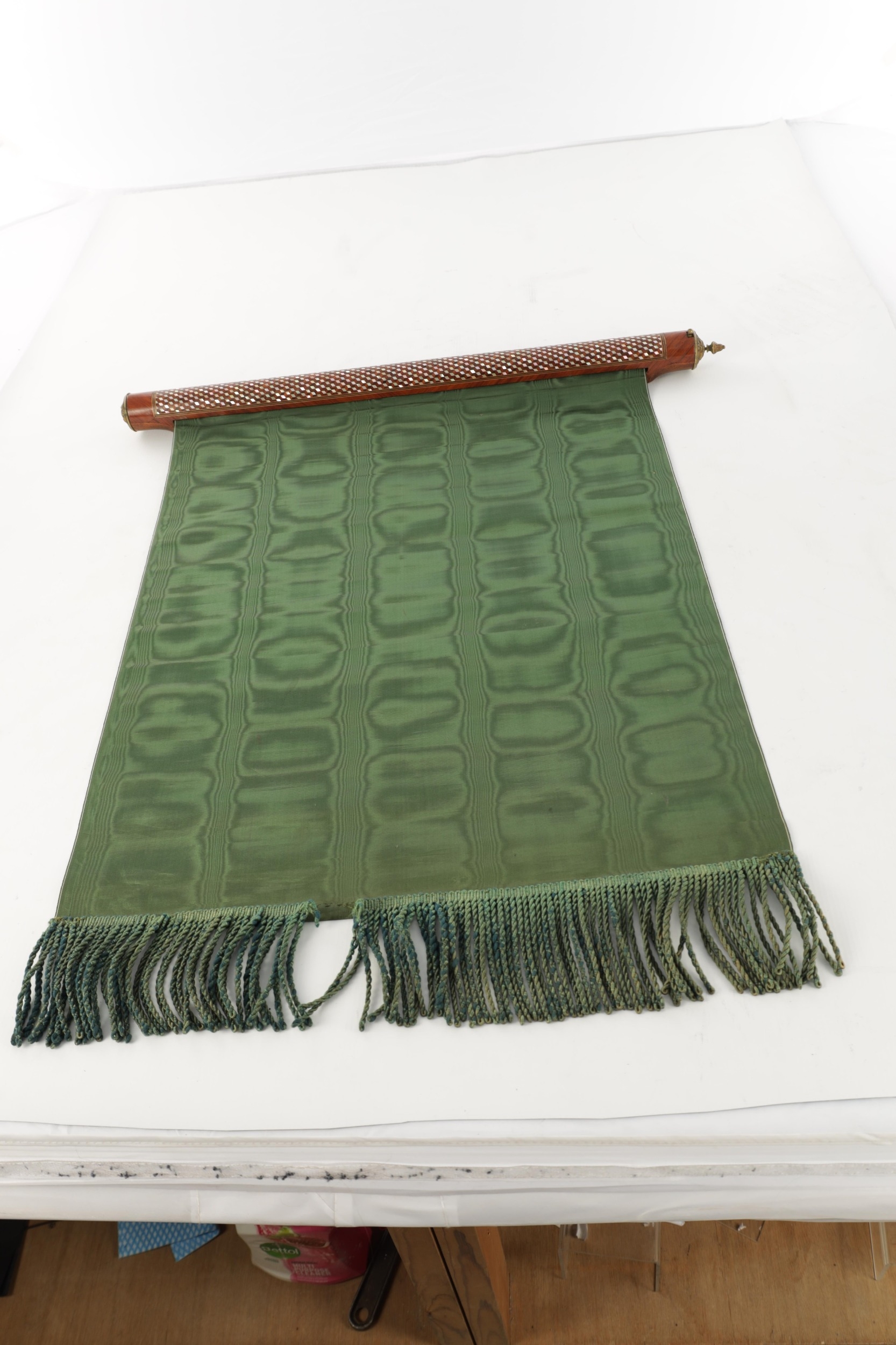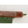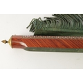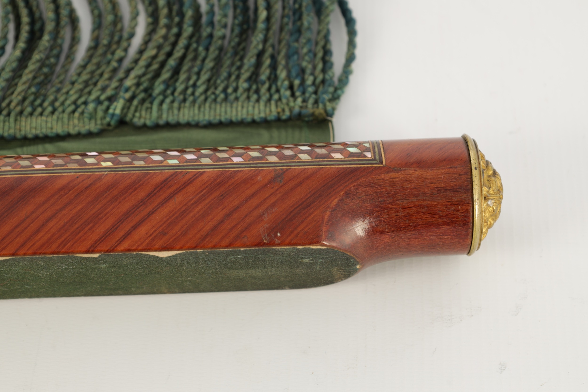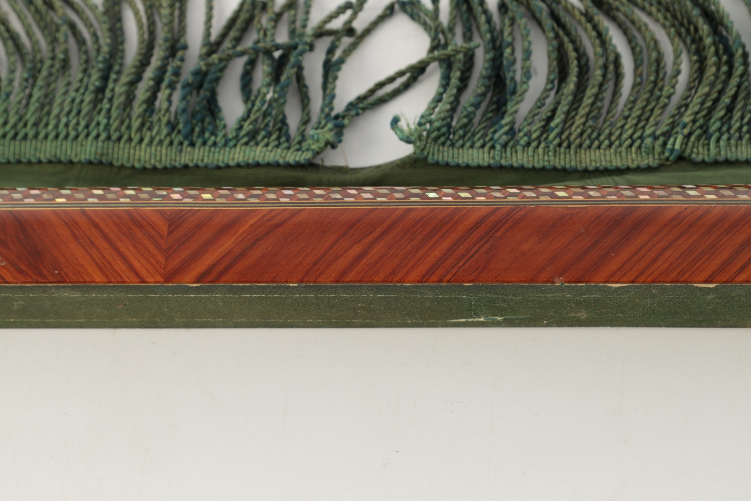 A HIGH RANKING LATE 19TH CENTURY KINGWOOD AND MOTHER OF PEARL PARQUETRY ISLAMIC PRAYER MAT the cylindrical panelled top with sprung brass catch releasing a green watered silk fringed drop. (64cm wide 73cm opened)