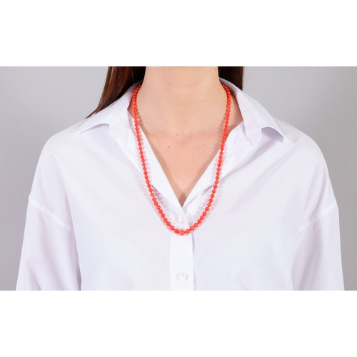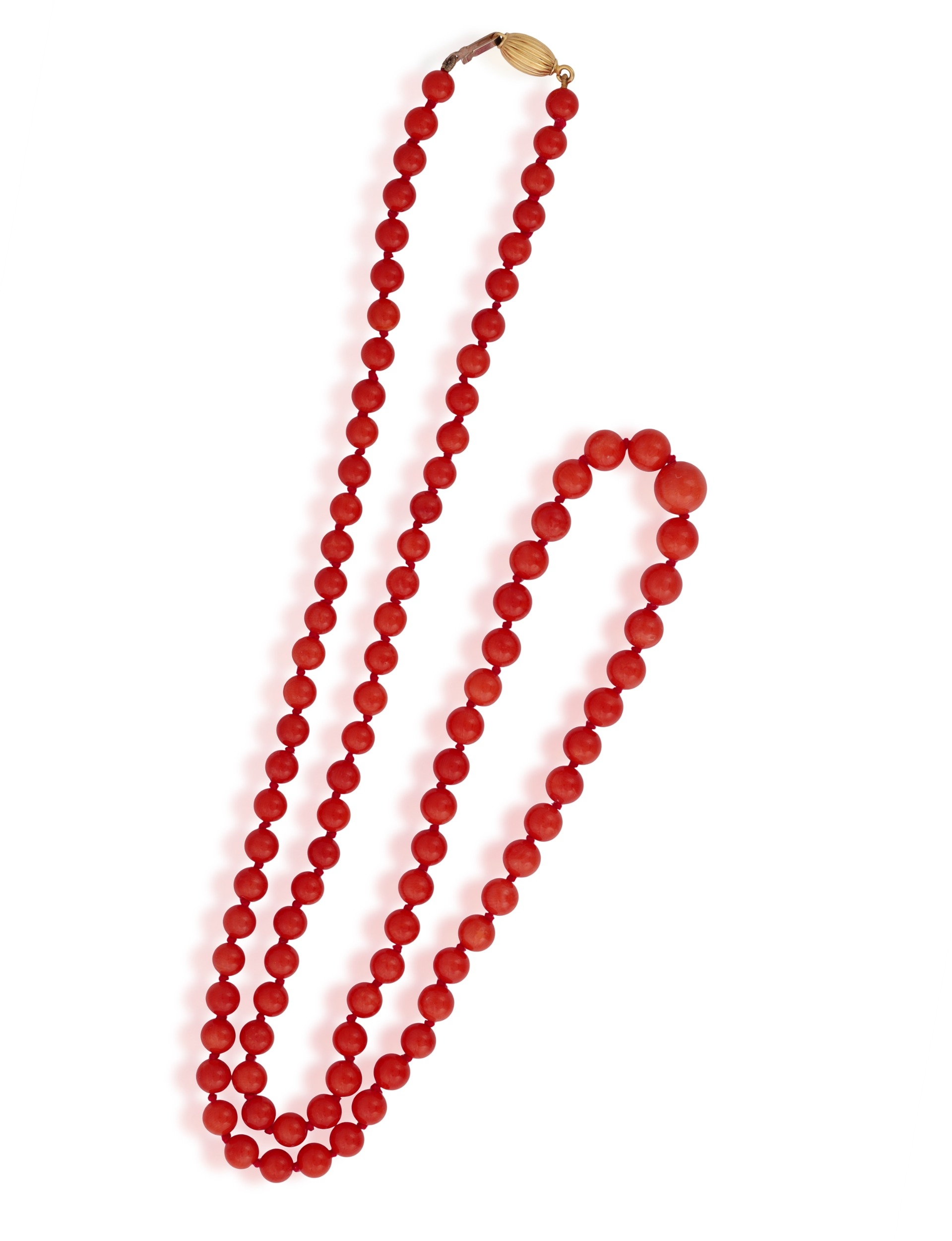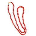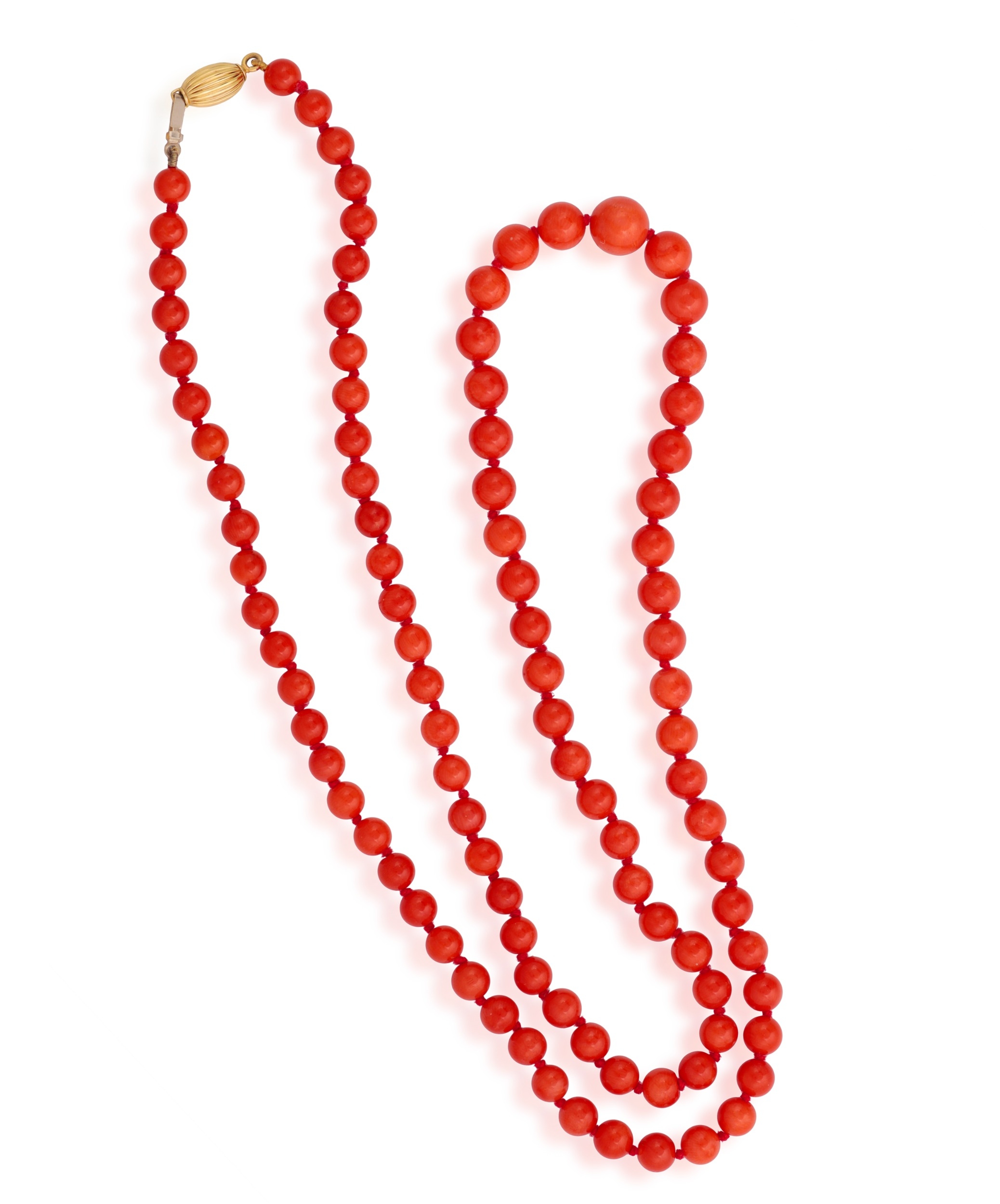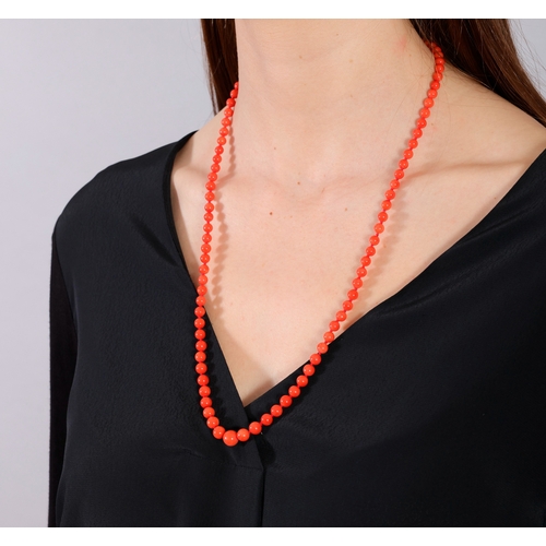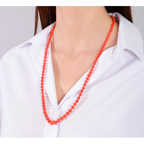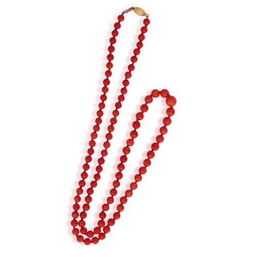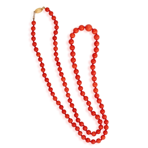 A CORAL BEAD NECKLACE The single strand set with graduated coral beads, measuring from 5.6 to 8.8mm, to an oval-shaped clasp of reeded design, clasp in 18K gold, length 68cm *Prospective buyers are advised that several countries prohibit the importation of items containing materials from endangered species, such as coral. Therefore, buyers should familiarise themselves with relevant customs regulations before bidding if they plan to import this lot into another country.