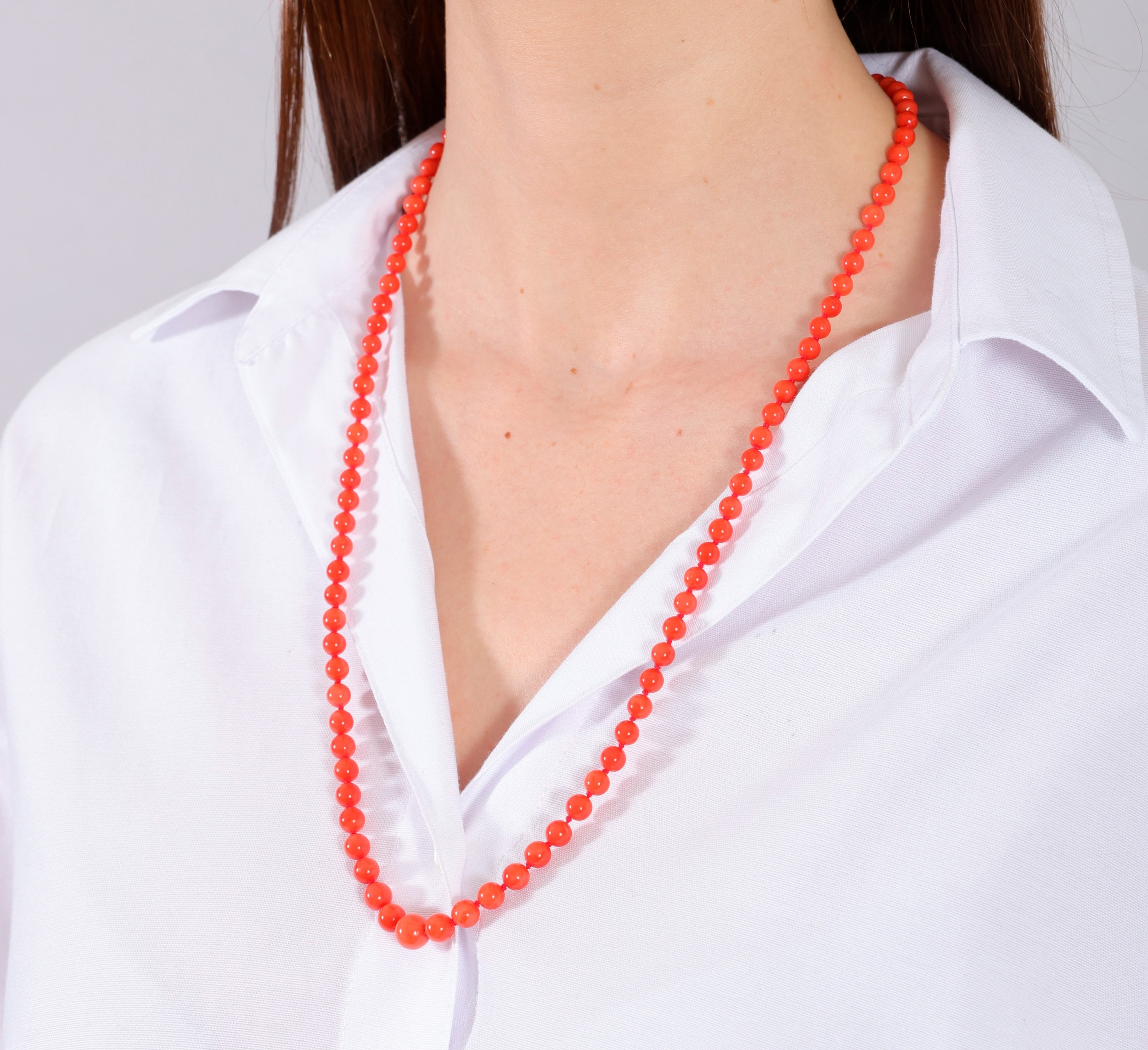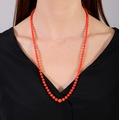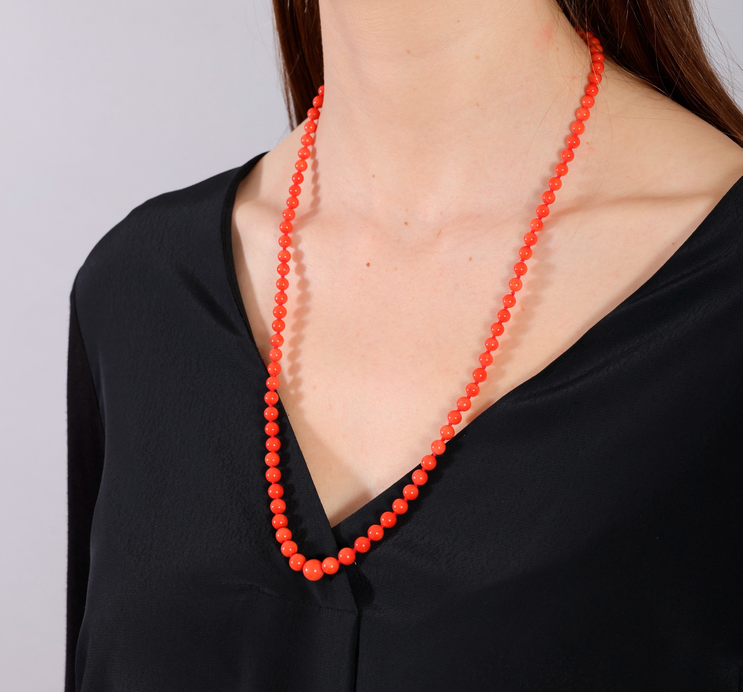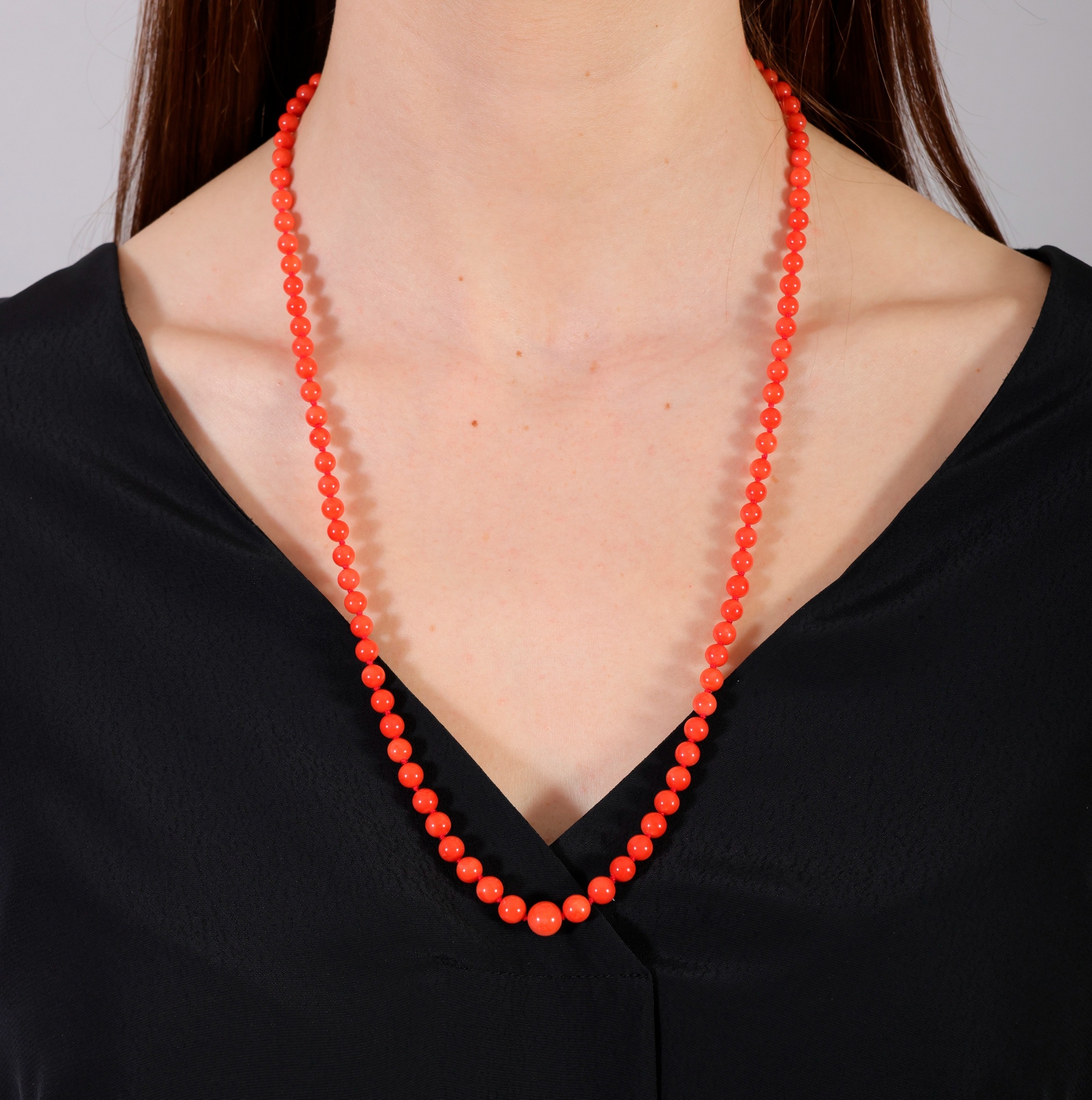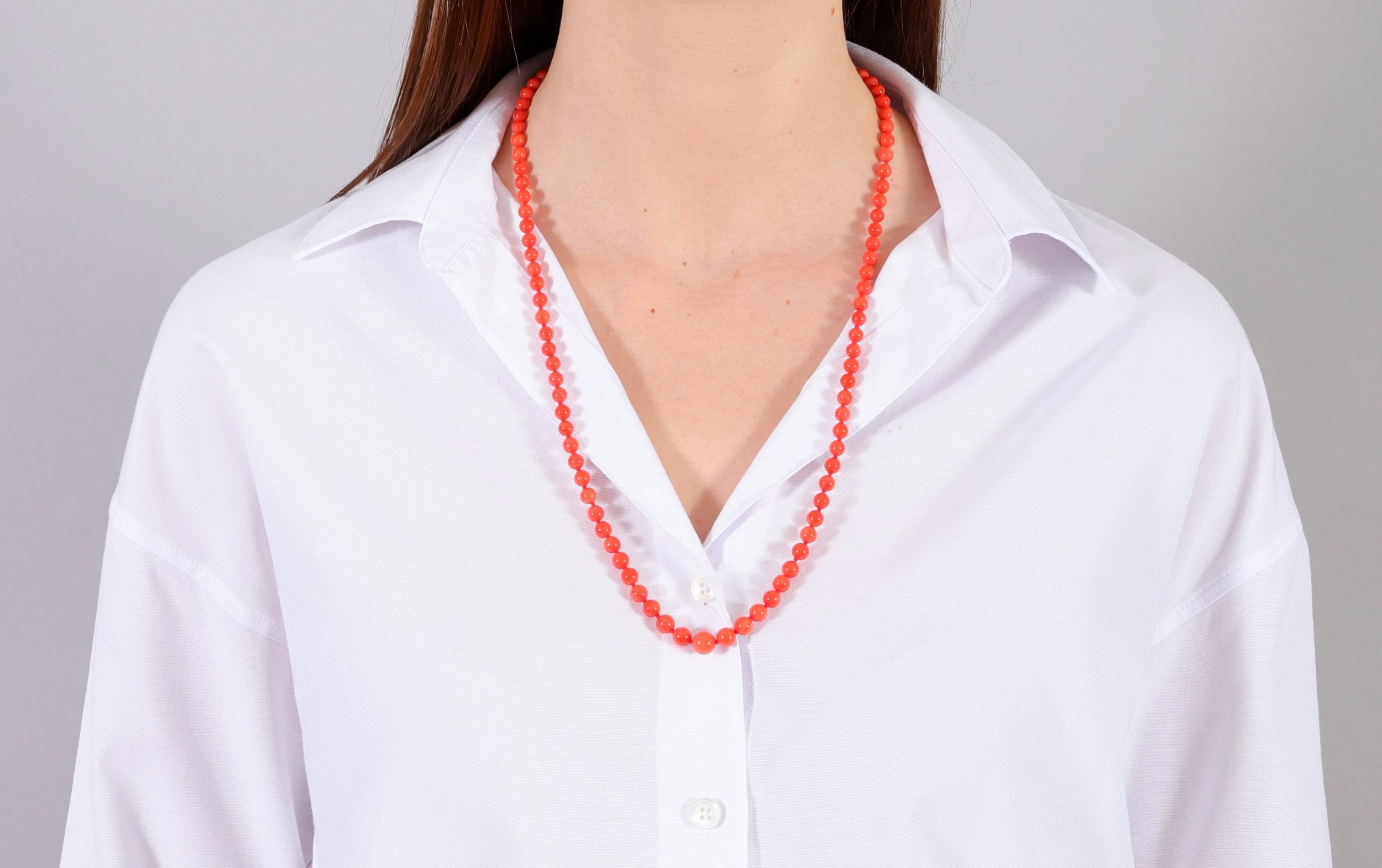 A CORAL BEAD NECKLACE The single strand set with graduated coral beads, measuring from 5.6 to 8.8mm, to an oval-shaped clasp of reeded design, clasp in 18K gold, length 68cm *Prospective buyers are advised that several countries prohibit the importation of items containing materials from endangered species, such as coral. Therefore, buyers should familiarise themselves with relevant customs regulations before bidding if they plan to import this lot into another country.