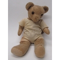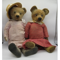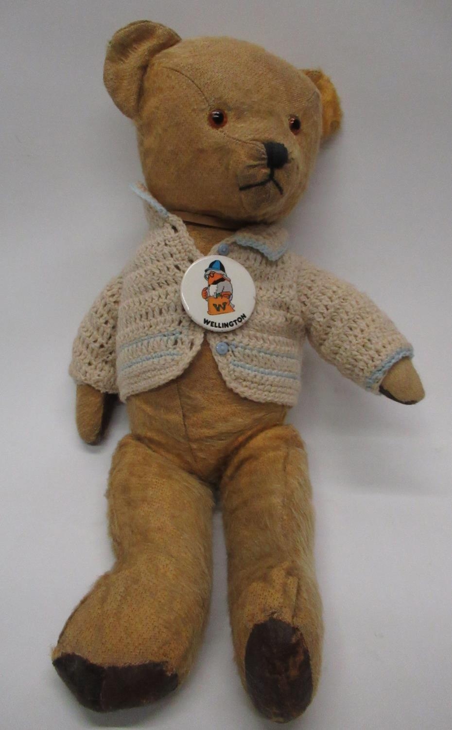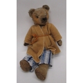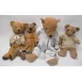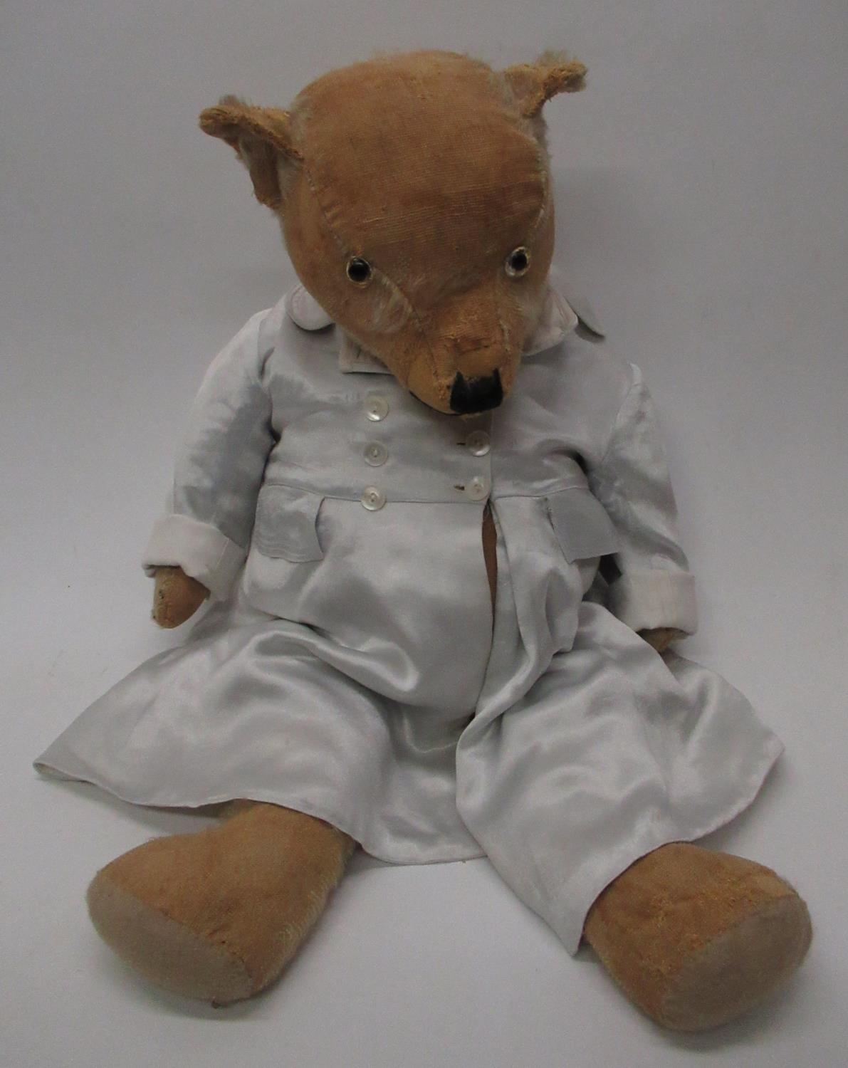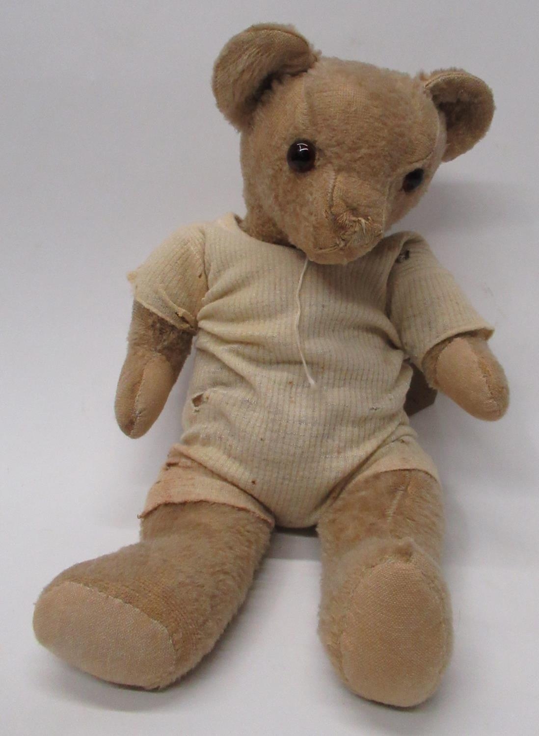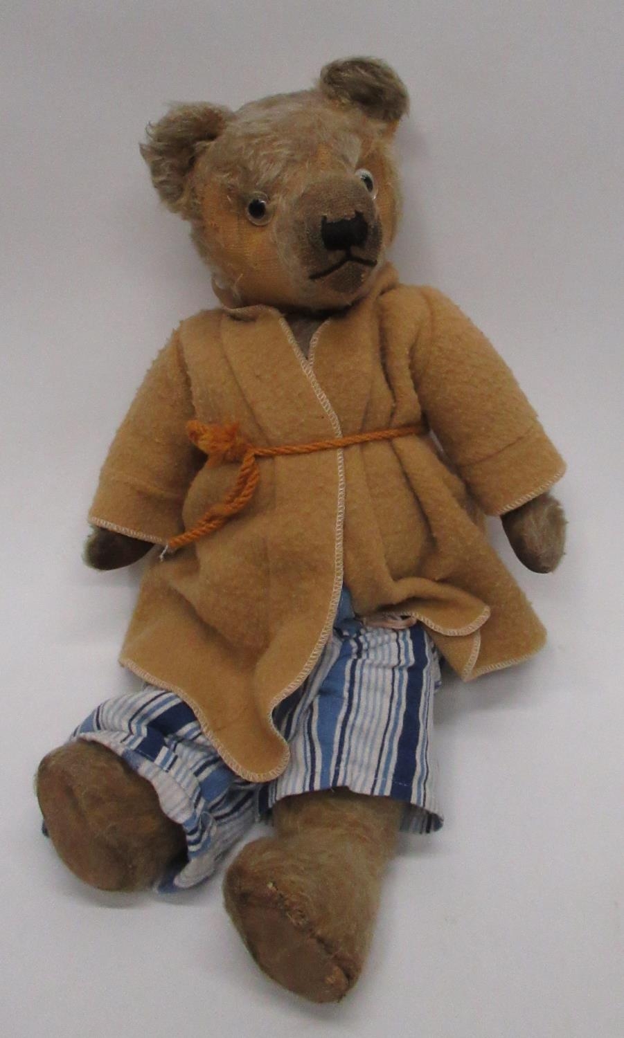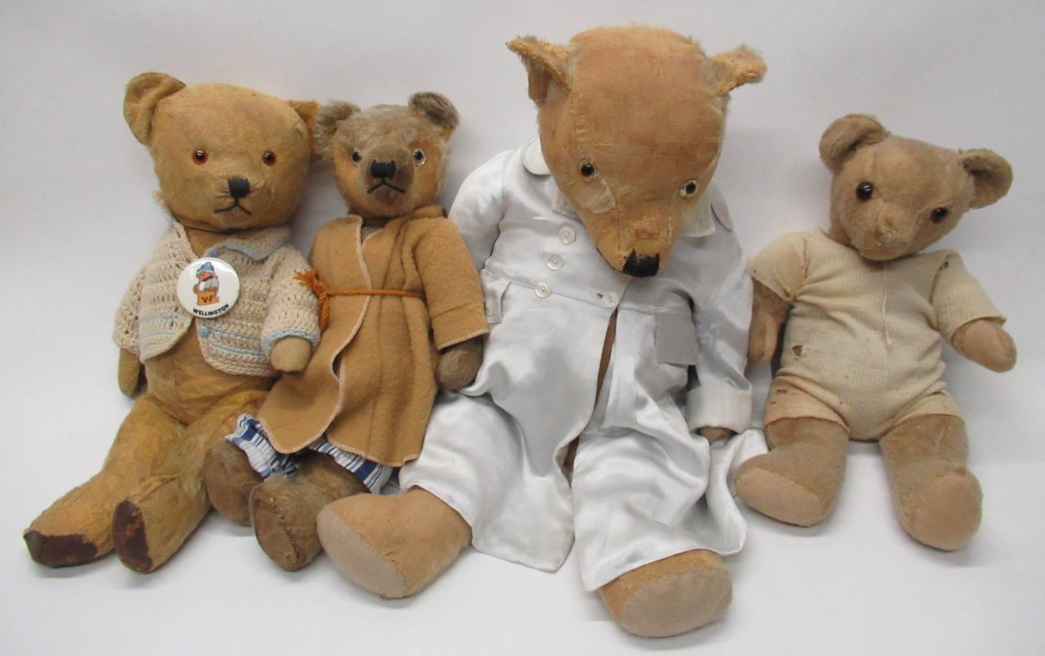 Collection of c. 1930/50's teddy bears: large Chiltern teddy bear with clear glass eyes, jointed arms and legs, stitched nose and mouth, wearing children's 1930's coat H66cm, c. 1940/50's Invicta teddy bear with original glass eyes, nose and mouth, replacement pads, wearing cream outfit, H45.5cm, Joy Toy's teddy bear with clear glass eyes, jointed arms and legs, stitched nose and mouth and card lined feet, wearing pair of vintage pyjamas and dressing gown, H48cm, another c. 1950's English teddy bear wearing knitted cardigan H48cm (4)