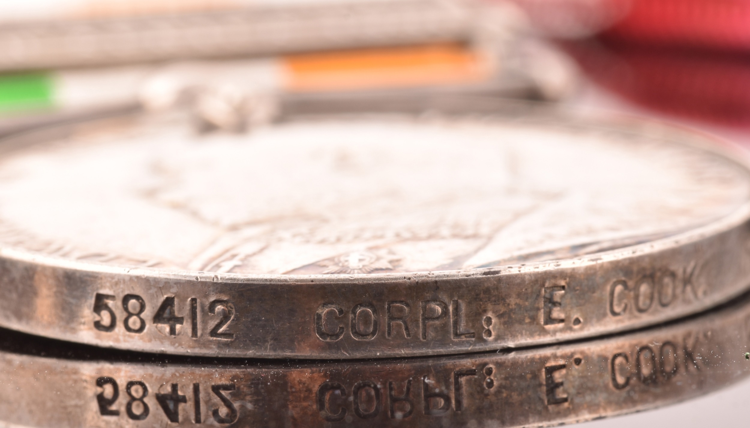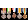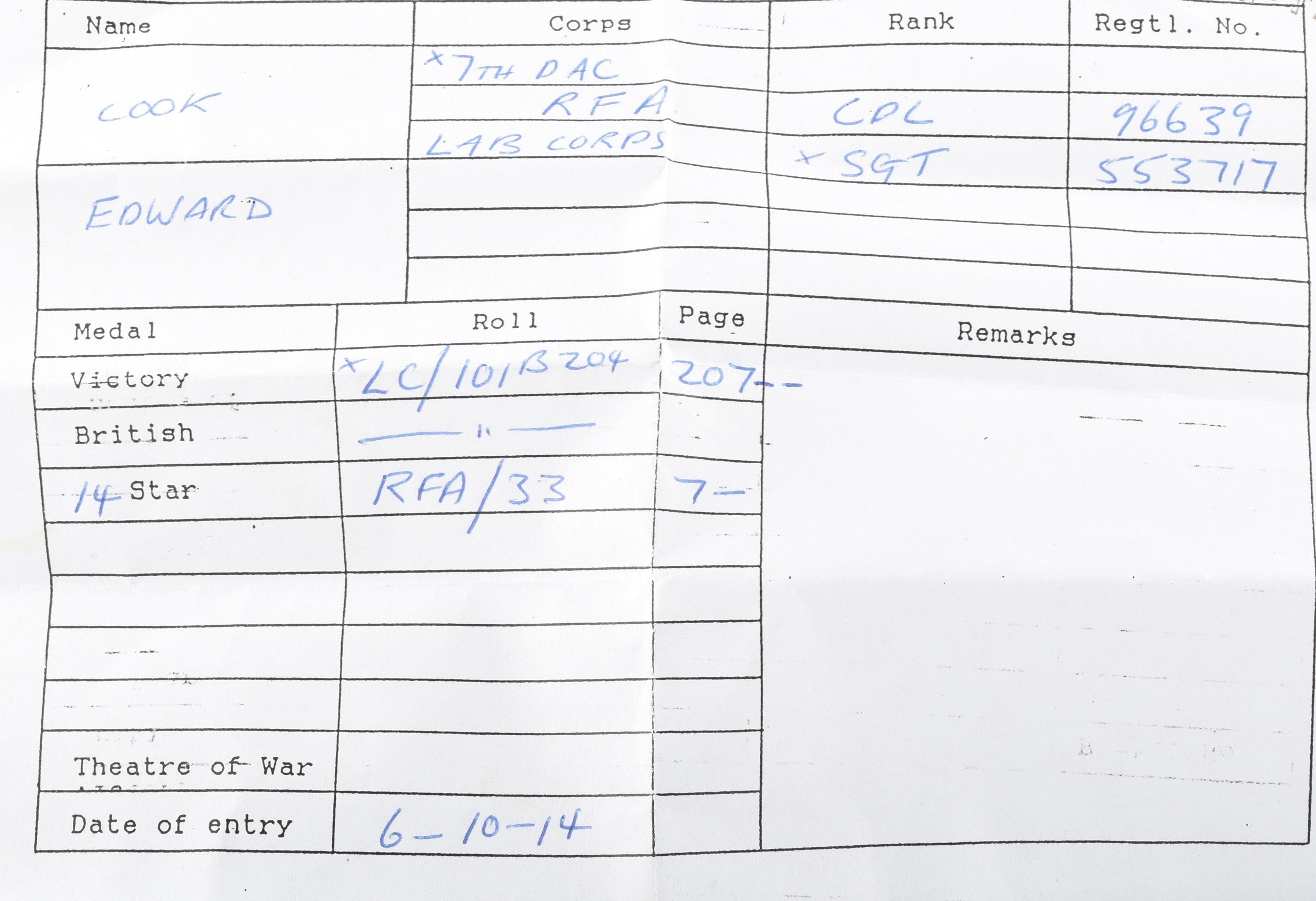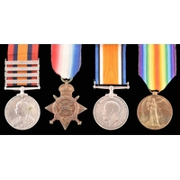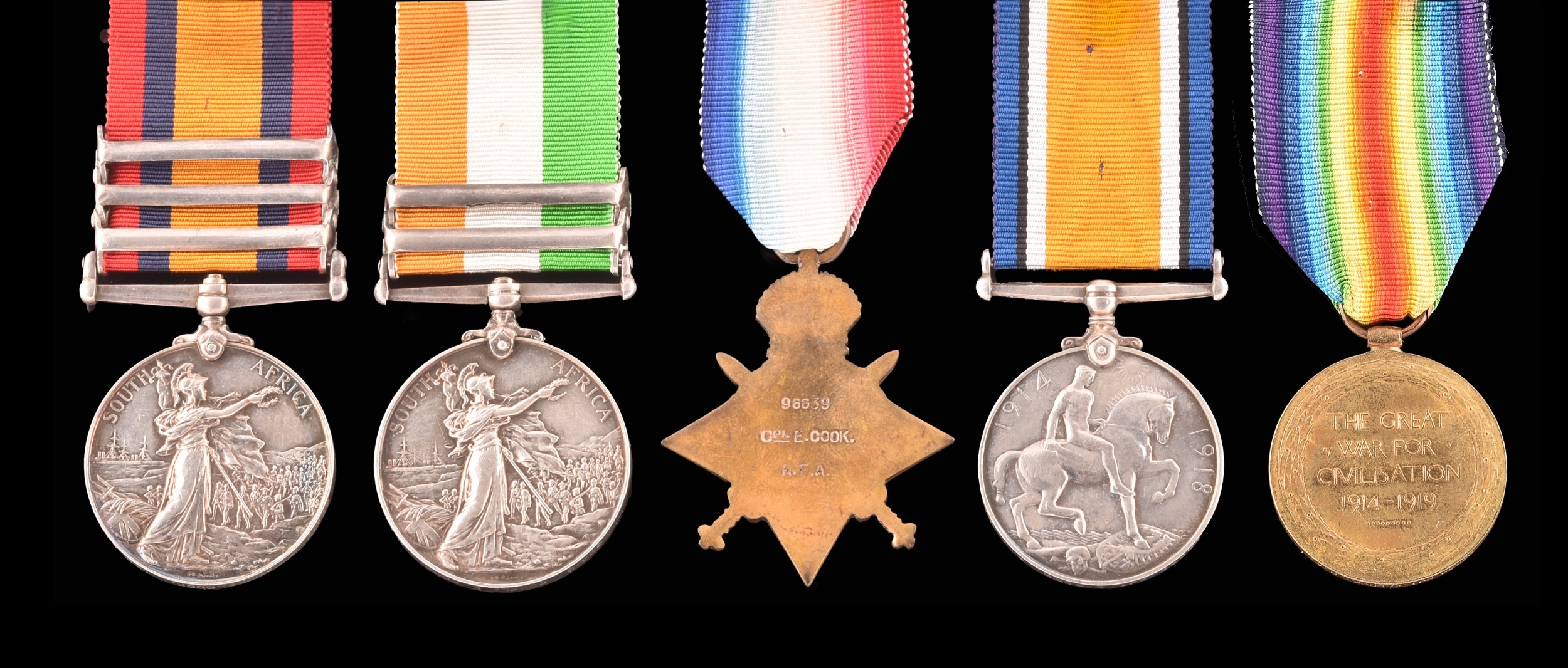 A Boer and Great War five medal group awarded to: Sergeant Edward Cook, Royal Field Artillery. Comprising: a Queen’s South Africa medal with 3 clasps Cape Colony, Orange Free State, Transvaal (58412 Cpl E. Cook 17th Bty R.F.A.); a King's South Africa medal with 2 clasps South Africa 1901 and South Africa 1902 (58412 Corpl E. Cook R.F.A.); a 1914 Mons Star (96639 Cpl. E. Cook R.F.A.); the British War Medal (96639 Sjt. E. Cook R.A.); and the Victory Medal (96639 Sjt. E. Cook R.A.), with medal card.