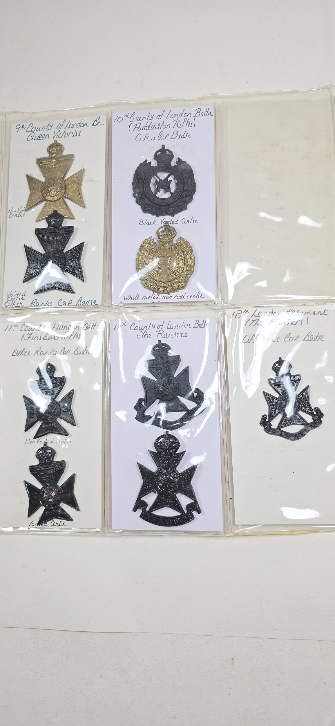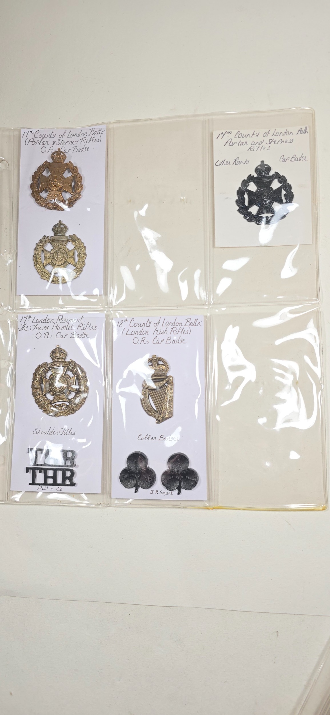 23 restrike cap badges of The London Regiment, including 3 varieties of The 17th Battalion, and 2nd pattern Tower Hamlets Rifles. VGC ex manufacturers stock.