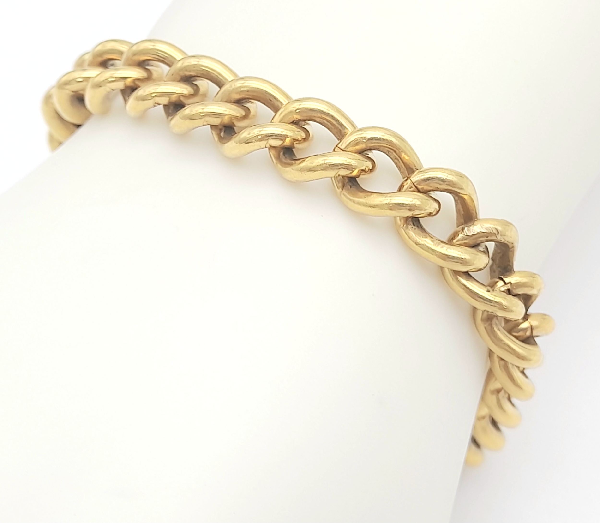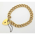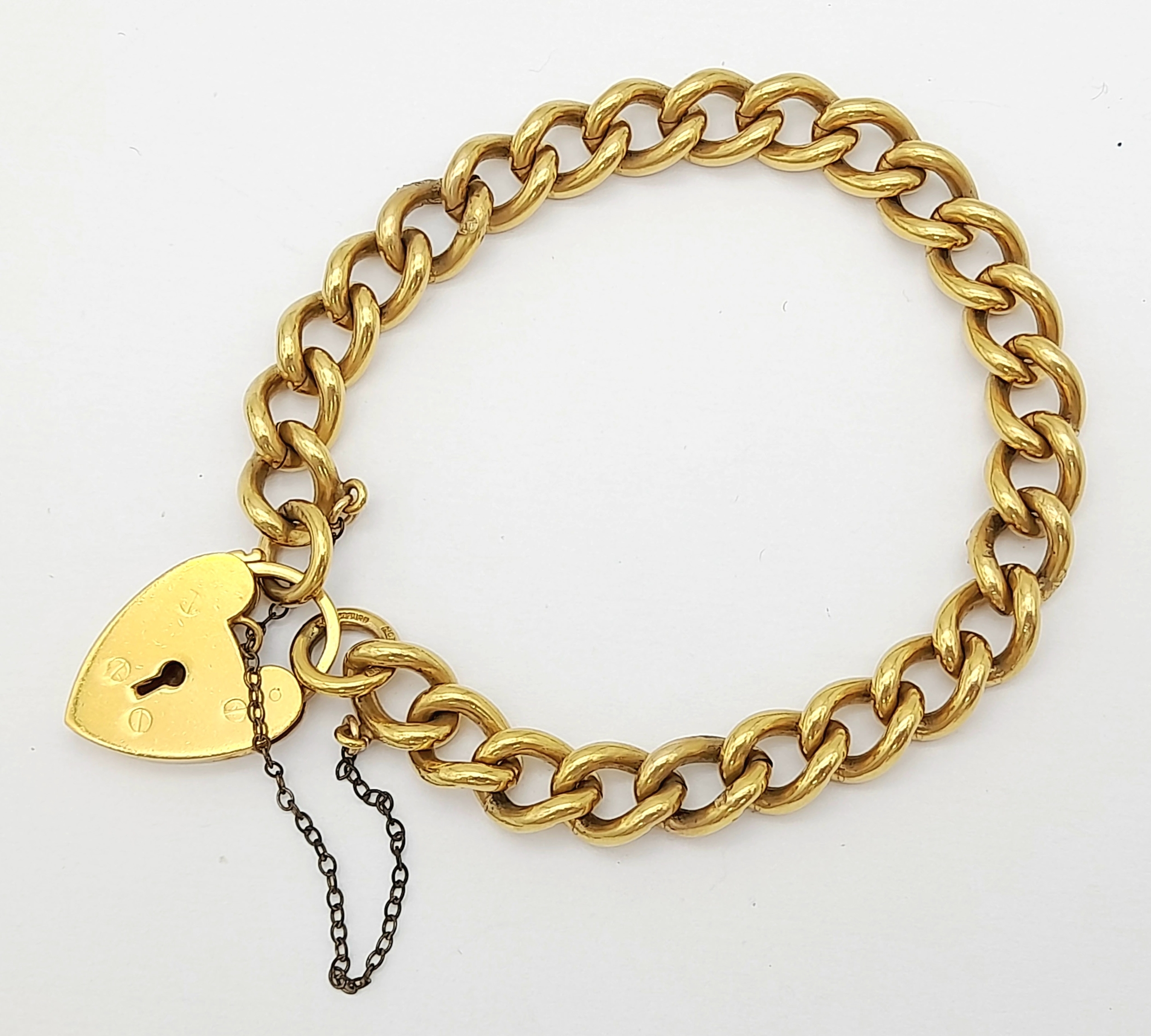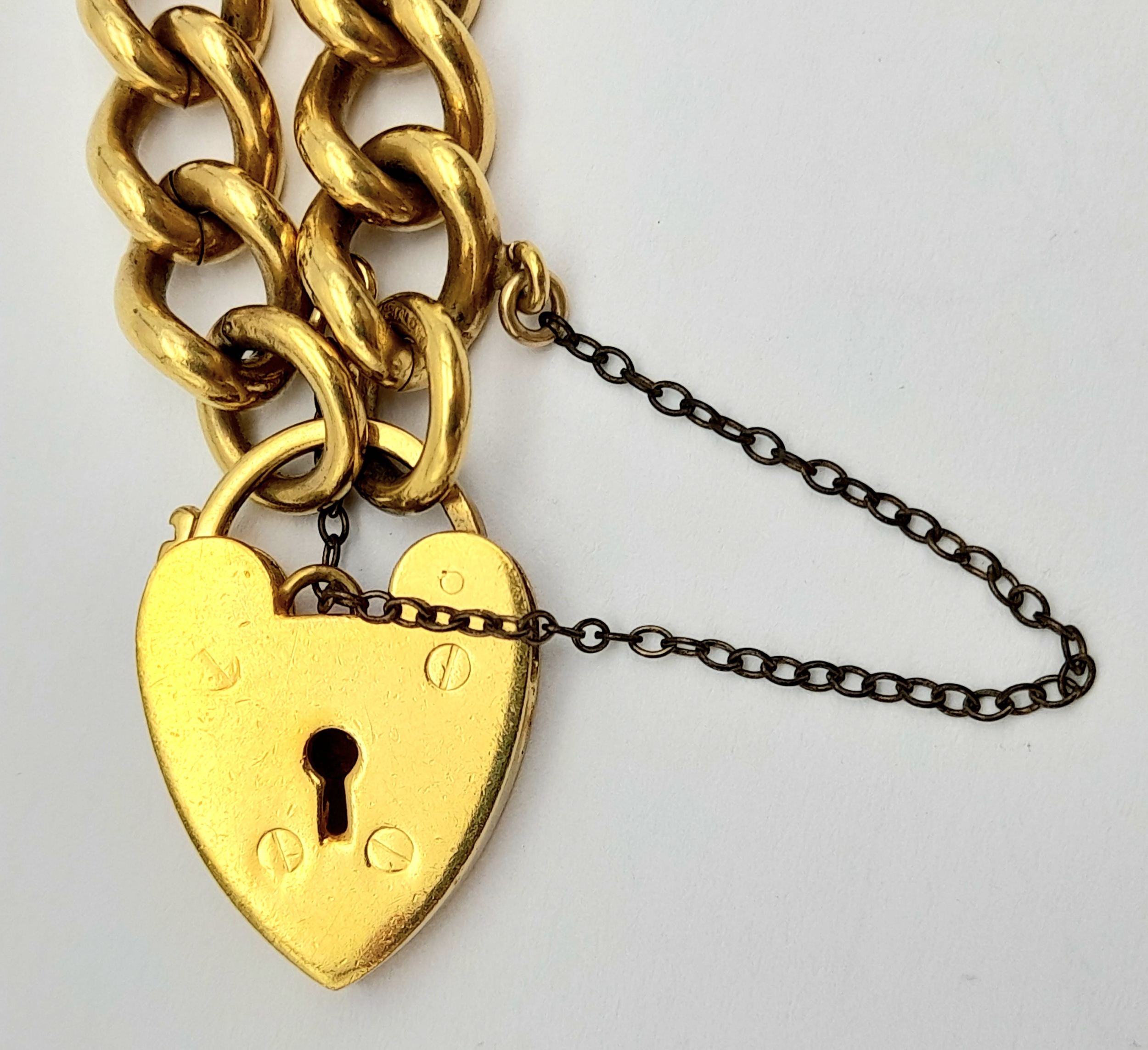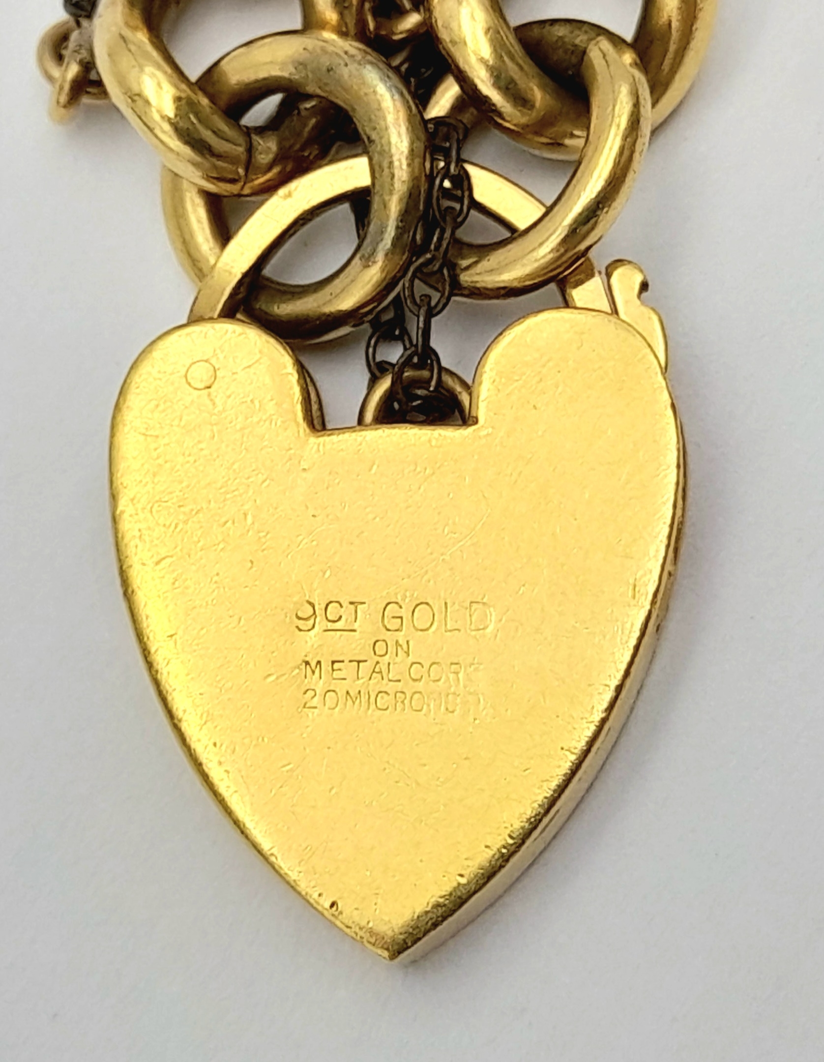 Vintage 9 CARAT GOLD BRACELET with Metal Core. Complete with safety chain. 9 Carat Heart Padlock with metal core. 19.5 cm. 29 grams. Please see pictures.